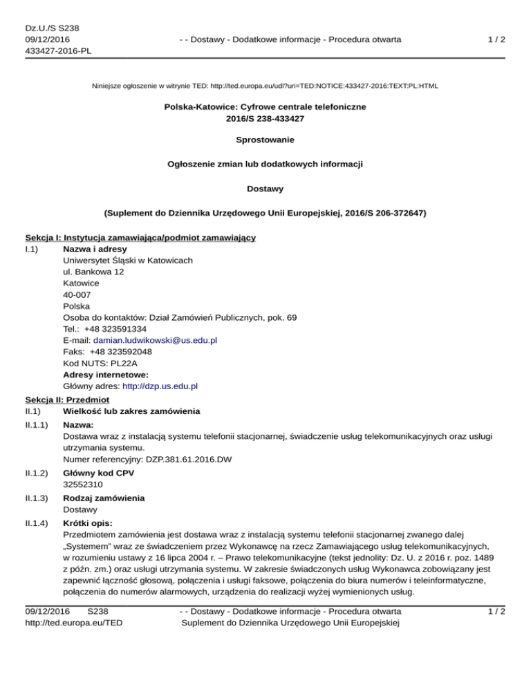 Dz.U./S S238 09/12/2016 433427-2016-PL - - Dostawy - Dodatkowe informacje - Procedura otwarta 1/2 Niniejsze ogłoszenie w witrynie TED: http://ted.europa.eu/udl?uri=TED:NOTICE:433427-2016:TEXT:PL:HTML Polska-Katowice: Cyfrowe centrale telefoniczne 2016/S 238-433427 Sprostowanie Ogłoszenie zmian lub dodatkowych informacji Dostawy (Suplement do Dziennika Urzędowego Unii Europejskiej, 2016/S 206-372647) Sekcja I: Instytucja zamawiająca/podmiot zamawiający I.1) Nazwa i adresy Uniwersytet Śląski w Katowicach ul. Bankowa 12 Katowice 40-007 Polska Osoba do kontaktów: Dział Zamówień Publicznych, pok. 69 Tel.: +48 323591334 E-mail: [email protected] Faks: +48 323592048 Kod NUTS: PL22A Adresy internetowe: Główny adres: http://dzp.us.edu.pl Sekcja II: Przedmiot II.1) Wielkość lub zakres zamówienia II.1.1) Nazwa: Dostawa wraz z instalacją systemu telefonii stacjonarnej, świadczenie usług telekomunikacyjnych oraz usługi utrzymania systemu. Numer referencyjny: DZP.381.61.2016.DW II.1.2) Główny kod CPV 32552310 II.1.3) Rodzaj zamówienia Dostawy II.1.4) Krótki opis: Przedmiotem zamówienia jest dostawa wraz z instalacją systemu telefonii stacjonarnej zwanego dalej „Systemem” wraz ze świadczeniem przez Wykonawcę na rzecz Zamawiającego usług telekomunikacyjnych, w rozumieniu ustawy z 16 lipca 2004 r. – Prawo telekomunikacyjne (tekst jednolity: Dz. U. z 2016 r. poz. 1489 z późn. zm.) oraz usługi utrzymania systemu. W zakresie świadczonych usług Wykonawca zobowiązany jest zapewnić łączność głosową, połączenia i usługi faksowe, połączenia do biura numerów i teleinformatyczne, połączenia do numerów alarmowych, urządzenia do realizacji wyżej wymienionych usług. 09/12/2016 S238 http://ted.europa.eu/TED - - Dostawy - Dodatkowe informacje - Procedura otwarta Suplement do Dziennika Urzędowego Unii Europejskiej 1/2 Dz.U./S S238 09/12/2016 433427-2016-PL - - Dostawy - Dodatkowe informacje - Procedura otwarta 2/2 Sekcja VI: Informacje uzupełniające VI.5) Data wysłania niniejszego ogłoszenia: 07/12/2016 VI.6) Numer pierwotnego ogłoszenia Numer ogłoszenia w Dz.Urz. UE – OJ/S: 2016/S 206-372647 Sekcja VII: Zmiany VII.1) Informacje do zmiany lub dodania VII.1.2) Tekst, który należy poprawić w pierwotnym ogłoszeniu Numer sekcji: IV.2.2 Miejsce, w którym znajduje się tekst do modyfikacji: Termin składania ofert lub wniosków o dopuszczenie do udziału Zamiast: Data: 16/12/2016 Czas lokalny: 9:30 Powinno być: Data: 10/01/2017 Czas lokalny: 9:30 Numer sekcji: IV.2.6 Miejsce, w którym znajduje się tekst do modyfikacji: Minimalny okres, w którym oferent będzie związany ofertą Zamiast: Data: 13/02/2017 Powinno być: Data: 10/03/2017 Numer sekcji: IV.2.7 Miejsce, w którym znajduje się tekst do modyfikacji: Warunki otwarcia ofert Zamiast: Data: 16/12/2016 Czas lokalny: 10:00 Powinno być: Data: 10/01/2017 Czas lokalny: 10:00 VII.2) Inne dodatkowe informacje: 09/12/2016 S238 http://ted.europa.eu/TED - - Dostawy - Dodatkowe informacje - Procedura otwarta Suplement do Dziennika Urzędowego Unii Europejskiej 2/2