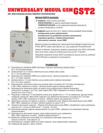 UNIWERSALNY MODU£ GSM do sterowania przez telefon komórkowy GST2 Moduł GST2 posiada 2 wejścia, które można użyć jako: DWUSTANOWE do alarmu (zamknięty/otwarty) TEMPERATUROWE w celu zgłaszania sytuacji awaryjnych, pomiaru temperatury i kontroli 2 wyjścia (każde 3A/250V, AC1), którym można przydzielić różne funkcje: przełączanie przez zadzwonienie przełączanie na podstawie pomiaru temperatury regulacja zgodnie z żądaną temperaturę sterowanie czasowe przez SMS Moduł pozwala na podłączenie i sterowanie termostatami naszej firmy (np. PT59, BPT37 patrz www.elbock.cz), oraz systemem PocketHome®. Istnieje mozliwość dokupienia zasilania awaryjnego (typ ZZ04/900mAh) który przy braku napięcia podtrzymuje prace przez 10 godzin. Wszystkie ustawienia funkcji GST2 prowadzone są przy pomocy softwera GST2-SW (jest w zestawie) na komputerze. FUNKCJE 1) Automatyczne odesłanie SMS informacji o stanach (zamkniety/otwarty) styku (In1/ In2 dwustanowego). 2) Zadzwonienie na 2 numery telefoniczne przy zmianie stanu styku (In 1/ In2 dwustanowy). 3) Automatyczne odesłanie SMS przy przekroczeniu zakresu temperatur na wejściu (In1/ In 2 jako cieplne). 4) Zadzwonienie a 1 numer telefonu przy przekroczeniu zakresu temperatur (In1/ In 2 jako cieplne). 5) Automatyczne zamknięcie styku przy zmianie stanu na wejściu (In1/In2 jako dwustanowe a RE1/RE2 ustawione w funkcji „ Zamknij obwód wyjścia według wejścia“). 6) Automatyczne zamknięcie styku na wyjściu przy przekroczeniu zakresu temperatur mierzonych na wejściu (In1/In2 jako cieplne RE1/RE2 nastawione w funkcji „Zamknij obwód przy Tmin/Tmax“). 7) Regulacja z histerezą 1°C (przekaźnik zwarty przy spadku tem.o 1°C od ustawionej, gdy jest równa następuje rozwarcie). Sterowanie wyjściem wg ustawionej temperatury na wyjściu (In1/In2 jako cieplny a RE1/RE2 nastawione w funkcji „ Zamknij wyjście wg ustawionej T1/T2“). 8) Zamknięcie obwodu na wyjściu w oparciu o nastawiony czas. Wyjście jest aktywowane przez SMS (RE1/RE2 nastawione w funkcji „Zamknij wyjście na czas t1/t2”). 9) Czasowe sterowanie wyjściem. Wyjście jest aktywowane przez SMS z określeniem czasu zamknięcia obwodu (od 1 minuty do 999 minut = 16 godz. 33 min). 10) Sterowanie jednego wyjścia zadzwonieniem na czas t1(RE1 ustawione na zamknięcie obwodu zadzwonieniem). 11) Automatyczne sterowanie obydwu wyjść zadzwonieniem przy nastawieniu (RE1/RE2 ustawione w funkcji „ Zamknij zadzwonieniem“). 12) Możliwość podłączenia termostatu lub centralnych jednostek naszej firmy (więcej na stronie www.elbock.cz). 13) Automatyczne wysłanie SMS przy braku napięcia (przy zastosowaniu zasilacza). 14) Indykacja siły sygnału i stanu modułu. OPIS Antena GSM gniazdo konektor RS232 do RS232 podłączenia pro připojení termostatu termostatu konektor gniazdo mini mini-USB portu USB pro připojení dlaPCPC GSM antenaanténa GSM umieszczenie umístění SIM karty SIM-karty Antena nie może być zasłaniana elementami metalowymi. Przy słabym sygnale można zastosować mocniejszą antenę (nr produktu 1330 GST – antena 9dBm). SIM karta indikace komunikacja komunikace sz PC RS232 SIM USB PWR indikace zasilanie napájení GST2 indikace komunikacja komunikace modułu modulu GSM LINE Gniazdo RS232 RE 1 RE 2 indikace zamknięcie sepnutí obwodu výstupů wyjścia indikace moc síly signálu sygnału PWR +5V In 1 In 2 RE 1 Można używać kartę dowolnego operatora tak na abonament jak i startową. Przed włożeniem karty do modułu przetestować ja w telefonie komórkowym. RE 2 Służy do rozszerzenia funkcji modułu o regulację ogrzewania (termostat Pt59X) lub sterowanie systemem PocketHome® (PH-CJ37 Plus ), blizsze dane na www.elbock.cz. Gniazdo mini USB Do podłączenia modułu i PC. Przewód łączący w zestawie. Programy dla modułu i softwera na załączonej płycie CD. Gniazdo zasilania In2 RE1 RE2 gniazdo konektor zasilania pro napájení 5V/ 2.5A 5V/2.5A (zdroj AD05) (zasil.AD05) diody LED Opis funkcji ŚWIECI - podłączone zasilanie AD05 PWR !Uwaga. Świeci także przy podłączeniu do PC przez mini port USB ale moduł nie może być zasilany przez PC! USB MRUGA - komunikacja z PC MRUGA - przy wpisaniu kodu PIN do chwili GSM aż moduł się dostroi do GSM i zaświeci. max. ŚWIECI - przy odbiorze SMS MRUGA wolno - przy podłączeniu MRUGA szybko - zły kod PIN ŚWIECI trwale - przebieg testu PINU ŚWIECI - zamknięty obwód 1 ŚWIECI - zamknięty obwód 2 ŚWIECI - aktualna moc sygnału MRUGA największa LED - moduł min. nie zaprogramowamy – podłączyć do PC i zaprogramować! MRUGA najnizsa LED - moduł dzwoni LINE RE 1 RE 2 i nie można go wzywać przez ok.40s! Przystosowane do podłączenia zasilacza będącego w zestawie (AD05/5V,2,5A) lub zasilania awaryjnego (nie ma w zestawie). Wejścia zaciski In1 a In2 DWUSTANOWE styki muszą być sterowane bez potencjałowo (nie może być na styku żadne napięcie!) CIEPLNE musi być użyty czujnik tem. CT0X-10k (można dokupić na www.elbock.cz) Wyjścia zaciski RE1 a RE2 EL. TOPENÍ In1 L L N N Wyjścia mogą mieć obciążenie max. 3 A/250 V (AC1). Przy większym obciążeniu stosować stycznik! POSTĘPOWANIE Użytkowanie - moduł nie umieszczać w bliskości dużych elementów metalowych moduł z przeznaczeniem do pomieszczeń chronić przed kradzieżą przy instalacji zalecane mocowanie taśmą samoprzylepna dwustronną Pierwsze podłączenie 1) Umieścić kartę SIM w module jak rys.1. 2) Podłączyć zasilacz AD05, zaświeci się zielona LED- PWR. Go 3 minut dojdzie do aktywacji modułu (mruga czerwona LED od mocy sygnału z powodu nie wpisania kodu PIN). 3) Podpinamy przewód (jest w zestawie) do wolnego portu USB w PC i wkładamy kartę CD do czytnika PC. Pojawi się napis „ Przeprowadź instalację nowego programu“. Należy wybrać instalację dla CD-ROM (omija info o autentyczności produktu i instaluje w Windows XP). Pozostałe parametry pozostawić bez zmian. Zakończy