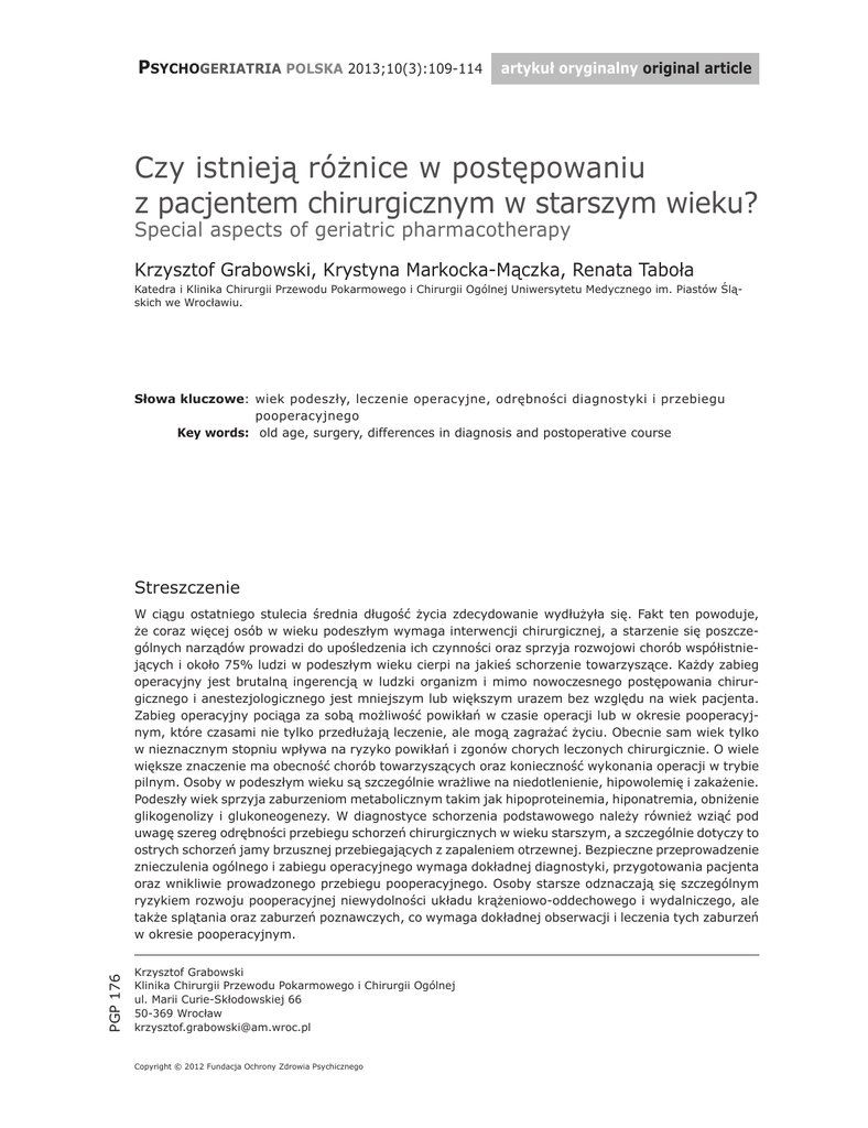 PSYCHOGERIATRIA POLSKA 2013;10(3):109-114 artykuł oryginalny original article Czy istnieją różnice w postępowaniu z pacjentem chirurgicznym w starszym wieku? Special aspects of geriatric pharmacotherapy Krzysztof Grabowski, Krystyna Markocka-Mączka, Renata Taboła Katedra i Klinika Chirurgii Przewodu Pokarmowego i Chirurgii Ogólnej Uniwersytetu Medycznego im. Piastów Śląskich we Wrocławiu. Słowa kluczowe: wiek podeszły, leczenie operacyjne, odrębności diagnostyki i przebiegu pooperacyjnego Key words: old age, surgery, differences in diagnosis and postoperative course Streszczenie PGP 176 W ciągu ostatniego stulecia średnia długość życia zdecydowanie wydłużyła się. Fakt ten powoduje, że coraz więcej osób w wieku podeszłym wymaga interwencji chirurgicznej, a starzenie się poszczególnych narządów prowadzi do upośledzenia ich czynności oraz sprzyja rozwojowi chorób współistniejących i około 75% ludzi w podeszłym wieku cierpi na jakieś schorzenie towarzyszące. Każdy zabieg operacyjny jest brutalną ingerencją w ludzki organizm i mimo nowoczesnego postępowania chirurgicznego i anestezjologicznego jest mniejszym lub większym urazem bez względu na wiek pacjenta. Zabieg operacyjny pociąga za sobą możliwość powikłań w czasie operacji lub w okresie pooperacyjnym, które czasami nie tylko przedłużają leczenie, ale mogą zagrażać życiu. Obecnie sam wiek tylko w nieznacznym stopniu wpływa na ryzyko powikłań i zgonów chorych leczonych chirurgicznie. O wiele większe znaczenie ma obecność chorób towarzyszących oraz konieczność wykonania operacji w trybie pilnym. Osoby w podeszłym wieku są szczególnie wrażliwe na niedotlenienie, hipowolemię i zakażenie. Podeszły wiek sprzyja zaburzeniom metabolicznym takim jak hipoproteinemia, hiponatremia, obniżenie glikogenolizy i glukoneogenezy. W diagnostyce schorzenia podstawowego należy również wziąć pod uwagę szereg odrębności przebiegu schorzeń chirurgicznych w wieku starszym, a szczególnie dotyczy to ostrych schorzeń jamy brzusznej przebiegających z zapaleniem otrzewnej. Bezpieczne przeprowadzenie znieczulenia ogólnego i zabiegu operacyjnego wymaga dokładnej diagnostyki, przygotowania pacjenta oraz wnikliwie prowadzonego przebiegu pooperacyjnego. Osoby starsze odznaczają się szczególnym ryzykiem rozwoju pooperacyjnej niewydolności układu krążeniowo-oddechowego i wydalniczego, ale także splątania oraz zaburzeń poznawczych, co wymaga dokładnej obserwacji i leczenia tych zaburzeń w okresie pooperacyjnym. Krzysztof Grabowski Klinika Chirurgii Przewodu Pokarmowego i Chirurgii Ogólnej ul. Marii Curie-Skłodowskiej 66 50-369 Wrocław [email protected] Copyright © 2012 Fundacja Ochrony Zdrowia Psychicznego 110 Krzysztof Grabowski i wsp. Czy istnieją różnice w post. z pacjentem chirurgicznym w starszym wieku Summary During last century mean life period has extended. The fact has an impact on growing number of surgical interventions in elderly patients. Ageing of particular organs leads to impairment of their function, encourages development of coexisting diseases. About 75% of elderly patients suffer for coexisting diseases. Every surgery is a brutal intervention in human organism nevertheless modern anesthetic and surgical procedures and it is a minor or bigger trauma unrelated to a patient’s age. Surgery carries a possibility of complications during the procedure or in postoperative course, which sometimes not only influences a period of a therapy, but also may have life threatening consequences. Nowadays the age alone impacts a risk of complications and deceases only in an insignificant degree on the risk of postoperative complications and deaths. Presence of concomitant diseases and necessity of an urgent surgery are much more significant. Elderly patients are especially sensitive to hypoxia, hypovolemia and infection. Elderly age encourages metabolic disturbances such as hypoproteinemia, hyponatremia reduction of glicogenolisis and gluconeogenesis. It is important to consider series of individual features considering a course of surgical disease in the elderly age, in particular acute abdominal diseases with concomitant peritonitis in diagnosis of a basic disease. Safe general anesthesia and surgery requires detailed diagnosis, patient’s preparation and careful postoperative attitude. Elderly patients’ surgery particularly tents to carry a risk of postoperative cardio-respiratory and kidney insufficiency. Elderly patients are also likely to develop confusion and cognitive disorders that require careful observation and treatment in postoperative period. Wprowadzenie W ciągu ostatniego stulecia średnia długość życia zdecydowanie wydłużyła się. Fakt ten powoduje, że coraz więcej osób w wieku podeszłym wymaga interwencji chirurgicznej. Za próg starości przyjmujemy aktualnie 65. rok życia i to raczej z przyczyn społecznych i kulturowych, niż biologicznych i medycznych. Trudno jednoznacznie wskazać, kiedy zaczyna się starość wobec wydłużania się średniej życia i kontynuowania przez coraz szersze grono osób w starszym wieku aktywności zawodowej i pozazawodowej. Każdy starzeje się w swoim tempie, zależnym od wyposażenia genetycznego, stylu życia, statusu socjoekonomicznego i stanu zdrowia. Fakt starzenia się niesie ze sobą pewne ograniczenia funkcjonowania, wyczerpują się rezerwy fizjologiczne, coraz trudniej utrzymać homeostazę, zwłaszcza jeśli rozwijają się różne schorzenia przewlekłe. Stan czynnościowy chorego ulega często gwałtownemu pogorszeniu nawet w następstwie banalnej na pozór infekcji lub stresu emocjonalnego. Mówimy o „zespole słabości” czy „kruchości” (ang. frailty syndrome) [1]. Jedną z pierwszych i nadal często używaną definicją zespołu słabości jest określenie wprowadzone przez Lindę Fried. Mówi ono, że jest to: „syndrom fizjologiczny, charakteryzujący się zmniejsz
