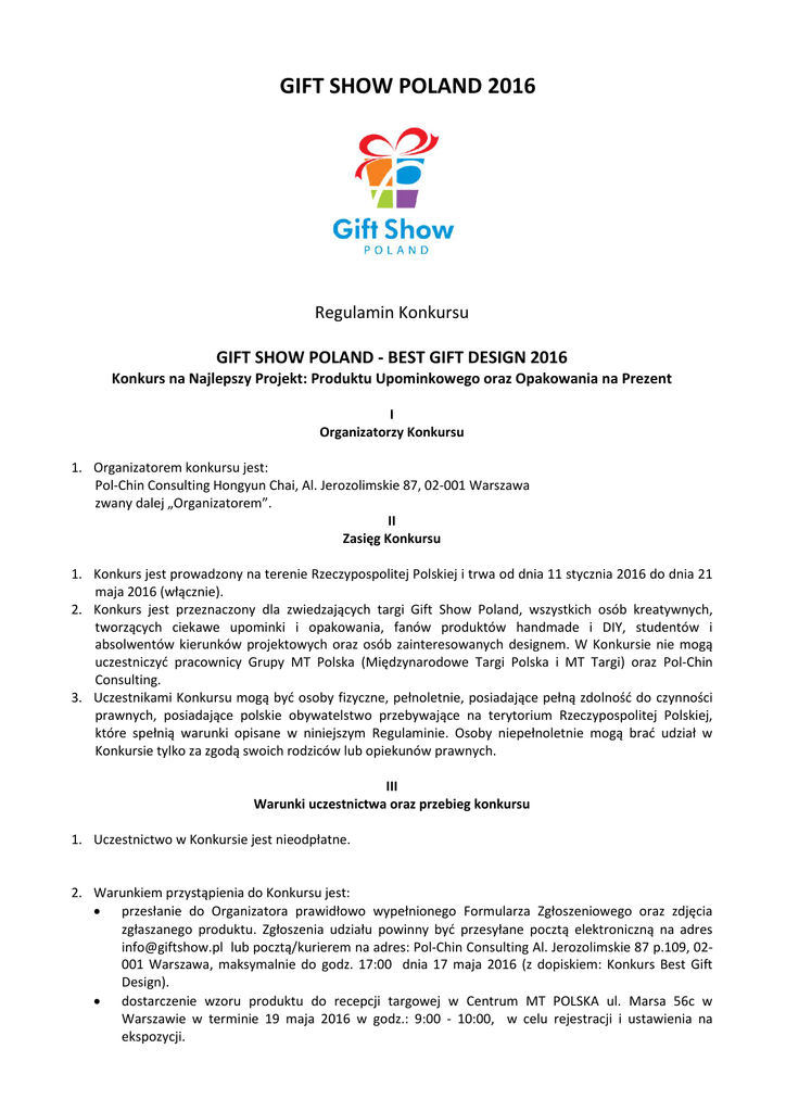 GIFT SHOW POLAND 2016 Regulamin Konkursu GIFT SHOW POLAND - BEST GIFT DESIGN 2016 Konkurs na Najlepszy Projekt: Produktu Upominkowego oraz Opakowania na Prezent I Organizatorzy Konkursu 1. Organizatorem konkursu jest: Pol-Chin Consulting Hongyun Chai, Al. Jerozolimskie 87, 02-001 Warszawa zwany dalej „Organizatorem”. II Zasięg Konkursu 1. Konkurs jest prowadzony na terenie Rzeczypospolitej Polskiej i trwa od dnia 11 stycznia 2016 do dnia 21 maja 2016 (włącznie). 2. Konkurs jest przeznaczony dla zwiedzających targi Gift Show Poland, wszystkich osób kreatywnych, tworzących ciekawe upominki i opakowania, fanów produktów handmade i DIY, studentów i absolwentów kierunków projektowych oraz osób zainteresowanych designem. W Konkursie nie mogą uczestniczyć pracownicy Grupy MT Polska (Międzynarodowe Targi Polska i MT Targi) oraz Pol-Chin Consulting. 3. Uczestnikami Konkursu mogą być osoby fizyczne, pełnoletnie, posiadające pełną zdolność do czynności prawnych, posiadające polskie obywatelstwo przebywające na terytorium Rzeczypospolitej Polskiej, które spełnią warunki opisane w niniejszym Regulaminie. Osoby niepełnoletnie mogą brać udział w Konkursie tylko za zgodą swoich rodziców lub opiekunów prawnych. III Warunki uczestnictwa oraz przebieg konkursu 1. Uczestnictwo w Konkursie jest nieodpłatne. 2. Warunkiem przystąpienia do Konkursu jest: przesłanie do Organizatora prawidłowo wypełnionego Formularza Zgłoszeniowego oraz zdjęcia zgłaszanego produktu. Zgłoszenia udziału powinny być przesyłane pocztą elektroniczną na adres [email protected] lub pocztą/kurierem na adres: Pol-Chin Consulting Al. Jerozolimskie 87 p.109, 02001 Warszawa, maksymalnie do godz. 17:00 dnia 17 maja 2016 (z dopiskiem: Konkurs Best Gift Design). dostarczenie wzoru produktu do recepcji targowej w Centrum MT POLSKA ul. Marsa 56c w Warszawie w terminie 19 maja 2016 w godz.: 9:00 - 10:00, w celu rejestracji i ustawienia na ekspozycji. zgłoszenia można wyłącznie przesyłać na Formularzu Zgłoszeniowym Konkursu, dostępnym na stronie www.giftshow.pl. do Konkursu mogą być zgłaszane tylko produkty, które aktualnie nie są jeszcze dostępne w sprzedaży na rynku. każdy uprawniony do wzięcia udziału w konkursie może zgłosić dowolną liczbę produktów. każdy produkt powinien być zgłoszony na oddzielnym Formularzu Zgłoszeniowym. na zgłoszonych do konkursu wzorach produktów nie może być widoczne logo firmy. zarejestrowanie się jako odwiedzający targi (poprzez stronę internetową www.giftshow.pl lub na miejscu). 3. Do każdego zgłoszenia należy dołączyć: Opis produktu Sam wzór produktu (dostarczenie osobiście 19 maja 2016) kolorowe zdjęcia dobrej jakości obrazujące produkt, bez widocznego logo firmy Poprzez przesłanie każdego zdjęcia Uczestnik Konkursu oświadcza, że przesłane przez niego zdjęcie nie jest chronione prawem osób trzecich i Zgłaszający ponosi za nie pełną odpowiedzialność, jednocześnie wyraża zgodę na publikację ich na stronie www.giftshow.pl , w innych serwisach wydawanych przez Organizatora lub podmioty współpracujące z Organizatorem, podczas trwania targów Gift Show Poland oraz wielokrotnej publikacji w materiałach związanych z targami Gift Show Poland. 4. Zgłaszający wyraża zgodę na wykorzystanie wizerunku zgłaszanego produktu w celach związanych z Konkursem. 5. Wszystkie zgłoszone do Konkursu produkty zostaną opublikowane w specjalnej zakładce konkursowej na stronie targów www.giftshow.pl. 6. Uczestnictwa w Konkursie, jak i praw i obowiązków z nim związanych, w tym także prawa do żądania wydania nagrody, nie można przenosić na osoby trzecie. 7. Organizator nie ponosi odpowiedzialności za produkty nie odebrane osobiście przez Uczestnika z ekspozycji 21 maja 2016 po godz. 14:00 (po ogłoszeniu wyników). IV Jury konkursu 1. Oceny zgłoszony produktów dokona Jury Konkursu, składające sie z ekspertów branżowych oraz przedstawicieli Organizatora. 2. Spośród zgłoszonych produktów Jury wybierze zwycięzców Konkursu Gift Show Poland - Best Gift Design 2016. 3. Organizatorzy zastrzegają sobie prawo zmiany składu Jury. 4. Decyzja Jury jest ostateczna i niepodważalna. V Kryterium oceny 1. Ocena zgłoszeń konkursowych będzie odbywała się wg następujących kryteriów: -oryginalność -szczególne walory estetyczne -innowacyjność - brak dostępności produktu na rynku lub w sprzedaży -dbałość wykonania Warunek konieczny - złożenie formularza konkursowego do godz. 17:00 dnia 17 maja 2016 roku oraz dostarczenie produktu w godz. 9:00 - 10:00 19 maja 2016 roku. VI Nagrody 1. Jury Konkursu przyzna 9 nagród w 2 kategoriach: 1. Najlepszy Projekt Produktu Upominkowego 2. Najlepszy Projekt Opakowania na Prezent I miejsce (1 nagroda dla obu kategorii) - 5000 zł netto w kategorii na najlepszy projekt produktu upominkowego: II miejsce (2 nagrody) - 1000zł netto III miejsce (3 nagrody) - 500 zł netto w kategorii na najlepszy projekt opakowania na prezent: II miejsce (1 nagroda) - 1000zł netto III miejsce (2 nagrody) - 500 zł netto Zapłacenie podatku leży po stronie Organizatora. 2. Jury zastrzega sobie prawo do nieprzyznania nagrody w zależności od poziomu zebranych zgłoszeń. VII Ogłoszenie wyników 1. Ogłoszenie wyników Konkursu nastąpi dnia 21 maja o godz. 14:00 2. Organizator zastrzega sobie prawo do publikowania informacji o zwycięzcach na stronie internetowej www.giftshow.pl, na profilu Gift Show Poland na portalu Facebook oraz w innych publikacjach Organizatora, na co Uczestnicy przystępujący do Konkursu wyrażają zgodę. VIII Zgoda na przetwarzanie danych 1. Akceptacja Regulaminu Konkursu jest równocześnie zgodą na przesyłanie przez Międzynarodowe Targi Polska sp. z o.o. oraz Pol-Chin Consulting informacji handlowych oraz przetwarzanie danych osobowych w celach marketingowych zgodnie z przepisami ustawy z dnia 29 sierpnia 1997 roku o ochronie danych osobowych 