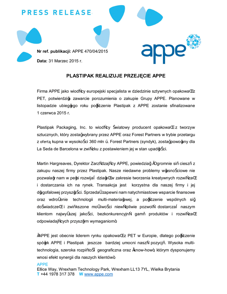Nr ref. publikacji: APPE 470/04/2015 Data: 31 Marzec 2015 r. PLASTIPAK REALIZUJE PRZEJĘCIE APPE Firma APPE jako wiodący europejski specjalista w dziedzinie sztywnych opakowań z PET, potwierdziła zawarcie porozumienia o zakupie Grupy APPE. Planowane w listopadzie ubiegłego roku połączenie Plastipak z APPE zostanie sfinalizowane 1 czerwca 2015 r. Plastipak Packaging, Inc. to wiodący światowy producent opakowań z tworzyw sztucznych, który został wybrany przez APPE oraz Forest Partners w trybie przetargu z ofertą kupna w wysokości 360 mln €. Forest Partners (syndyk), został powołany dla La Seda de Barcelona w związku z postawieniem jej w stan upadłości. Martin Hargreaves, Dyrektor Zarządzający APPE, powiedział: „Ogromnie się cieszę z zakupu naszej firmy przez Plastipak. Nasze niedawne problemy własnościowe nie pozwalały nam w pełni rozwijać działań w zakresie tworzenia kreatywnych rozwiązań i dostarczania ich na rynek. Transakcja jest korzystna dla naszej firmy i jej długofalowej przyszłości. Sprzedaż zapewni nam natychmiastowe wsparcie finansowe oraz wdrożenie technologii multi-materiałowej, a połączenie wspólnych sił, doświadczeń i zwiększone możliwości niewątpliwie pozwolą dostarczać naszym klientom najwyższej jakości, bezkonkurencyjną gamę produktów i rozwiązań odpowiadających przyszłym wymaganiom”. „APPE jest obecnie liderem rynku opakowań z PET w Europie, dlatego połączenie spółek APPE i Plastipak jeszcze bardziej umocni naszą pozycję. Wysoka multitechnologia, szeroka rozpiętość geograficzna oraz „know-how”, którym dysponujemy wnosi efekt synergii dla naszych klientów”. APPE Ellice Way, Wrexham Technology Park, Wrexham LL13 7YL, Wielka Brytania T +44 1978 317 378 W www.appe.com „Jesteśmy przekonani, że ta transakcja zostanie pozytywnie przyjęta przez naszych udziałowców i partnerów”. APPE posiada obecnie dziewięć zakładów produkcyjnych w Europie, Azji i Afryce Północnej, natomiast Plastipak ma 32 zakłady produkcyjne na całym świecie, z których siedem znajduje się w Europie. Koniec Napis pod zdjęciem: O firmie APPE Firma jest liderem rynku w dziedzinie projektowania i produkcji opakowań z PET dla wielu rynków docelowych, m.in. dla rynku żywności i napojów, alkoholi, kosmetyków oraz środków gospodarstwa domowego. Posiadając zakłady produkcyjne w Wielkiej Brytanii, Niemczech, Francji, Hiszpanii, Belgii, Polsce, Maroko i Turcji, APPE może zaoferować klientom obsługę zarówno lokalną jak i ogólnoeuropejską. APPE jest także europejskim liderem w zakresie recyklingu pojemników PET oraz największym producentem wysokiej jakości żywicy rPET dopuszczonej do kontaktu z żywnością. O firmie PLASTIPAK Plastipak Packaging, Inc.,spółka zależna od Plastipak Holdings, Inc., jest światowym liderem w projektowaniu i produkcji najwyższej jakości, sztywnych opakowań dla produktów spożywczych, napojów, środków higieny osobistej oraz środków gospodarstwa domowego. Plastipak posiada ponad 32 zakłady produkcyjne w Stanach Zjednoczonych, Ameryce Południowej i Europie, oraz zatrudnia ponad APPE Ellice Way, Wrexham Technology Park, Wrexham LL13 7YL, Wielka Brytania T +44 1978 317 378 W www.appe.com 4000 pracowników. Klientami firmy są jedne z najbardziej znanych i cenionych marek konsumenckich na świecie. Plastipak jest jedną z najbardziej innowacyjnych firm w branży opakowań, posiadającą ponad 420 patentów amerykańskich dla wzorów opakowań i procesów produkcyjnych. Ponadto Plastipak posiada licencje dla różnych technologii opakowań na całym świecie. Firma Plastipak została założona w 1967 roku i ma swoją siedzibę w Plymouth, w stanie Michigan. Dodatkowe informacje o firmie Plastipak można znaleźć na www.plastipak.com ZAPYTANIA DO REDAKCJI: Jeremy Webster, Marbles PR Ltd Telefon: +44 1939 211115 E-mail: [email protected] www.marblespr.co.uk ZAPYTANIA HANDLOWE/CZYTELNICZE: Kinza Sutton, Marketing Manager - APPE Telefon: +44 1978 317378 E-mail: [email protected] www.appe.com @APPEPackaging APPE Ellice Way, Wrexham Technology Park, Wrexham LL13 7YL, Wielka Brytania T +44 1978 317 378 W www.appe.com