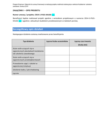 Program Erasmus+ Załączniki do umowy finansowej na realizację projektu mobilności edukacyjnej w sektorze Kształcenie i szkolenia zawodowe. Konkurs 2014 ZAŁĄCZNIK I – OPIS PROJEKTU Numer umowy / projektu: 2014-1-PL01-KA102-…… Beneficjent będzie realizował projekt zgodnie z wnioskiem projektowym o numerze 2014-1-PL01KA102-…… i zgodnie z aktualnym budżetem przedstawionym w tabelach poniżej. Szczegółowy opis działań Następujące działania zostaną zrealizowane przez beneficjenta Typ działania Łączna liczba uczestników Łączny czas trwania (liczba dni) Staże osób uczących się w zagranicznych placówkach kształcenia lub szkolenia zawodowego Staże osób uczących się w zagranicznych przedsiębiorstwach Prowadzenie zajęć / szkoleń w zagranicznej instytucji Szkolenie kadry / job shadowing Łącznie Program Erasmus+ Załączniki do umowy finansowej na realizację projektu mobilności edukacyjnej w sektorze Kształcenie i szkolenia zawodowe. Konkurs 2014 Załącznik II – SZACUNKOWY BUDŻET Numer umowy / projektu: 2014-1-PL01-KA102-…… Podsumowanie budżetu Kategoria budżetu Łączna liczba uczestników Łączna kwota dofinansowania w EUR Wsparcie Organizacyjne Podróż Wsparcie Indywidualne Wsparcie Językowe Wsparcie Uczestników Projektu ze specjalnymi potrzebami Koszty Nadzwyczajne Dofinansowanie obliczone Dofinansowanie przyznane Budżet projektu w rozbiciu na poszczególne kategorie budżetowe Podróż Typ działania Staże osób uczących się w zagranicznych placówkach kształcenia lub szkolenia zawodowego Staże osób uczących się w zagranicznych przedsiębiorstwach Prowadzenie zajęć / szkoleń w zagranicznej instytucji Liczba uczestników Łączna kwota dofinansowania w EUR Program Erasmus+ Załączniki do umowy finansowej na realizację projektu mobilności edukacyjnej w sektorze Kształcenie i szkolenia zawodowe. Konkurs 2014 Szkolenie kadry / job shadowing Łącznie Wsparcie Indywidualne Typ działania Czas trwania (liczba dni) Liczba uczestników Liczba uczestników korzystających z przygotowania językowego Łączna kwota dofinansowania w EUR Łączna kwota dofinansowania w EUR Staże osób uczących się w zagranicznych placówkach kształcenia lub szkolenia zawodowego Staże osób uczących się w zagranicznych przedsiębiorstwach Prowadzenie zajęć / szkoleń w zagranicznej instytucji Szkolenie kadry / job shadowing Łącznie Wsparcie Językowe Grupa językowa Grupa 1 (DE, EN, ES, FR, IT) Grupa 2 (inne oficjalne języki EU nie uwzględnione w grupie 1) Łącznie Wsparcie Uczestników Projektu ze Specjalnymi Potrzebami Typ działania Staże osób uczących się w zagranicznych placówkach kształcenia lub szkolenia zawodowego Liczba uczestników Łączna kwota dofinansowania w EUR Program Erasmus+ Załączniki do umowy finansowej na realizację projektu mobilności edukacyjnej w sektorze Kształcenie i szkolenia zawodowe. Konkurs 2014 Staże osób uczących się w zagranicznych przedsiębiorstwach Prowadzenie zajęć / szkoleń w zagranicznej instytucji Szkolenie kadry / job shadowing Łącznie Koszty Nadzwyczajne Typ działania Staże osób uczących się w zagranicznych placówkach kształcenia lub szkolenia zawodowego Staże osób uczących się w zagranicznych przedsiębiorstwach Prowadzenie zajęć / szkoleń w zagranicznej instytucji Szkolenie kadry / job shadowing Łącznie Liczba uczestników Łączna kwota dofinansowania w EUR