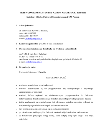 PRZEWODNIK DYDAKTYCZNY NA ROK AKADEMICKI 2011/2012 Katedra i Klinika Chirurgii Stomatologicznej UM Poznań 1. Adres jednostki: ul. Bukowska 70, 60-812 Poznań, nr tel: 061-8547053 nr faxu: 061-8547059 e-mail: [email protected] 2. Kierownik jednostki: prof. UM dr hab. Jerzy Sokalski 3. Osoba odpowiedzialna za dydaktykę na Wydziale Lekarskim I: prof. UM dr hab. Jerzy Sokalski tel. 854 70 16 lub 854 70 77 możliwość kontaktu: od poniedziałku do piątku od godziny 8.00 do 14.00 e-mail: [email protected] 4. Organizacja zajęć: Ćwiczenia kliniczne: 15 godzin REGULAMIN ZAJĘĆ seminaria są zajęciami obowiązkowymi studenci zobowiązani są do przygotowania się teoretycznego i aktywnego uczestniczenia w zajęciach studenci, którzy wykazali się niedostatecznym przygotowaniem do ćwiczenia zobowiązani są do zaliczenia danego tematu u asystenta prowadzącego dane zajęcia każda nieobecność na zajęciach musi być odrobiona, a student powinien wykazać się znajomością zagadnień omawianych podczas seminariów trzy spóźnienia na zajęcia uznaje się za jedną nieobecność po zakończeniu każdego cyklu ćwiczeń, studenci zdają kolokwium zaliczeniowe do kolokwium przystąpić mogą osoby, które odbyły dany cykl zajęć i nie mają zaległości nie zaliczenie kolokwium w pierwszym terminie zobowiązuje studenta do przystąpienia do kolokwium poprawkowego w terminie dwóch tygodni od zakończenia ćwiczeń student, który nie zdał kolokwium w terminie poprawkowym zdaje w wyznaczonym terminie u Kierownika Katedry. studenci, którzy nie wywiążą się z obowiązków wynikających z regulaminu, nie uzyskają zaliczenia ćwiczeń 5. Program nauczania: Obowiązkowa obecność na wszystkich ćwiczeniach, czynne uczestnictwo w omawianiu zagadnień, zaliczenie kolokwium końcowego 6. Cele i treści merytoryczne przedmiotu: Etiopatogeneza i diagnostyka torbieli, nowotworów łagodnych i złośliwych kości szczęk i tkanek miękkich okolicy głowy i szyi. Diagnostyka, pierwsza pomoc w urazach kości części twarzowej czaszki. Choroby gruczołów ślinowych, nerwów czaszkowych, zatok i stawu skroniowo żuchwowego. Zarys implantologii i zabiegi sterowanej regeneracji tkanek przyzębia. 7. Tematy seminariów: 1. Wady rozwojowe części twarzowej czaszki oraz zębów .Budowa i funkcja układu stomatognatycznego 2. Choroby tkanek twardych zębów oraz przyzębia 3. Zębo– i niezębopochodne zapalenia tkanek miękkich części twarzowej czaszki 4. Zapalenia kości szczęk 5. Zapalenia swoiste jamy ustnej 6. Torbiele tkanek miękkich i kości szczęk 7. Choroby gruczołów ślinowych 8. Urazy zębów 9. Stany przedrakowe 10. Nowotwory tkanek miękkich i kości części twarzowej czaszki 11. Choroby stawu skroniowo-żuchwowego 12. Rehabilitacja protetyczna utraconych zębów. Rehabilitacja po leczeniu chirurgicznym nowotworów 13. Implantologia stomatologiczna 8. Zasady i forma oceny wyników nauczania: Kolokwium zaliczeniowe 9. Literatura obowiązująca: Kryst L. (red.) Chirurgia stomatologiczna: podręcznik dla studentów Stomatologii. PZWL., Warszawa 1981 Bartkowski S. Chirurgia szczękowo-twarzowa. Oficyna Wydawnicza AGES, Kraków 1996, wyd. 3 Hattowska H. Nowotwory jamy ustnej. Sannmedia, Warszawa 1994 Peterson L.J., Eblis E., Hucp J.R., Tucker M.R. Chirurgia stomatologicznai szczękowo-twarzowa. Czelej, Lublin 2001 10. Studenckie koło naukowe: Opiekun koła: dr n. med Patryk Szubert Miejsce spotkań: Katedra Chirurgii Stomatologicznej, ul. Bukowska 70