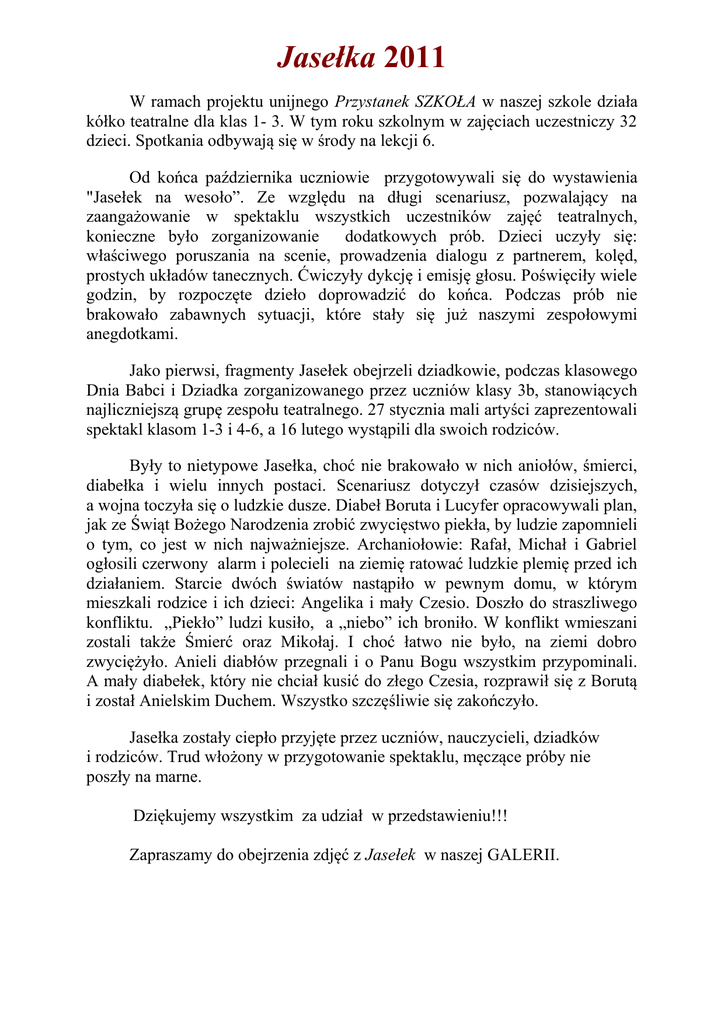 Jasełka 2011 W ramach projektu unijnego Przystanek SZKOŁA w naszej szkole działa kółko teatralne dla klas 1- 3. W tym roku szkolnym w zajęciach uczestniczy 32 dzieci. Spotkania odbywają się w środy na lekcji 6. Od końca października uczniowie przygotowywali się do wystawienia "Jasełek na wesoło”. Ze względu na długi scenariusz, pozwalający na zaangażowanie w spektaklu wszystkich uczestników zajęć teatralnych, konieczne było zorganizowanie dodatkowych prób. Dzieci uczyły się: właściwego poruszania na scenie, prowadzenia dialogu z partnerem, kolęd, prostych układów tanecznych. Ćwiczyły dykcję i emisję głosu. Poświęciły wiele godzin, by rozpoczęte dzieło doprowadzić do końca. Podczas prób nie brakowało zabawnych sytuacji, które stały się już naszymi zespołowymi anegdotkami. Jako pierwsi, fragmenty Jasełek obejrzeli dziadkowie, podczas klasowego Dnia Babci i Dziadka zorganizowanego przez uczniów klasy 3b, stanowiących najliczniejszą grupę zespołu teatralnego. 27 stycznia mali artyści zaprezentowali spektakl klasom 1-3 i 4-6, a 16 lutego wystąpili dla swoich rodziców. Były to nietypowe Jasełka, choć nie brakowało w nich aniołów, śmierci, diabełka i wielu innych postaci. Scenariusz dotyczył czasów dzisiejszych, a wojna toczyła się o ludzkie dusze. Diabeł Boruta i Lucyfer opracowywali plan, jak ze Świąt Bożego Narodzenia zrobić zwycięstwo piekła, by ludzie zapomnieli o tym, co jest w nich najważniejsze. Archaniołowie: Rafał, Michał i Gabriel ogłosili czerwony alarm i polecieli na ziemię ratować ludzkie plemię przed ich działaniem. Starcie dwóch światów nastąpiło w pewnym domu, w którym mieszkali rodzice i ich dzieci: Angelika i mały Czesio. Doszło do straszliwego konfliktu. „Piekło” ludzi kusiło, a „niebo” ich broniło. W konflikt wmieszani zostali także Śmierć oraz Mikołaj. I choć łatwo nie było, na ziemi dobro zwyciężyło. Anieli diabłów przegnali i o Panu Bogu wszystkim przypominali. A mały diabełek, który nie chciał kusić do złego Czesia, rozprawił się z Borutą i został Anielskim Duchem. Wszystko szczęśliwie się zakończyło. Jasełka zostały ciepło przyjęte przez uczniów, nauczycieli, dziadków i rodziców. Trud włożony w przygotowanie spektaklu, męczące próby nie poszły na marne. Dziękujemy wszystkim za udział w przedstawieniu!!! Zapraszamy do obejrzenia zdjęć z Jasełek w naszej GALERII. W bożonarodzeniowym spektaklu wystąpili: Chór diabełków: Martyna Obracaj, Martyna Kozłowska, Martyna Piekarska, Patrycja Golińska, Mateusz Krzemiński, Kacper Paszkiewicz, Wirgiliusz Raszka, Grzegorz Paszek Chór aniołków: Anna Grygierek, Zofia Grygierek, Małgorzata Wawrzyczek, Joanna Brudny, Michalina Biegun, Julia Brożyna, Wiktoria Najda, Julia Wawrzyczek, Witold Grygierek Narrator – komentator: Łukasz Urbanek Mikołaj: Kacper Zych Śmierć: Szymon Chowaniak, Kacper Madecki Mama: Klaudia Brejza Angelika: Katarzyna Bortel Czesio: Paweł Szostek Tata: Janusz Brudny Anioł Dyżurny: Paulina Biegun Archanioł Gabriel: Justyna Płaczek Archanioł Rafał: Angelika Gałyga Archanioł Michał: Dorota Żertka Diabełek: Dominik Tomica Lucyfer: Aleksandra Salamon Diabeł Boruta: Mateusz Szostek Serdecznie dziękuję Rodzicom za przygotowanie strojów i rekwizytów dla swoich pociech, paniom: Iwonie Brejzie i Katarzynie Wawrzyczek za pomoc podczas występu 27stycznia , członkom zespołu teatralnego, którzy regularnie uczestniczyli w zajęciach, dodatkowych próbach i wspaniale odegrali swoje role. Opiekun koła teatralnego - Grażyna Szewczyk