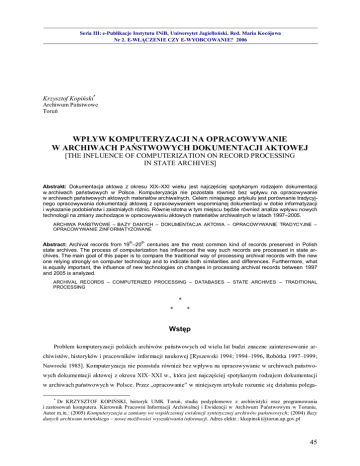 Seria III: e-Publikacje Instytutu INiB, Uniwersytet Jagielloński. Red. Maria Kocójowa Nr 2. E-WŁĄCZENIE CZY E-WYOBCOWANIE? 2006 Krzysztof Kopiński* Archiwum Państwowe Toruń WPŁYW KOMPUTERYZACJI NA OPRACOWYWANIE W ARCHIWACH PAŃSTWOWYCH DOKUMENTACJI AKTOWEJ [THE INFLUENCE OF COMPUTERIZATION ON RECORD PROCESSING IN STATE ARCHIVES] Abstrakt: Dokumentacja aktowa z okresu XIX–XXI wieku jest najczęściej spotykanym rodzajem dokumentacji w archiwach państwowych w Polsce. Komputeryzacja nie pozostała również bez wpływu na opracowywanie w archiwach państwowych aktowych materiałów archiwalnych. Celem niniejszego artykułu jest porównanie tradycyjnego opracowywania dokumentacji aktowej z opracowywaniem wspomnianej dokumentacji w dobie informatyzacji i wykazanie podobieństw i zaistniałych różnic. Równie istotna w tym miejscu będzie również analiza wpływu nowych technologii na zmiany zachodzące w opracowywaniu aktowych materiałów archiwalnych w latach 1997–2005. ARCHIWA PAŃSTWOWE – BAZY DANYCH – DOKUMENTACJA AKTOWA – OPRACOWYWANIE TRADYCYJNE – OPRACOWYWANIE ZINFORMATYZOWANE Abstract: Archival records from 19th–20th centuries are the most common kind of records preserved in Polish state archives. The process of computerization has influenced the way such records are processed in state archives. The main goal of this paper is to compare the traditional way of processing archival records with the new one relying strongly on computer technology and to indicate both similarities and differences. Furthermore, what is equally important, the influence of new technologies on changes in processing archival records between 1997 and 2005 is analyzed. ARCHIVAL RECORDS – COMPUTERIZED PROCESSING – DATABASES – STATE ARCHIVES – TRADITIONAL PROCESSING * * * Wstęp Problem komputeryzacji polskich archiwów państwowych od wielu lat budzi znaczne zainteresowanie archiwistów, historyków i pracowników informacji naukowej [Ryszewski 1994; 1994–1996, Robótka 1997–1999; Nawrocki 1985]. Komputeryzacja nie pozostała również bez wpływu na opracowywanie w archiwach państwowych dokumentacji aktowej z okresu XIX–XXI w., która jest najczęściej spotykanym rodzajem dokumentacji w archiwach państwowych w Polsce. Przez „opracowanie” w niniejszym artykule rozumie się działania polega* Dr KRZYSZTOF KOPIŃSKI, historyk UMK Toruń, studia podyplomowe z archiwistyki oraz programowania i zastosowań komputera. Kierownik Pracowni Informacji Archiwalnej i Ewidencji w Archiwum Państwowym w Toruniu. Autor m.in.: (2005) Komputeryzacja a zamiany we współczesnej ewidencji syntetycznej archiwów państwowych; (2004) Bazy danych archiwum toruńskiego – nowe możliwości wyszukiwania informacji. Adres elektr.: [email protected] 45 Seria III: e-Publikacje Instytutu INiB, Uniwersytet Jagielloński. Red. Maria Kocójowa Nr 2. E-WŁĄCZENIE CZY E-WYOBCOWANIE? 2006 jące na przygotowaniu materiałów archiwalnych zespołu do udostępnienia w zakresie podstawowym, czyli po ich uporządkowaniu i zinwentaryzowaniu [Robótka 2002, s. 74; Robótka, Ryszewski, Tomczak 1989, s. 53]. Celem artykułu jest też porównanie dotychczasowego tradycyjnego opracowywania dokumentacji aktowej z opracowywaniem zinformatyzowanym i wykazanie podobieństw i zaistniałych różnic. Równie istotna w tym miejscu będzie również analiza wpływu nowych technologii na zmiany zachodzące w opracowywaniu dokumentacji aktowej w latach 1997–2005. Tradycyjne opracowywanie dokumentacji aktowej Przygotowanie materiałów archiwalnych zespołu, w tym dokumentacji aktowej, do udostępniania w zakresie podstawowym wiąże się z postępowaniem metodycznym składającym się z kilku etapów: • studia wstępne, które obejmują zarówno badanie dziejów twórcy zespołu, jak i samych materiałów archiwalnych zespołu. Materiałów na ten temat archiwista poszukiwał w publikowanych przepisach prawnych, normatywach znajdujących się w samym zespole oraz w publikacjach naukowych. • wyodrębnienie lub scalenie zespołu, • wybór metody porządkowania i porządkowanie właściwe zespołu. Na to ostatnie składa się m.in. segregacja archiwaliów według serii i systematyzacja archiwaliów w seriach. Innymi ważnymi czynnościami związanymi z opracowaniem są: inwentaryzacja zespołu, czyli przygotowanie opisu na poziomie j.a. oraz sporządzenie wstępu do inwentarza. Wynikiem inwentaryzacji jest pomoc archiwalna nazywana inwentarzem archiwalnym [Robótka 2002, s. 74; Robótka, Ryszewski, Tomczak 1989, s. 53 n.]. Jedną z najczęściej spotykanych form inwentarza archiwalnego jest forma książkowa. Inwentarz książkowy określony przepisami z początku lat sześćdziesiątych minionego stulecia uzupełnionymi pismem okólnym z 1984 r. składał się z następujących części: karty tytułowej, spisu treści, wstępu i załączników do niego, i spisu akt usystematyzowanych w jednostki inwentarzowe [Tarakanowska; Rosowska 2001, nr 131, 183, zob. też inne szczegółowe przepisy metodyczne nr 202, 204 (zarządzenia); nr 178, 184, 190, 194 (pisma okólne)]. Przepisy precyzowały, iż inwentarz należy sporządzać dla każdego zespołu (zbioru) oddzielnie. Inwentarz książkowy należało poprzedzić zwięzłym wstępem zawierającym: dzieje ustrojowe urzędu, względnie dane dotyczące twórcy zbioru, dzieje zespołu (zbioru), charakterystykę archiwalną zespołu (zbioru), charakterystykę zawartości zespołu (zbioru), informacje o zastosowanej metodzie porządkowania i inwentaryzacji, zestawienie bibliografii. Wstęp do inwentarza książkowego nawiązywał więc do tego, co wypracował w latach pięćdziesiątych XX w. Kazimierz Konarski [Konarski 1952], a potwierdzały to chociażby przygotowane w okresie późniejszym przepisy [Tarakanowska; Rosowska 2001, nr 177]. Każdą jednostkę fizyczną zespołu należało opisywać w odrębnej pozycji inwentarzowej. Jednostka fizyczna była więc jednoznac