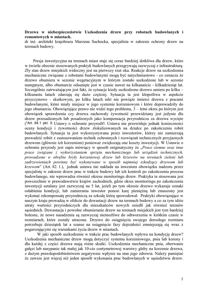 Drzewa w niebezpieczeństwie Uszkodzenia drzew przy robotach budowlanych i remontowych w miastach. dr inż. architekt krajobrazu Marzena Suchocka, specjalista w zakresie ochrony drzew na terenach budowy. Presja inwestycyjna na terenach miast staje się coraz bardziej dotkliwa dla drzew, które w świetle obecnie stosowanych praktyk budowlanych przegrywają zazwyczaj z infrastrukturą. Zły stan drzew miejskich widoczny jest na pierwszy rzut oka. Reakcje drzew na uszkodzenia mechaniczne związane z robotami budowlanymi mogą być natychmiastowe - co oznacza że drzewo obumiera w sezonie wegetacyjnym w którym zostało uszkodzone lub w sezonie następnym, albo obumarcie odsunięte jest w czasie nawet na kilkanaście - kilkadziesiąt lat. Szczególnie zatrważającym jest fakt, że sytuacje kiedy uszkodzone drzewo umiera po kilku – kilkunastu latach zdarzają się dużo częściej. Sytuacja ta jest kłopotliwa w aspekcie przyczynowo - skutkowym, po kilku latach nikt nie powiąże śmierci drzewa z pracami budowlanymi, które miały miejsce w jego systemie korzeniowym i które doprowadziły do jego obumarcia. Obowiązujące prawo nie widzi tego problemu, 3 – letni okres po którym jest obowiązek sprawdzenia czy drzewa zachowały żywotność przewidziany jest jedynie dla drzew przesadzonych lub posadzonych jako kompensacja przyrodnicza za drzewa wycięte (*Art. 84.1 pkt. 5. Ustawy o ochronie przyrody). Ustawa nie przewiduje jednak konieczności oceny kondycji i żywotności drzew zlokalizowanych na działce po zakończeniu robót budowlanych. Sytuacja ta jest wykorzystywana przez inwestorów, którzy nie zamierzają prowadzić robót z zastosowaniem technik ochronnych i rozwiązań technicznych przyjaznych drzewom (głównie ich korzeniom) ponieważ zwiększają one koszty inwestycji. W Ustawie o ochronie przyrody jest zapis mówiący w sposób enigmatyczny że „Prace ziemne oraz inne prace związane z wykorzystaniem sprzętu mechanicznego lub urządzeń technicznych, prowadzone w obrębie bryły korzeniowej drzew lub krzewów na terenach zieleni lub zadrzewieniach powinny być wykonywane w sposób najmniej szkodzący drzewom lub krzewom” (Art. 82. 1.), jednak ustawa nie nakłada na inwestora obowiązku nadzoru przez specjalistę w zakresie drzew prac w trakcie budowy lub ich kontroli po zakończeniu procesu budowlanego, nie wprowadza również okresu monitoringu drzew. Praktyka ta stosowana jest powszechnie w prawodawstwie krajów zachodnich, gdzie okres monitoringu po zakończeniu inwestycji ustalany jest zazwyczaj na 5 lat, jeżeli po tym okresie drzewo wykazuje oznaki osłabienia kondycji, lub zamierania inwestor ponosi karę pieniężną lub zmuszony jest wykonać rekompensatę przyrodniczą za szkodę którą spowodował. Praktyki obowiązujące w naszym kraju prowadzą w efekcie do dewastacji drzew na terenach budowy a co za tym idzie utraty wartości przyrodniczych dla mieszkańców nowych osiedli jak również terenów sąsiednich. Dewastacja i powolne obumieranie drzew na terenach miejskich jest tym bardziej bolesne, że nowe nasadzenia są zazwyczaj niemożliwe do odtworzenia w krótkim czasie w rozmiarach, które zostały utracone. Drzewo do osiągnięcia swojego dorosłego rozmiaru potrzebuje dziesiątek lat a szanse na osiągnięcie fazy dojrzałości zmniejszają się wraz z pogarszającymi się warunkami życia drzew w miastach. W jaki sposób uszkodzenie w trakcie prac budowlanych wpływa na kondycję drzew? Uszkodzenia mechaniczne drzew mogą dotyczyć systemu korzeniowego, pnia lub korony i dla każdej z części drzewa mają różne skutki. Uszkodzenia mechaniczne pnia, oberwanie gałęzi lub nasypanie tak małej jak 10-cio centymetrowej warstwy gleby na korzenie drzewa, z dużym prawdopodobieństwem negatywnie wpłynie na stan jego zdrowia. Należy pamiętać że zawsze jest więcej niż jeden sposób wykonania prac budowlanych w sąsiedztwie drzew. 1 Znajomość specyfiki drzew umożliwia wybór mniej szkodliwego rozwiązania, często również tańszego. Uszkodzenie korzeni Najczęściej uszkadzaną częścią drzewa, zazwyczaj w sposób nieświadomy, są korzenie. Uszkodzenia nie są widoczne i trudno jest je kontrolować a wiele z nich powstaje w sposób nieświadomy. Badania mówią, że każde uszkodzenie korzeni jest groźne dla kondycji drzewa a usunięcie lub uszkodzenie powyżej 45% systemu korzeniowego spowoduje nie tylko zachwianie statyki ale również śmierć drzewa natychmiastową lub odsunięta w czasie nawet na lata. Żeby właściwie określić zasięg systemu korzeniowego w praktyce należy pamiętać, że ok. 80% korzeni zlokalizowane jest w wierzchniej warstwie gleby do głębokości 60 cm i mogą rozciągać się na odległość dwa lub trzy razy większą niż średnica korony. Jeżeli powierzchnia terenu nie jest przykryta nawierzchnią nieprzepuszczalną duża ilość korzeni koncentruje się jednak na linii rzutu korony, aby tam pobierać wodę skapującą z liści, strefa ta powinna być szczególnie chroniona. Poza wodą z solami mineralnymi do rozwoju korzenie potrzebują również powietrza, dlatego ubicie gleby jest jednym z głównych morderców korzeni a w konsekwencji drzew. W warunkach miejskich nieprawdziwym również jest założenie, że drzewa wykształcają system korzeniowy zawsze symetrycznie – w mieście korzenie rosną tam gdzie znajdują warunki do życia a więc glebę do rozwoju zasobną w tlen, wodę i jest to zazwyczaj kształt nieregularny. Jak fakty o których wspomniano powyżej można wykorzystać w ochronie drzew w trakcie robót budowlanych? Najważniejszą zasadą jest niedopuszczenie do przesuszenia korzeni, zarówno przy pracach rozbiórkowych (Fot. 1), jak również w trakcie wykonywania wykopów pod instalacje lub fundamenty. Przesuszenie powoduje natychmiastową śmierć korzeni żywicielskich co powiększa znacznie strefę uszkodzeń spowodowanych przez mechaniczne obcięcie korzeni. W wypadku koni