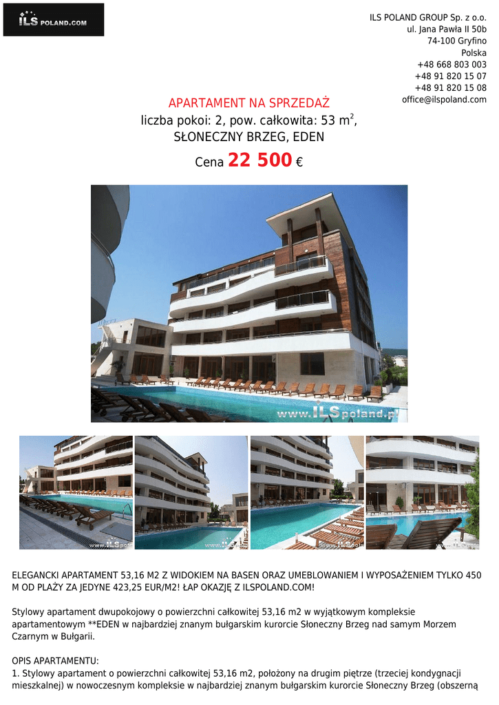 APARTAMENT NA SPRZEDAŻ liczba pokoi: 2, pow. całkowita: 53 m2, SŁONECZNY BRZEG, EDEN Cena 22 ILS POLAND GROUP Sp. z o.o. ul. Jana Pawła II 50b 74-100 Gryfino Polska +48 668 803 003 +48 91 820 15 07 +48 91 820 15 08 [email protected] 500 € ELEGANCKI APARTAMENT 53,16 M2 Z WIDOKIEM NA BASEN ORAZ UMEBLOWANIEM I WYPOSAŻENIEM TYLKO 450 M OD PLAŻY ZA JEDYNE 423,25 EUR/M2! ŁAP OKAZJĘ Z ILSPOLAND.COM! Stylowy apartament dwupokojowy o powierzchni całkowitej 53,16 m2 w wyjątkowym kompleksie apartamentowym **EDEN w najbardziej znanym bułgarskim kurorcie Słoneczny Brzeg nad samym Morzem Czarnym w Bułgarii. OPIS APARTAMENTU: 1. Stylowy apartament o powierzchni całkowitej 53,16 m2, położony na drugim piętrze (trzeciej kondygnacji mieszkalnej) w nowoczesnym kompleksie w najbardziej znanym bułgarskim kurorcie Słoneczny Brzeg (obszerną ILS POLAND GROUP Sp. z o.o. ul. Jana Pawła II 50b 74-100 Gryfino Polska +48 668 803 003 +48 91 820 15 07 +48 91 820 15 08 [email protected] galerię aż 35 fotografii z zewnątrz kompleksu i z wewnątrz apartamentu prezentujemy wyłącznie w naszym firmowym serwisie WWW.ILSPOLAND.COM), 2. Klimatyzowane (klimatyzacja sterowana indywidualnie), przestronne, stylowo urządzone wnętrza salonu i sypialni, łazienki (z prysznicem), a wszystko z domofonem, dostępem do Internetu, aneksem kuchennym i balkonem (z widokiem na basen i sąsiednie budynki), 3. Zaledwie 450 m od plaży i 24 km od międzynarodowego lotniska w mieście w Burgas. UWAGA: Apartament oferowany jest do sprzedania z całkowitym umeblowaniem i wyposażeniem (zgodnie z galerią aż 35 fotografii w naszym firmowym serwisie WWW.ILSPOLAND.COM), a od nowego nabywcy wymaga odświeżenia lub kosmetycznego remontu! OPIS KOMPLEKSU **EDEN: 1. W samym sercu kurortu Słoneczny Brzeg, 300 m od nadmorskiej promenady, zaledwie 10 minut piechotą od głównego deptaku, 450 m od morza; W pobliżu liczne sklepy, tawerny i restauracje oraz centrum rozrywek z pubami i klubami disco. W sąsiedztwie przystanek kolejki chu-chu, kursującej uliczkami kurortu. 2. Basen otwarty (leżaki i parasole przy basenie bezpłatne) i Lobby Bar; restauracja, mini-centrum SPA (opłaty), recepcja, programy animacyjne; dla dzieci, sklep, a sporty wodne oferowane na plaży (opłaty). 3. Windy, przestronny i reprezentacyjny hol recepcyjny, restauracja główna, lobby bar dla gości. Na terenie kompleksu miejsca parkingowe. INFORMACJE PODSTAWOWE O LOKALIZACJI: Słoneczny Brzeg - bułgarski kurort na wybrzeżu Morza Czarnego, około 35 kilometrów na północ od Burgas (gmina Nesebyr). Słoneczny Brzeg to największy i najbardziej popularny kurort Bułgarii, z około 200 hotelami i 120 restauracjami. Jego budowa rozpoczęła się w 1958 roku, w miejscu, gdzie w starożytności i w średniowieczu znajdowały się studnie, zaopatrujące Neseber (staroż. Mesambrię) w wodę. W czasach obecnych największe grupy turystów stanowią Niemcy, Skandynawowie, Brytyjczycy, a także Polacy, Czesi i Słowacy. Miasto jest nazywane Las Vegas Wschodniej Europy. Dyskoteki, kluby, restauracje, parki rozrywki i zespoły hotelowe z basenami oświetlają po zmroku całe wybrzeże. W okolicy znajdują się 2 Aquaparki. Miasto praktycznie połączone jest z Nesebyrem - wjazd do tego miasta od strony Brzegu symbolizuje stary Wiatrak. UWAGA: Oferta indywidualna z rynku wtórnego z ILSPOLAND.COM w bardzo okazyjnej cenie, ponad 15.500 euro taniej od pierwotnej ceny zakupu, gdyż obecny sprzedający kupując to mieszkanie kilka lat temu bezpośrednio od developera zapłacił ponad 38.000 euro plus koszty umeblowania i wyposażenia, a obecnie apartament wystawiony jest do sprzedaży za jedyne 22.500 EUR, czyli tylko za jedyne 423,25 euro/m2! Koszt zarządu i utrzymania wynosi jedyne 8 euro/m2 apartamentu za rok, więc nie zwlekaj, tylko łap wyjątkową okazję, bo może się nie powtórzyć! WAŻNE: Wszystkie nieruchomości prezentowane w ofertach pochodzą bezpośrednio od sprzedających, obejmują wyłącznie pełną własność i są sprawdzone pod względem formalno prawnym oraz są wolne od wad prawnych i praw osób trzecich, a zakup z naszą firmą obejmuje pełną gwarancję bezpieczeństwa w dowolnym kraju z którego prezentujemy daną nieruchomość i obejmuje kompleksową obsługę oraz opiekę polskiego rezydenta firmy ILS POLAND GROUP! ZAINTERESOWANY? DZWOŃ! ILS POLAND GROUP Sp. z o.o. ul. Jana Pawła II 50b 74-100 Gryfino Polska +48 668 803 003 +48 91 820 15 07 +48 91 820 15 08 [email protected] +48 608 363 366, WIĘCEJ INFORMACJI I OFERT? ZOBACZ! WWW.ILSPOLAND.COM UWAGA: Oferta dostępna wyłącznie w banku ofert ILS POLAND GROUP, zaś obszerną galerię aż 35 fotografii i więcej informacji oraz szerszą gamę ofert prezentujemy wyłącznie w naszym firmowym serwisie: WWW.ILSPOLAND.COM Symbol ILS6445 Typ nieruchomości APARTAMENT Rodzaj transakcji SPRZEDAŻ Status AKTUALNA Rodzaj rynku WTÓRNY Cena 94 500 PLN Cena (EUR) 22 500 € Cena (USD) 24 324 $ 1 777,65 PLN Cena za m (euro) 2 423,25 € Cena za m2 (usd) 457,56 $ Cena negocjowana NIE Kraj BUŁGARIA Województwo BURGAS Powiat BURGAS Gmina NESEBYR Miejscowość SŁONECZNY BRZEG Dzielnica - osiedle EDEN Pow. całkowita 53,16 m2 Rodzaj mieszkania APARTAMENT Rodzaj budynku APARTAMENTOWIEC Rok budowy 2008 Standard WYSOKI STANDARD, DO ODŚWIEŻENIA Konstrukcja budynku MUROWANA Rodzaj stropu WYLEWANY Technika budowy KONTRUKCJA SZKIELETOWA Typ kuchni ANEKS KUCHENNY Wyposażenie kuchni PEŁNE Liczba łazienek 1 Stan łazienki DOBRY Wyposażenie łazienki PEŁNE Liczba WC 1 Droga dojazdowa ASFALTOWA Liczba pokoi 2 Liczba sypialni 1 Piętro 2 Liczba pięter 5 Ilość poziomów 1 Umeblowanie PEŁNE Źródło c.w. BOJLER ELEKTRYCZNY, ELEKTR. PRZEPŁYWOWY Cena za m 2 ILS POLAND GROUP Sp. z o.o. ul. Jana Pawła II 50b 74-100 Gryfino Polska +48 668 803 003 +48 91 820 15 07 +48 91 820 15 08 [email protected] Ogrzewanie C.O. ELEKTRYCZNE, NAWIEWOWE Dodatkowe BALKON, BASEN, UMEBLOWANIE, WYPOSAŻENIE RTV I AG