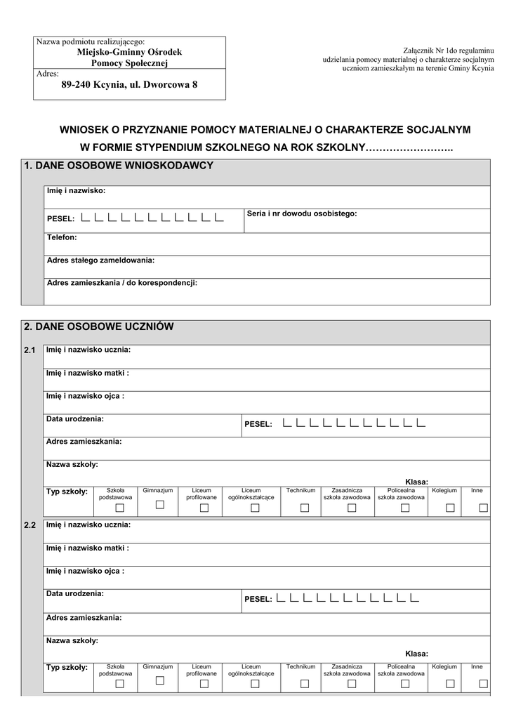 Nazwa podmiotu realizującego: Załącznik Nr 1do regulaminu udzielania pomocy materialnej o charakterze socjalnym uczniom zamieszkałym na terenie Gminy Kcynia Miejsko-Gminny Ośrodek Pomocy Społecznej Adres: 89-240 Kcynia, ul. Dworcowa 8 WNIOSEK O PRZYZNANIE POMOCY MATERIALNEJ O CHARAKTERZE SOCJALNYM W FORMIE STYPENDIUM SZKOLNEGO NA ROK SZKOLNY…………………….. 1. DANE OSOBOWE WNIOSKODAWCY Imię i nazwisko: PESEL: ∟∟∟∟∟∟∟∟∟∟∟ Seria i nr dowodu osobistego: Telefon: Adres stałego zameldowania: Adres zamieszkania / do korespondencji: 2. DANE OSOBOWE UCZNIÓW 2.1 Imię i nazwisko ucznia: Imię i nazwisko matki : Imię i nazwisko ojca : Data urodzenia: PESEL: ∟∟∟∟∟∟∟∟∟∟∟ Adres zamieszkania: Nazwa szkoły: Klasa: Typ szkoły: Szkoła podstawowa □ 2.2 Gimnazjum □ Liceum profilowane □ Liceum ogólnokształcące □ Technikum □ Zasadnicza szkoła zawodowa □ Policealna szkoła zawodowa □ Kolegium □ Inne □ Imię i nazwisko ucznia: Imię i nazwisko matki : Imię i nazwisko ojca : Data urodzenia: PESEL: ∟∟∟∟∟∟∟∟∟∟∟ Adres zamieszkania: Nazwa szkoły: Klasa: Typ szkoły: Szkoła podstawowa □ Gimnazjum □ Liceum profilowane □ Liceum ogólnokształcące □ Technikum □ Zasadnicza szkoła zawodowa □ Policealna szkoła zawodowa □ Kolegium □ Inne □ 2.3 Imię i nazwisko ucznia: Imię i nazwisko matki : Imię i nazwisko ojca : Data urodzenia: PESEL: ∟∟∟∟∟∟∟∟∟∟∟ Adres zamieszkania: Nazwa szkoły: Klasa: Typ szkoły: Szkoła podstawowa □ 2.4 Gimnazjum □ Liceum profilowane □ Liceum ogólnokształcące □ Technikum □ Zasadnicza szkoła zawodowa □ Policealna szkoła zawodowa □ Kolegium □ Inne □ Imię i nazwisko ucznia: Imię i nazwisko matki : Imię i nazwisko ojca : Data urodzenia: PESEL: ∟∟∟∟∟∟∟∟∟∟∟ Adres zamieszkania: Nazwa szkoły: Klasa: Typ szkoły: Szkoła podstawowa □ 2.5 Gimnazjum □ Liceum profilowane □ Liceum ogólnokształcące □ Technikum □ Zasadnicza szkoła zawodowa □ Policealna szkoła zawodowa □ Kolegium □ Inne □ Imię i nazwisko ucznia: Imię i nazwisko matki : Imię i nazwisko ojca : Data urodzenia: PESEL: ∟∟∟∟∟∟∟∟∟∟∟ Adres zamieszkania: Nazwa szkoły: Klasa: Typ szkoły: Szkoła podstawowa □ Gimnazjum □ Liceum profilowane □ Liceum ogólnokształcące □ Technikum □ Zasadnicza szkoła zawodowa □ Policealna szkoła zawodowa □ Kolegium □ Inne □ 2.6 Imię i nazwisko ucznia: Imię i nazwisko matki : Imię i nazwisko ojca : Data urodzenia: PESEL: ∟∟∟∟∟∟∟∟∟∟∟ Adres zamieszkania: Nazwa szkoły: Klasa: Typ szkoły: Szkoła podstawowa □ 2.7 Gimnazjum □ Liceum profilowane □ Liceum ogólnokształcące □ Technikum □ Zasadnicza szkoła zawodowa □ Policealna szkoła zawodowa □ Kolegium □ Inne □ Imię i nazwisko ucznia: Imię i nazwisko matki : Imię i nazwisko ojca : Data urodzenia: PESEL: ∟∟∟∟∟∟∟∟∟∟∟ Adres zamieszkania: Nazwa szkoły: Klasa: Typ szkoły: Szkoła podstawowa □ 2.8 Gimnazjum □ Liceum profilowane □ Liceum ogólnokształcące □ Technikum □ Zasadnicza szkoła zawodowa □ Policealna szkoła zawodowa □ Kolegium □ Inne □ Imię i nazwisko ucznia: Imię i nazwisko matki : Imię i nazwisko ojca : Data urodzenia: PESEL: ∟∟∟∟∟∟∟∟∟∟∟ Adres zamieszkania: Nazwa szkoły: Klasa: Typ szkoły: Szkoła podstawowa □ Gimnazjum □ Liceum profilowane □ Liceum ogólnokształcące □ Technikum □ Zasadnicza szkoła zawodowa □ Policealna szkoła zawodowa □ Kolegium □ Inne □ 3. FORMA ŚWIADCZENIA POMOCY MATERIALNEJ ( świadczenie może być przyznane w jednej lub kilku formach – należy wybrać formę zaznaczając znakiem X ) 3.1 □ Całkowite lub częściowe pokrycie kosztów udziału w zajęciach edukacyjnych w tym wyrównawczych, wykraczających poza zajęcia realizowane w szkole w ramach planu nauczania, a także udziału w zajęciach edukacyjnych realizowanych poza szkołą 3.2 □ □ Pomoc rzeczowa o charakterze edukacyjnym 3.3 Całkowite lub częściowe pokrycie kosztów związanych z pobieraniem nauki poza miejscem zamieszkania 4. DANE UZASADNIAJĄCE ZŁOŻENIE WNIOSKU Uczeń spełnia następujące kryteria ( należy zaznaczyć spełniane kryteria stawiając znak X ) Miesięczna wysokość dochodu na osobę w rodzinie nie przekracza kwoty, o której mowa w art. 8 ust. 1 pkt.2 ustawy z dnia 12 marca 2004 r. o pomocy społecznej ( Dz.U. z 2009 r. Nr 175, poz. 1362 ze zm. W rodzinie występuje bezrobocie, niepełnosprawność, długotrwała lub ciężka choroba, wielodzietność, brak umiejętności wypełniania funkcji opiekuńczo-wychowawczych, alkoholizm, narkomania. Uczeń pochodzi z rodziny niepełnej. W rodzinie wystąpiło zdarzenie losowe Oświadczam, że powyższy wniosek został wypełniony zgodnie z prawdą i że jestem świadomy(a) odpowiedzialności karnej za złożenie fałszywego oświadczenia art. 233 Kodeksu Karnego za zeznanie nieprawdy lub zatajenie prawdy. * ) _____________________________ * ) Art. 233 Kodeksu Karnego „ Kto składając zeznanie mające służyć za dowód w postępowaniu sądowym lub innym postępowaniu prowadzonym na podstawie ustawy, zeznaje nieprawdę lub zataja prawdę, podlega karze pozbawienia wolności do lat 3”. ------------------------------------------------data i podpis osoby składającej oświadczenie Wyrażam zgodę na przetwarzanie danych osobowych zawartych we wniosku dla celów związanych z przyznaniem pomocy materialnej o charakterze socjalnym zgodnie z ustawą z dnia 29 sierpnia 1997 r. o ochronie danych osobowych ( Dz.U z 2002 r. Nr 101, poz. 926 ze zm). -----------------------------------------------------------data i podpis osoby składającej wniosek Załącznik Nr 2 do wniosku o przyznanie pomocy materialnej o charakterze socjalnym w formie stypendium szkolnego INFORMACJA O RODZINIE 1. Imię i nazwisko wnioskod