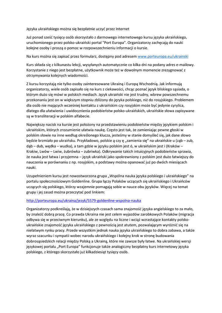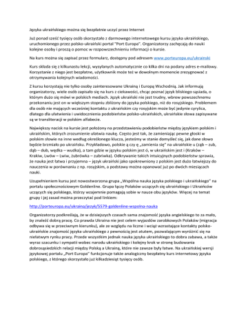 Języka ukraińskiego można się bezpłatnie uczyć przez Internet Już ponad sześć tysięcy osób skorzystało z darmowego internetowego kursu języka ukraińskiego, uruchomionego przez polsko-ukraiński portal "Port Europa". Organizatorzy zachęcają do nauki kolejne osoby i proszą o pomoc w rozpowszechnieniu informacji o kursie. Na kurs można się zapisać przez formularz, dostępny pod adresem www.porteuropa.eu/ukrainski Kurs składa się z kilkunastu lekcji, wysyłanych automatycznie co kilka dni na podany adres e-mailowy. Korzystanie z niego jest bezpłatne, użytkownik może też w dowolnym momencie zrezygnować z otrzymywania kolejnych wiadomości. Z kursu korzystają nie tylko osoby zainteresowane Ukrainą i Europą Wschodnią. Jak informują organizatorzy, wiele osób zapisało się na kurs z ciekawości, chcąc poznać język bliskiego sąsiada, o którym dużo się mówi w polskich mediach. Język ukraiński nie jest trudny, wbrew powszechnemu przekonaniu jest on w większym stopniu zbliżony do języka polskiego, niż do rosyjskiego. Problemem dla osób nie mających wcześniej kontaktu z ukraińskim czy rosyjskim może być jedynie cyrylica, dlatego dla ułatwienia i uwidocznienia podobieństw polsko-ukraińskich, ukraińskie słowa zapisywane są w transliteracji w polskim alfabecie. Największy nacisk na kursie jest położony na przedstawieniu podobieństw między językiem polskim i ukraińskim, których zrozumienie ułatwia naukę. Często jest tak, że zamieniając pewne głoski w polskim słowie na inne według określonego klucza, jesteśmy w stanie domyśleć się, jak dane słowo będzie brzmiało po ukraińsku. Przykładowo, polskie ą czy ę „zamienia się” na ukraińskie u (ząb – zub, dąb – dub, wędka – wudka), a tam gdzie w języku polskim jest ó, w ukraińskim jest i (Kraków – Krakiw, Lwów – Lwiw, żubrówka – zubriwka). Odkrywanie takich intuicyjnych podobieństw sprawia, że nauka jest łatwa i przyjemna – język ukraiński jako spokrewniony z polskim jest dużo łatwiejszy do nauczenia w porównaniu z np. rosyjskim, a podstawy można opanować już po dwóch miesiącach nauki. Uzupełnieniem kursu jest nowostworzona grupa „Wspólna nauka języka polskiego i ukraińskiego” na portalu społecznościowym Goldenline. Grupa łączy Polaków uczących się ukraińskiego i Ukraińców uczących się polskiego, którzy wzajemnie pomagają sobie w nauce obu języków. Więcej na temat grupy i jej zasad można przeczytać pod linkiem: http://porteuropa.eu/ukraina/jezyk/5579-goldenline-wspolna-nauka Organizatorzy podkreślają, że w dzisiejszych czasach sama znajomość języka angielskiego to za mało, by znaleźć dobrą pracę. Co prawda Ukraina nie jest celem wyjazdów zarobkowych Polaków (migracja odbywa się w przeciwnym kierunku), ale ze względu na liczne i wciąż wzrastające kontakty polskoukraińskie znajomość języka ukraińskiego z pewnością jest atutem, pozwalającym wyróżnić się na niełatwym rynku pracy. Przede wszystkim jednak nauka języka ukraińskiego to dobra zabawa, a także wyraz szacunku i sympatii wobec narodu ukraińskiego i kolejny krok w stronę budowania dobrosąsiedzkich relacji między Polską a Ukrainą, które nie zawsze były łatwe. Na ukraińskiej wersji językowej portalu „Port Europa” funkcjonuje także analogiczny bezpłatny kurs internetowy języka polskiego, z którego skorzystało już kilkadziesiąt tysięcy osób.