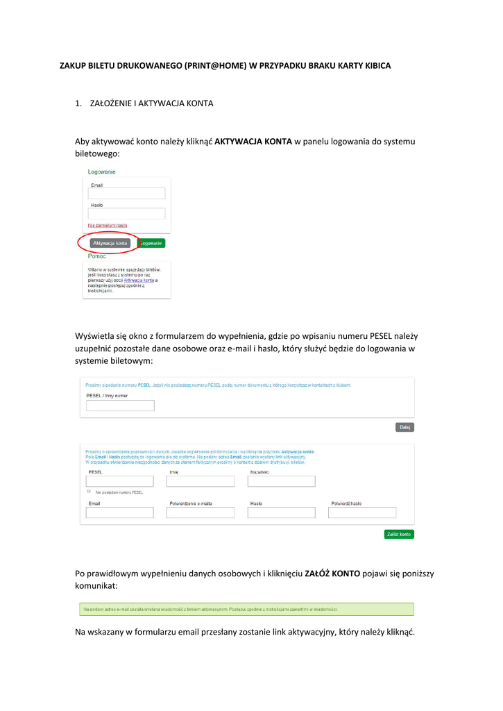 ZAKUP BILETU DRUKOWANEGO (PRINT@HOME) W PRZYPADKU BRAKU KARTY KIBICA 1. ZAŁOŻENIE I AKTYWACJA KONTA Aby aktywować konto należy kliknąć AKTYWACJA KONTA w panelu logowania do systemu biletowego: Wyświetla się okno z formularzem do wypełnienia, gdzie po wpisaniu numeru PESEL należy uzupełnić pozostałe dane osobowe oraz e-mail i hasło, który służyć będzie do logowania w systemie biletowym: Po prawidłowym wypełnieniu danych osobowych i kliknięciu ZAŁÓŻ KONTO pojawi się poniższy komunikat: Na wskazany w formularzu email przesłany zostanie link aktywacyjny, który należy kliknąć. 2. LOGOWANIE DO SYSTEMU I ZAKUP BILETU NA KARTĘ KIBICA Celem zalogowania do systemu biletowego, należy wpisać adres email i hasło, które wpisane zostało do formularza celem aktywacji konta: Po zalogowaniu do systemu biletowego pojawia się okienko z opcją wyboru aktywnych w sprzedaży meczów i karnetów: Należy kliknąć „Przejdź do sekcji biletów na swoim koncie TUTAJ”. I wybrać pole EDYTUJ DANE: . W polu ZDJĘCIE KONTA należy uzupełnić swoje zdjęcie. Ważne: celem poprawnego wykonania zdjęcia należy mieć zainstalowany Adobe Flash ( http://get.adobe.com/pl/flashplayer/ ) oraz zezwolić na użycie kamery internetowej. Zdjęcie można wykadrować przytrzymując przycisk SHIFT na klawiaturze i klikając przyciskiem myszki w miejscu, w którym ma być prawa krawędź zdjęcia. Jeżeli zdjęcie jest wyraźne i odpowiednio zrobione należy je zapisać – ZAPISZ. Po powrocie do ekranu startowego należy przejść do wyboru aktualnych meczów i karnetów w sprzedaży i postępować zgodnie z instrukcją ZAKUPU BILETU NA KARTĘ KIBICA, do punktu PODSUMOWANIA. Gdzie w polu Metoda dostarczenia należy wybrać WYDRUK SAMODZIELNY i potwierdzić swoje dane POTWIERDŹ DANE. Po akceptacji regulaminu sprzedaży należy kliknąć PODSUMOWANIE ZAKUPÓW oraz PŁACĘ gdzie nastąpi przekierowanie do operatora płatności internetowych. Transakcje można sfinalizować poprzez kartę płatniczą lub przelew on-line. Warto pamiętać: - celem aktywacji ulgi dla studentów (do 26 roku życia) na cały aktualny sezon, należy udać się do jednego z punktów dystrybucji biletów i okazać legitymację celem weryfikacji jej ważności, - z jednego loginu można kupić kilka biletów uzupełniając dane w podsumowaniu zakupów dla pozostałych miejsc, - bilet print@home należy drukować na drukarce laserowej w formacie A4 zwracając uwagę czy wszystkie dane są czytelne w tym kod kreskowy umieszczony wzdłuż prawej krawędzi biletu, - wizerunek twarzy na bilecie print@home weryfikowany jest z dokumentem tożsamości przy wejściu na stadion przez służby ochrony