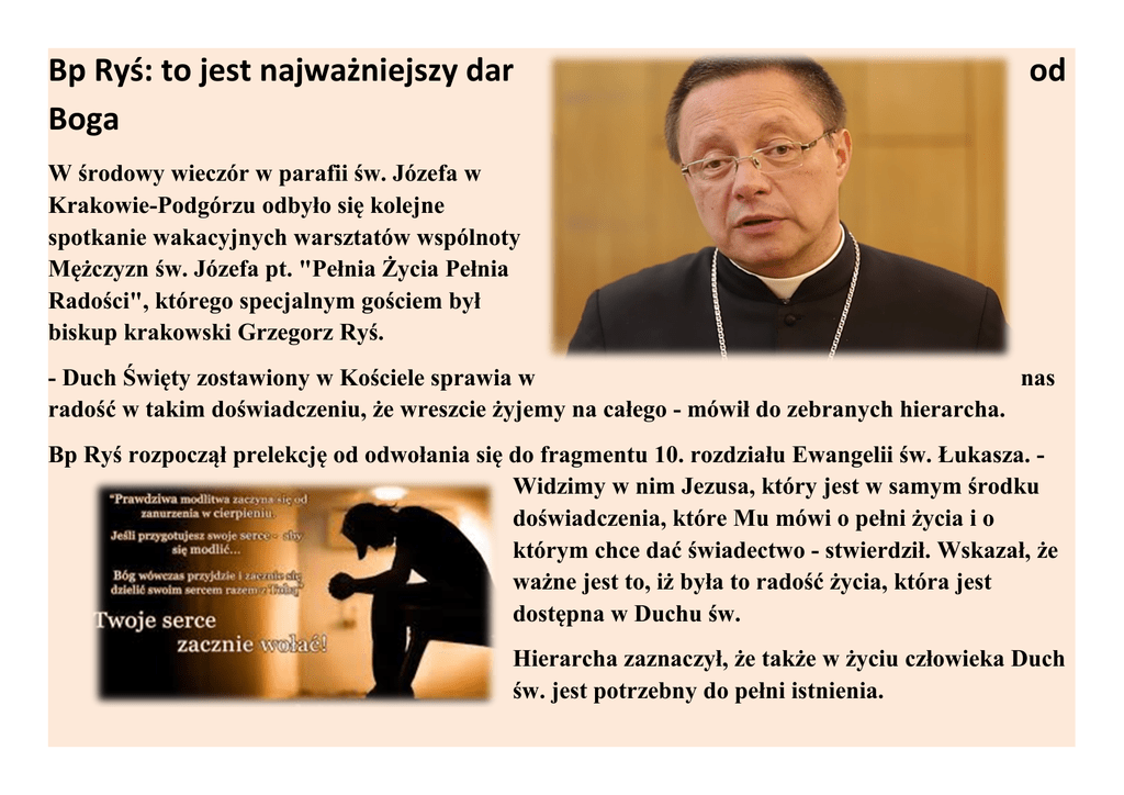 Bp Ryś: to jest najważniejszy dar Boga od W środowy wieczór w parafii św. Józefa w Krakowie-Podgórzu odbyło się kolejne spotkanie wakacyjnych warsztatów wspólnoty Mężczyzn św. Józefa pt. "Pełnia Życia Pełnia Radości", którego specjalnym gościem był biskup krakowski Grzegorz Ryś. - Duch Święty zostawiony w Kościele sprawia w nas radość w takim doświadczeniu, że wreszcie żyjemy na całego - mówił do zebranych hierarcha. Bp Ryś rozpoczął prelekcję od odwołania się do fragmentu 10. rozdziału Ewangelii św. Łukasza. Widzimy w nim Jezusa, który jest w samym środku doświadczenia, które Mu mówi o pełni życia i o którym chce dać świadectwo - stwierdził. Wskazał, że ważne jest to, iż była to radość życia, która jest dostępna w Duchu św. Hierarcha zaznaczył, że także w życiu człowieka Duch św. jest potrzebny do pełni istnienia. - Nie redukujmy spotkania z Bogiem do konkretnych żądań, gdyż najważniejszym darem od Boga jest właśnie Duch św., który jest nam dawany obficie, przeobficie - uwrażliwiał. Dodał, że ten dar może zmienić kompletnie życie. Tłumaczył, że pełnia życia nie zawsze związana jest z natychmiastową zmianą i aktywnością. - Może właśnie nie jest tak, że ta pełnia życia to ma być działanie im szybciej, tym lepiej i od razu wielkie (…) Może jest tak, że potrzebujemy dość długiego czasu, by nas Duch św. przygotował do konkretnego działania - zastanawiał się. Bp Ryś rozważał na czym polega pełnia radości ludzkiego istnienia. Uznał, że najgorsza jest duchowa schizofrenia polegająca na tym, że człowiek z jednej strony jest wierzący, ale jednocześnie się z tym nie utożsamia. - Duch św. uzdalnia do przylgnięcia do całej prawdy Jezusowej. Nie ma takiego kawałka tej prawdy, który czyni nieszczęśliwym - mówił. Wskazał, że Duch św. ukazuje nam także nasze grzechy, gdyż chce doprowadzać nas nieustannie do jedności wewnętrznej. Hierarcha powiedział, że jeszcze jednym elementem kształtowania ludzkiego życia przez Ducha św. jest uświadamianie wiernym, że Bóg jest dla nich realnym ojcem, który w pełni oddaje się człowiekowi. - I to jest pełnia życia - że jest ktoś, kto się w całości oddaje Tobie, ale przez to Ty możesz oddać się jemu - może być to człowiek, ale zawsze będzie to dla Ciebie Bóg - powiedział na zakończenie. Warsztaty "Pełnia Życia Pełnia Radości" to cykl 8-tygodniowych spotkań. Oparte są one na książce Charlesa Whiteheada "Ku pełniejszemu Życiu w Duchu Świętym", a ich celem jest osadzenie w relacji, poznaniu i doświadczeniu Ducha św. w każdym aspekcie życia mężczyzny.