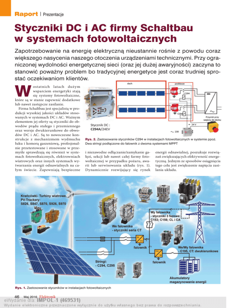 Raport | Prezentacje Styczniki DC i AC firmy Schaltbau w systemach fotowoltaicznych Zapotrzebowanie na energię elektryczną nieustannie rośnie z powodu coraz większego nasycenia naszego otoczenia urządzeniami technicznymi. Przy ograniczonej wydolności energetycznej sieci (oraz jej dużej awaryjności) zaczyna to stanowić poważny problem bo tradycyjnej energetyce jest coraz trudniej sprostać oczekiwaniom klientów. W ostatnich latach dużym wsparciem energetyki stają się systemy fotowoltaiczne, które są w stanie zapewnić dodatkowe lub nawet zastępcze zasilanie. Firma Schaltbau jest specjalistą w produkcji wysokiej jakości układów stosowanych w systemach DC i AC. Ważnym elementem jej oferty są styczniki do obwodów prądu stałego i przemiennego oraz wersje dwukierunkowe do obwodów DC i AC. Są to nowoczesne konstrukcje z mechanizmem wydmuchu łuku i komorą gaszeniową, profesjonalnie przetestowane i stosowane w przemyśle sprawdzają się również w systemach fotowoltaicznych, elektrowniach wiatrowych oraz innych systemach wytwarzania energii odnawialnych na całym świecie. Zapewniają bezpieczne Rys. 2. Zastosowanie styczników C294 w instalacjach fotowoltaicznych w systemie ppoż. Dwa stringi podłączone do falownik z dwoma systemami MPPT i niezawodne odłączanie/zamykanie gałęzi, sekcji lub nawet całej farmy fotowoltaicznej w przypadku pożaru, awarii lub serwisowania układu (rys. 1). Dynamicznie rozwijający się rynek Rys. 1. Zastosowanie styczników w instalacjach fotowoltaicznych 46 Maj 2016 Elektronik energii odnawialnej, poszukuje rozwiązań zwiększających efektywność energetyczną. Jednym ze sposobów osiągnięcia tego celu jest zwiększenie napięcia zasilania układu. Prezentacje | Raport Rys. 3. Zestaw DCU-1000 ze stycznikiem C294A/24EV, umożliwiający podłączenie do 4 gałęzi paneli PV o napięciu do 1000 V Czemu służą styczniki w instalacjach? w i nstalacjach? W przypadku dużych farm fotowoltaicznych z inwerterem centralnym, stosuje się podział farmy na sekcje załączane/odłączane stycznikami. Umożliwia to niezależne odłączenie serwisowanej sekcji paneli fotowoltaicznych od wytwarzającego energię układu. Takie rozwiązanie pozwala na efektywną pracę instalacji PV bez kosztownych przestojów. Aktywację/dezaktywację stycznika lub grupy styczników można realizować poprzez układ sterowania zainicjowany z panelu sterowania lub nawet z telefonu komórkowego. Można w tym układzie również zastosować tradycyjny wyłącznik bezpieczeństwa – tzw. „grzybek” zainstalowany w układzie zasilania styczników. Wyłącznik umożliwia natychmiastowe odłączenie układu PV od falownika lub falownika od sieci . Przy małych układach PV stosuje się w układzie zasilania stycznika tradycyjny wyłącznik bezpieczeństwa. Jego instalacja w łatwo dostępnym dla użytkownika miejscu pozwala na szybkie odłączenie (rys. 2) gałęzi paneli na dachu od falownika w czasie pożaru (wymóg dyrektywy VDE-AR-E2100-712). W tym przypadku można zastosować doskonały stycznik DC dwupolowy C294A/24EV z wydmuchem i gaszeniem łuku, umożliwiający podłączenie do 4 gałęzi paneli PV o napięciu do 1000 V. Jest też dostępny gotowy zestaw DCU-1000 ze stycznikiem C294A/24EV, z zabezpieczeniami przepięciowymi firmy Dehn do bezpośredniego montażu (rys. 3). To rozwiązanie jest ekonomiczne i niezawodne. Napięcie wytwarzane przez panele PV „zostaje” na dachu. Kabel dochodzący do falownika jest odcięty od napięcia generowanego przez panele PV, co zapewnia bezpieczeństwo w czasie gaszenia pożaru. Zastosowanie styczników gwarantuje niezawodność działania układu. Nawet w przypadku przepalenia kabla zasilania następuje odłączenie obwodu DC. Styczniki dobieramy stosownie od wielkości systemu fotowoltaicznego. Obwody DC Małe i średnie instalacje: doskonałe są styczniki dwupolowe: C294 (Un = 1000 V; Ith = 2×40 A, C295 (Un = 200, 750, 1200 V; Ith = 2× 120 A). Średnie instalacje: styczniki dwupolowe (dostępne również czteropolowe): C152 (Un = 450 V; Ith = 2× 160 lub 200 A), C155 (Un = 450 V; Ith = 2× 250 lub 300 A), C159 (Un = 300 V; Ith = 2× 500 A) CL1215 (Un = 1500 V; Ith = 2× 250 A). Duże instalacje: styczniki dwupolowe (dwukierunkowe – patent): CT 1215 (Un = 1500 V; Ith = 2× 400 lub 800 A), CT 1230 (Un = 3000 V; Ith = 2× 400 lub 800 A). Obwody AC W obwodach AC małych i średnich instalacji stosowane są styczniki trzypolowe: C153 (Un = 450 V; Ith = 3× 160 lub 200 A), C156 (Un = 450 V; Ith = 3× 250 lub 300 A), Warto zauważyć, że styczniki przeznaczone do obwodów AC nie nadają się do obwodów prądu stałego. Te drugie mają specjalną konstrukcję z wydmuchem plazmy i komorą gaszeniową, gdyż powstający na skutek przełączania łuk nie gaśnie naturalnie przy przechodzeniu sinusoidy przez zero. Wyjątkiem są specjalne wersje C195 bidirectional oraz seria CT, z opatentowanym systemem wydmuchu i gaszenia łuku elektrycznego. One nadają się zarówno do obwodów AC i DC Rys. 4. Doskonałe styczniki dwukierunkowe: seria CT, umożliwiające łączenie/rozłączanie wysokich napięć z opatentowanym systemem wydmuchu i gaszenia łuku elektrycznego oraz nowy stycznik C195 bidirectional CL1315 (Un = 1500 V; Ith = 3× 250 A). Do dużych instalacji doskonałe są styczniki trzypolowe: CA1315 (Un = 1500 V; Ith = 3× 400 lub 800 A). Obwody DC – sekcje akumulatorów Do sterowania systemem ładowania sekcji akumulatorów możemy zastosować styczniki specjalne dwukierunkowe (rys. 4). Jest to uzasadnione ze względu na dwukierunkowy przepływ prądu, przy ładowaniu i rozładowaniu akumulatora. Do tych zastosowań możemy polecić styczniki jednopolowe, dwukierunkowe: Do małych instalacji: AFS 799 (Un = 80 V; Ith = 250 A) – obwody rezystancyjne, C220/600 (Un = 60 V; Ith = 600 A) – obwody rezystancyjne C195 (Un = 1200 V; Ith = 300 A). Do dużych instalacji doskonałe są styczniki (dwukierunkowe 