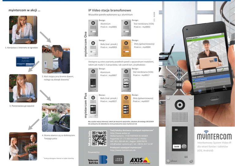 myintercom w akcji … IP Video stacje bramofonowe Wszystkie panele wykonane są z aluminium 1. Korzystasz z Internetu w ogrodzie Aluminium Prod.nr.: myi0001 Stal nierdzewna (V2A) Prod.nr.: myi0002 Biały (mal. proszk.) Prod.nr.: myi0003 Złoty (galwanizowany) Prod.nr.: myi0004 Dostępne są cztery warianty przednich paneli z opcjonalnymi modułami, takimi jak moduł 1-3 przycisków, lub czytnik kart, przykładowo: 2. Ktoś stojący przy bramie dzwoni, rozlega się dźwięk dzwonka* Aluminium Prod.nr.: myi0007 Stal nierdzewna (V2A) Prod.nr.: myi0017 Biały (mal. proszk.) Prod.nr.: myi0027 Złoty (galwanizowany) Prod.nr.: myi0037 3. Postanawiasz go wpuścić Aby uzyskać więcej informacji, takich jak akcesoria opcjonalne, odsyłamy do katalogu 2013/2014 lub zachęcamy do odwiedzenia strony producenta www.myintercom.de 4. Brama otwiera się za dotknięciem Twojego palca Twój lokalny dostawca rozwiązań myintercom® http://www.weber.pl WeberSystems - P.W.PARTNER M.WEBER Rugiańska 17 | 71-653 Szczecin | Polska NIP: 851-283-64-44 | Regon: 320578270 [email protected] | tel: +48 91 817 11 87 Producent rozwiązań myintercom http://www.myintercom.de * funkcja dostępna również w trybie stand-by ® Interkomowy System Video IP dla smart fonów i tabletów (iOS, Android) Funkcjonalność Aplikacja myintercom myintercom to videodomofon IP współpracujący z Twoim smartfonem lub tabletem. Składa się z panelu bramofonowego myintercom One lub myintercom Plus oraz aplikacji myintercom dla urządzenia mobilnego z systemem Android lub systemem iOS. • Videodomofon IP myintercom wymaga podłączenia do zasilania (zasilacz wtyczkowy 15 V lub moduł zasilacza do montażu na szynie) oraz przewodem poprzez sieć do routera. Jako opcja istnieje możliwość podłączenia w systemie dwuprzewodowym przy wykorzystaniu opcjonalnego modułu umożliwiającego transmisję pomiędzy routerem i panelem bramofonowym systemu myintercom. • Dźwięk oraz obraz z kamery są przesyłane do współpracującego urządzenia końcowego, w domu, w lokalnej sieciowa (LAN). • Z dala od domu, transmisja odbywa się przez Internet (WLAN) lub 3G / 4G praktycznie w nieograniczonym zakresie. * • Przy użyciu niezależnego przycisku typu dzwonkowego drzwi mogą być otwierane od wewnątrz bez potrzeby użycia urządzenia mobilnego. myintercom One Verso jest łatwo integrowalny z istniejącą skrzynką na listy lub rozmaitymi panelami. myintercom Cam1 jest dodatkowo wykorzystywany w aplikacjach o wysokich wymogach bezpieczeństwa. Jest on zainstalowany poza obrębem bramofonu , np. na suficie lub ścianie, obsługiwany z poziomu aplikacji myintercom, może być skonfigurowany jako druga kamera systemu videodomofonowego. Belka ①prezentuje w jaki sposób oraz w jakiej jakości obraz z kamery jest przekazywany przez sieć LAN lub 3G/4G. Kolor i długość belki określa jakość transmisji. Nazwy skonfigurowanych bramofonów są umieszczone na liście ②zamieszczonej w dolnej części ekranu. Naciśnięcie ikony słuchawki ③aktywuje tryb głośnomówiący. Oświetlenie w pierścieniu dookoła kamery jest uruchamiane ikoną oświetlenia „Light on” ④. Drzwi otwierane są przy użyciu ikony przycisku „Open door” ⑤. aplikacja „myintercom”