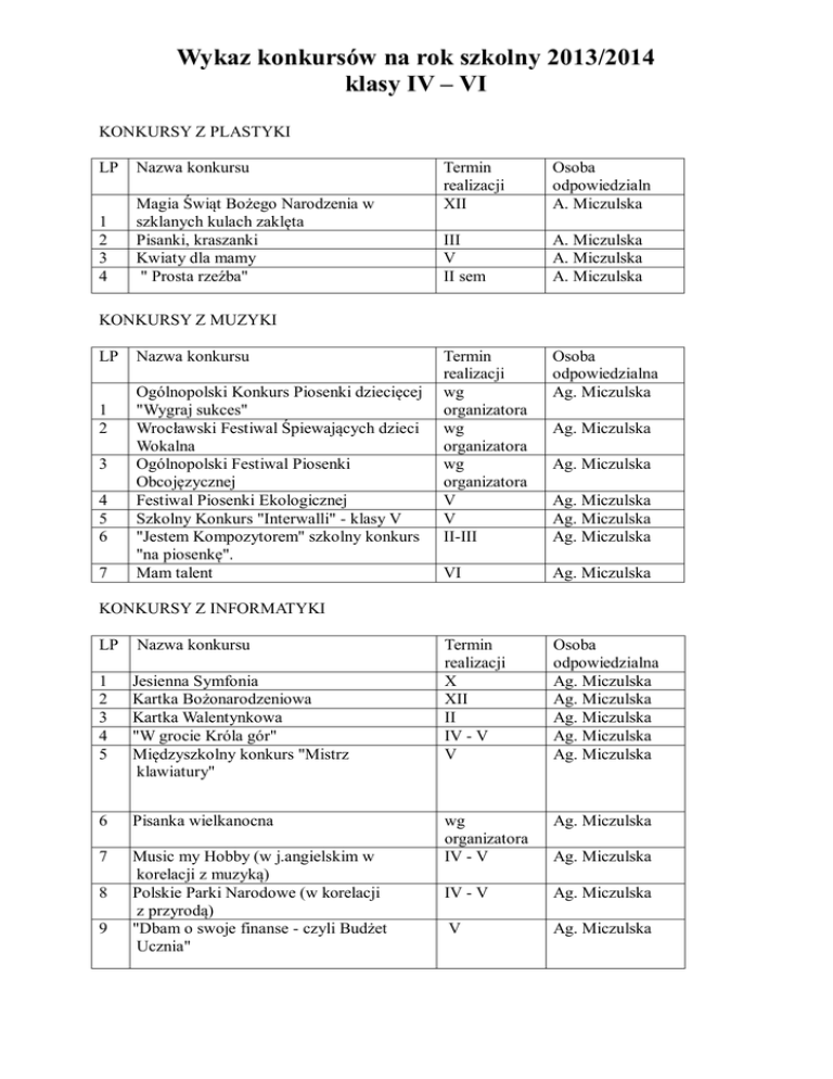 Wykaz konkursów na rok szkolny 2013/2014 klasy IV – VI