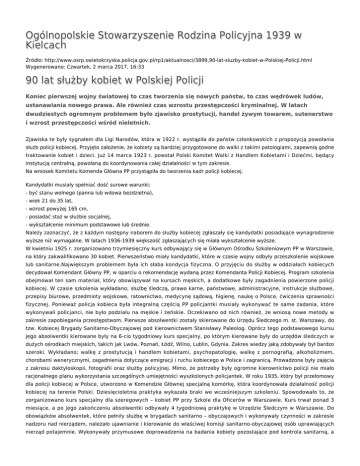 Ogólnopolskie Stowarzyszenie Rodzina Policyjna 1939 w Kielcach Źródło: http://www.osrp.swietokrzyska.policja.gov.pl/rp1/aktualnosci/3899,90-lat-sluzby-kobiet-w-Polskiej-Policji.html Wygenerowano: Czwartek, 2 marca 2017, 16:33 90 lat służby kobiet w Polskiej Policji Koniec pierwszej wojny światowej to czas tworzenia się nowych państw, to czas wędrówek ludów, ustanawiania nowego prawa. Ale również czas wzrostu przestępczości kryminalnej. W latach dwudziestych ogromnym problemem było zjawisko prostytucji, handel żywym towarem, sutenerstwo i wzrost przestępczości wśród nieletnich. Zjawiska te były sygnałem dla Ligi Narodów, która w 1922 r. wystąpiła do państw członkowskich z propozycją powołania służb policji kobiecej. Przyjęto założenie, że kobiety są bardziej przygotowane do walki z takimi patologiami, zapewnią godne traktowanie kobiet i dzieci. Już 14 marca 1923 r. powstał Polski Komitet Walki z Handlem Kobietami i Dziećmi, będący instytucją centralną, powołaną do koordynowania całej działalności w tym zakresie. Na wniosek Komitetu Komenda Główna PP przystąpiła do tworzenia kadr policji kobiecej. Kandydatki musiały spełniać dość surowe warunki; - być stanu wolnego (panna lub wdowa bezdzietna), - wiek 21 do 35 lat, - wzrost powyżej 165 cm, - posiadać staż w służbie socjalnej, - wykształcenie minimum podstawowe lub średnie. Należy zaznaczyć, że z każdym następny naborem do służby kobiecej zgłaszały się kandydatki posiadające wynagrodzenie wyższe niż wymagalne. W latach 1936-1939 większość zgłaszających się miała wykształcenie wyższe. W kwietniu 1925 r. zorganizowano trzymiesięczny kurs odbywający się w Głównym Ośrodku Szkoleniowym PP w Warszawie, na który zakwalifikowano 30 kobiet. Pierwszeństwo miały kandydatki, które w czasie wojny odbyły przeszkolenie wojskowe lub sanitarne.Największym problemem była ich słaba kondycja fizyczna. O przyjęciu do służby w oddziałach kobiecych decydował Komendant Główny PP, w oparciu o rekomendację wydaną przez Komendanta Policji Kobiecej. Program szkolenia obejmował ten sam materiał, który obowiązywał na kursach męskich, a dodatkowe były zagadnienia powierzone policji kobiecej. W czasie szkolenia wykładano; służbę śledczą, prawo karne, państwowe, administracyjne, instrukcje służbowe, przepisy biurowe, przedmioty wojskowe, ratownictwo, medycynę sądową, higienę, naukę o Polsce, ćwiczenia sprawności fizycznej. Ponieważ policja kobieca była integralną częścią PP policjantki musiały wykonywać te same zadania, które wykonywali policjanci, nie było podziału na męskie i żeńskie. Oczekiwano od nich również, że wniosą nowe metody w zakresie zapobiegania przestępstwom. Pierwsze absolwentki zostały skierowane do Urzędu Śledczego m. st. Warszawy, do tzw. Kobiecej Brygady Sanitarno-Obyczajowej pod kierownictwem Stanisławy Paleolog. Oprócz tego podstawowego kursu jego absolwentki kierowane były na 6-cio tygodniowy kurs specjalny, po którym kierowane były do urzędów śledczych w dużych ośrodkach miejskich, takich jak Lwów, Poznań, Łódź, Wilno, Lublin, Gdynia. Zakres wiedzy jaką zdobywały był bardzo szeroki. Wykładano; walkę z prostytucją i handlem kobietami, psychopatologię, walkę z pornografią, alkoholizmem, chorobami wenerycznymi, zagadnienia dotyczące emigracji i ruchu kobiecego w Polsce i zagranicą. Prowadzone były zajęcia z zakresu daktyloskopii, fotografii oraz służby policyjnej. Mimo, że potrzeby były ogromne kierownictwo policji nie miało racjonalnego planu wykorzystania szczególnych umiejętności wyszkolonych policjantek. W roku 1935, który był przełomowy dla policji kobiecej w Polsce, utworzono w Komendzie Głównej specjalną komórkę, która koordynowała działalność policji kobiecej na terenie Polski. Dziesięcioletnia praktyka wykazała braki we wcześniejszym szkoleniu. Spowodowało to, że zorganizowano kurs specjalny dla szeregowych – kobiet PP przy Szkole dla Oficerów w Warszawie. Kurs trwał ponad 3 miesiące, a po jego zakończeniu absolwentki odbywały 4 tygodniową praktykę w Urzędzie Śledczym w Warszawie. Do obowiązków absolwentek, które pełniły służbę w brygadach sanitarno – obyczajowych i wykonywały czynności w zakresie nadzoru nad nierządem, należało ujawnianie i kierowanie do właściwej komisji sanitarno-obyczajowej osób uprawiających nierząd potajemnie. Wykonywały przymusowe doprowadzenia na badania kobiety pozostające pod kontrola sanitarną, a uchylające się od badań lekarskich. Wykonywały czynności śledcze w zakresie walki z nierządem i przestępczością na tle seksualnym, a szczególnie likwidowanie potajemnych domów publicznych i domów schadzek, walka z prostytucją w hotelach, sprawy o zgwałcenia, czyny nierządne z nieletnimi, kazirodztwo. Policjantki zajmowały się służbą prewencyjną, która obejmowała sprawdzanie melin i mieszkań służących elementowi przestępczemu, miejsca zamieszkania bezrobotnych, w których źródłem utrzymania była żebranina i prostytucja nieletnich, obserwacja szkół, pod którymi wyczekiwali zboczeńcy, ochrona dziewcząt narażonych na werbunek przez sutenerów. Pod koniec grudnia 1936 r. w PP służyło 126 policjantek, a w 1939 r. było ich 170. Celem realizacji zadań dotyczących dzieci, które znajdowały się w środowiskach patologicznych, zaniedbanych lub przestępczych od 1935 r. otwierano Izby Zatrzymań dla dzieci. Pierwsza izba powstała w Warszawie, w której pełniło służbę 19 policjantek. Były one szczególnie wyselekcjonowanie do takiej pracy, posiadały doświadczenie w pracy policyjnej oraz zdolności pedagogiczne. W izbach prowadzona była praca wychowawczo-oświatowa w ramach, której uczono dzieci czytania i pisania, historii, przyrody. Prowadzono działania zmierzające do sprowadzenia nieletnich na lepsza drogę, zapobieżeniu popełnian