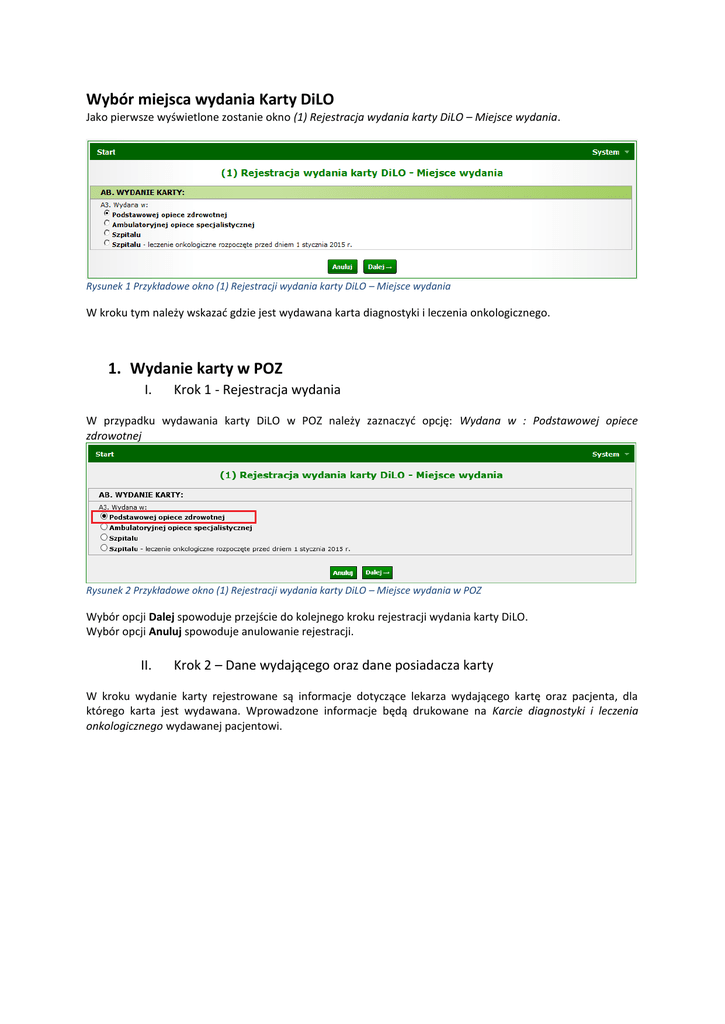 Wybór miejsca wydania Karty DiLO Jako pierwsze wyświetlone zostanie okno (1) Rejestracja wydania karty DiLO – Miejsce wydania. Rysunek 1 Przykładowe okno (1) Rejestracji wydania karty DiLO – Miejsce wydania W kroku tym należy wskazać gdzie jest wydawana karta diagnostyki i leczenia onkologicznego. 1. Wydanie karty w POZ I. Krok 1 - Rejestracja wydania W przypadku wydawania karty DiLO w POZ należy zaznaczyć opcję: Wydana w : Podstawowej opiece zdrowotnej Rysunek 2 Przykładowe okno (1) Rejestracji wydania karty DiLO – Miejsce wydania w POZ Wybór opcji Dalej spowoduje przejście do kolejnego kroku rejestracji wydania karty DiLO. Wybór opcji Anuluj spowoduje anulowanie rejestracji. II. Krok 2 – Dane wydającego oraz dane posiadacza karty W kroku wydanie karty rejestrowane są informacje dotyczące lekarza wydającego kartę oraz pacjenta, dla którego karta jest wydawana. Wprowadzone informacje będą drukowane na Karcie diagnostyki i leczenia onkologicznego wydawanej pacjentowi. Rysunek 3 Przykładowe okno: Rejestracji wydania karty DiLO – Wydanie karty w POZ Wszystkie pola oznaczone * (gwiazdką) są polami wymaganymi. AB.1 Lekarz wydający kartę W przypadku, gdy wydanie rejestrowane jest przez lekarza, część Lekarz wydający kartę zostanie uzupełniona na podstawie danych konta dostępowego. W przypadku, gdy wydanie rejestrowane jest przez operatora świadczeniodawcy, część Lekarz wydający kartę należy uzupełnić ręcznie wpisując imię, nazwisko oraz numer prawa wykonywania zawodu lekarza. Lekarz wskazany w rejestracji wydania karty musi być zarejestrowany w bazie OW NFZ oraz wykazany w potencjale świadczeniodawcy do umowy z NFZ, w ramach której nastąpi sprawozdanie wydania karty DiLO. AC. Informacje o posiadaczu karty W części Informacje o posiadaczu katy należy wprowadzić dane pacjenta, dla którego wydawana jest karta. Pola dostępne do uzupełnienia mogą się dynamicznie zmieniać w zależności od wybranych opcji. Dane osobowe pacjenta [AC.1.] Uzupełnienie informacji dla osoby dorosłej, zdolnej do świadomego wyrażania zgody Rejestracja danych pacjenta w części AC.1. wymaga wprowadzenia: o Nazwiska i imienia pacjenta o Typu identyfikatora, którym posługuje się pacjent: 1. 2. 3. 4. 5. PESEL PIN (Personal Identyfication Number) uzupełniany w przypadku uprawnionych do świadczeń na podstawie przepisów o koordynacji Dowód osobisty – seria i numer Paszport – seria i numer Inny dokument – seria i numer pacjentów Jeśli pacjent jest Polakiem i ma nadany numer PESEL należy wybrać PESEL jako typ identyfikatora o Wskazanie typu identyfikatora 2-5 spowoduje uaktywnienie dodatkowych pól do uzupełnienia (data urodzenia, płeć pacjenta) Wartość identyfikatora – w polu tym należy wpisać identyfikator pacjenta, np.: PESEL Wartość identyfikatora pacjenta w wydanej karcie powinna być zgodna z identyfikatorem pacjenta wykazywanym w komunikacie statystycznym z realizacji umowy z NFZ. o Rejestracja danych adresowych - adres miejsca zamieszkania pacjenta W przypadku, gdy pacjent mieszka poza granicami Polski należy zaznaczyć opcję Pacjent nie posiada adresu zamieszkania na terytorium Polski. Zaznaczenie opcji wymaga podania kodu państwa, w którym mieszka pacjent. W danych adresowych należy uzupełnić pola wymagane: kod pocztowy, miejscowości, ulica (jeśli występuje w adresie), numer domu, numer lokalu (jeśli występuje w adresie). Uzupełnienie pola miejscowość (na terytorium Polski) wymaga wprowadzenia przynajmniej trzech pierwszych znaków nazwy miejscowości i wybrania nazwy z wyświetlanego słownika. Im więcej znaków, tym dokładniej podpowiadany jest słownik. Jeśli nazwa nie zostanie wybrana ze słownika i system nie wykryje jednoznacznej zgodności wprowadzonej nazwy z nazwą pozycji słownikowej, pole zostanie oznaczone jako błędnie uzupełnione. Uzupełnienie informacji dla osoby małoletniej, całkowicie ubezwłasnowolnionej lub niezdolnej do świadomego wyrażania zgody W przypadku osób małoletnich uzupełnienie formularza danych osobowych wymaga zaznaczenia opcji Pacjent jest osobą małoletnią, całkowicie ubezwłasnowolnioną lub niezdolną do świadomego wyrażenia zgody. W efekcie zaznaczenia opcji wymaganą do uzupełnienia będzie część Dane przedstawiciela ustawowego albo opiekuna faktycznego (AC.2.). Dane personalne i adresowe uzupełnia się analogicznie do uzupełniania danych dla osoby dorosłej. Uzupełnienie informacji dla noworodka W przypadku noworodków uzupełniając część AC.1. konieczne jest zaznaczenie opcji: o Pacjent jest osobą małoletnią, całkowicie ubezwłasnowolnioną lub niezdolną do świadomego wyrażenia zgody o Wystawiono noworodkowi W efekcie zaznaczenia opcji dodatkowo wymagane do uzupełnienia będą pola: A13. Numer kolejny noworodka, A14. Data urodzenia (pacjenta), A15. Płeć (pacjenta) oraz część Dane przedstawiciela ustawowego albo opiekuna faktycznego (AC.2.). Dane osobowe pacjenta wymagają wprowadzenia: o Imienia i nazwiska pacjenta o Typu identyfikatora oraz wartości identyfikatora opiekuna o Danych adresowych pacjenta Rysunek 4 Przykładowe okno Danych osobowych pacjenta - noworodek AC.2. Dane przedstawiciela ustawowego albo opiekuna faktycznego Część Dane przedstawiciela ustawowego są wymagane w przypadku osób małoletnich, całkowicie ubezwłasnowolnionych lub niezdolnych do samodzielnego udzielenia zgody. Wymagane jest uzupełnienie pól: Imię , Nazwisko oraz sekcji zawierającej dane adresowe przedstawiciela. Rysunek 5 Przykładowe okno: Danych przedstawiciela ustawowego Dodatkowe informacje: W przypadku, gdy dane adresowe przedstawiciela są takie same jak dane pacjenta należy zaznaczyć opcję Adres pacjenta oraz przedstawiciela ustawowego lub opiekuna faktycznego są takie same. Jeśli przedstawiciel ustawowy ma adres zamieszkania poza terytorium polski należy zaznaczyć opcję Przedstawiciel ustawowy albo opiekun faktyczny n