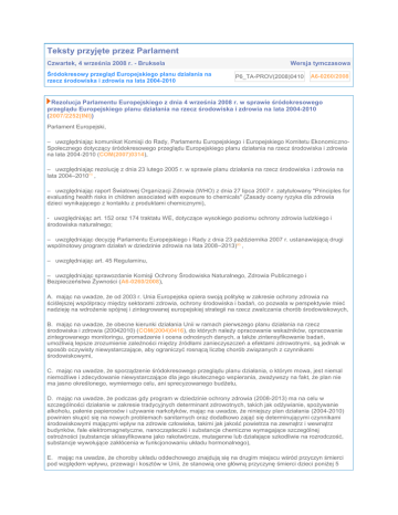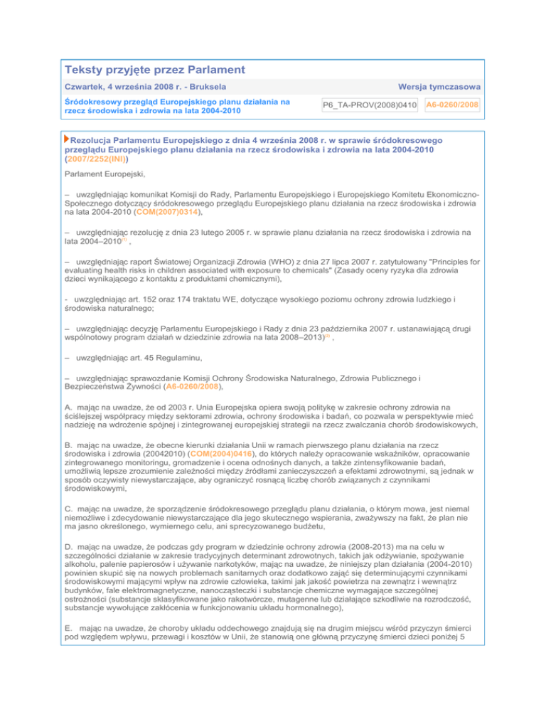 Teksty przyjęte przez Parlament Czwartek, 4 września 2008 r. - Bruksela Śródokresowy przegląd Europejskiego planu działania na rzecz środowiska i zdrowia na lata 2004-2010 Wersja tymczasowa P6_TA-PROV(2008)0410 A6-0260/2008 Rezolucja Parlamentu Europejskiego z dnia 4 września 2008 r. w sprawie śródokresowego przeglądu Europejskiego planu działania na rzecz środowiska i zdrowia na lata 2004-2010 (2007/2252(INI)) Parlament Europejski, – uwzględniając komunikat Komisji do Rady, Parlamentu Europejskiego i Europejskiego Komitetu EkonomicznoSpołecznego dotyczący śródokresowego przeglądu Europejskiego planu działania na rzecz środowiska i zdrowia na lata 2004-2010 (COM(2007)0314), – uwzględniając rezolucję z dnia 23 lutego 2005 r. w sprawie planu działania na rzecz środowiska i zdrowia na lata 2004–2010(1) , – uwzględniając raport Światowej Organizacji Zdrowia (WHO) z dnia 27 lipca 2007 r. zatytułowany "Principles for evaluating health risks in children associated with exposure to chemicals" (Zasady oceny ryzyka dla zdrowia dzieci wynikającego z kontaktu z produktami chemicznymi), - uwzględniając art. 152 oraz 174 traktatu WE, dotyczące wysokiego poziomu ochrony zdrowia ludzkiego i środowiska naturalnego; – uwzględniając decyzję Parlamentu Europejskiego i Rady z dnia 23 października 2007 r. ustanawiającą drugi wspólnotowy program działań w dziedzinie zdrowia na lata 2008–2013)(2) , – uwzględniając art. 45 Regulaminu, – uwzględniając sprawozdanie Komisji Ochrony Środowiska Naturalnego, Zdrowia Publicznego i Bezpieczeństwa Żywności (A6-0260/2008), A. mając na uwadze, że od 2003 r. Unia Europejska opiera swoją politykę w zakresie ochrony zdrowia na ściślejszej współpracy między sektorami zdrowia, ochrony środowiska i badań, co pozwala w perspektywie mieć nadzieję na wdrożenie spójnej i zintegrowanej europejskiej strategii na rzecz zwalczania chorób środowiskowych, B. mając na uwadze, że obecne kierunki działania Unii w ramach pierwszego planu działania na rzecz środowiska i zdrowia (20042010) (COM(2004)0416), do których należy opracowanie wskaźników, opracowanie zintegrowanego monitoringu, gromadzenie i ocena odnośnych danych, a także zintensyfikowanie badań, umożliwią lepsze zrozumienie zależności między źródłami zanieczyszczeń a efektami zdrowotnymi, są jednak w sposób oczywisty niewystarczające, aby ograniczyć rosnącą liczbę chorób związanych z czynnikami środowiskowymi, C. mając na uwadze, że sporządzenie śródokresowego przeglądu planu działania, o którym mowa, jest niemal niemożliwe i zdecydowanie niewystarczające dla jego skutecznego wspierania, zważywszy na fakt, że plan nie ma jasno określonego, wymiernego celu, ani sprecyzowanego budżetu, D. mając na uwadze, że podczas gdy program w dziedzinie ochrony zdrowia (2008-2013) ma na celu w szczególności działanie w zakresie tradycyjnych determinant zdrowotnych, takich jak odżywianie, spożywanie alkoholu, palenie papierosów i używanie narkotyków, mając na uwadze, że niniejszy plan działania (2004-2010) powinien skupić się na nowych problemach sanitarnych oraz dodatkowo zająć się determinującymi czynnikami środowiskowymi mającymi wpływ na zdrowie człowieka, takimi jak jakość powietrza na zewnątrz i wewnątrz budynków, fale elektromagnetyczne, nanocząsteczki i substancje chemiczne wymagające szczególnej ostrożności (substancje sklasyfikowane jako rakotwórcze, mutagenne lub działające szkodliwie na rozrodczość, substancje wywołujące zakłócenia w funkcjonowaniu układu hormonalnego), E. mając na uwadze, że choroby układu oddechowego znajdują się na drugim miejscu wśród przyczyn śmierci pod względem wpływu, przewagi i kosztów w Unii, że stanowią one główną przyczynę śmierci dzieci poniżej 5 roku życia oraz że choroby te w dalszym ciągu się rozwijają, w szczególności z powodu zanieczyszczenia powietrza na zewnątrz i wewnątrz budynków; F. uwzględniając, że zanieczyszczenie powietrza, zwłaszcza związane z pyłami i ozonem na poziomie gruntu, stanowi poważne zagrożenie dla zdrowia, wpływając negatywnie na prawidłowy rozwój dzieci i powodując skrócenie średniej długości życia w Unii(3) ; G. mając na uwadze, że w odniesieniu do kwestii miejskich chorób środowiskowych, a w szczególności jakości powietrza wewnątrz budynków, i zgodnie z zasadami pomocniczości i proporcjonalności Wspólnota powinna zintensyfikować swoje działania przeciwko zanieczyszczeniom pomieszczeń, ponieważ przeciętny obywatel europejski spędza 90% czasu wewnątrz budynków, H. mając na uwadze, że podczas konferencji ministerialnych WHO w sprawie środowiska i zdrowia w 2004 r. i 2007 r. podkreślone zostały związki między złożonym, połączonym wpływem zanieczyszczających substancji chemicznych i szeregiem przewlekłych zaburzeń i chorób, w szczególności u dzieci, oraz mając na uwadze, że kwestie te poruszają także oficjalne dokumenty programu środowiskowego ONZ i międzyrządowego forum w sprawie bezpieczeństwa chemicznego, I. mając na uwadze rosnącą liczbę dowodów naukowych na to, że niektóre choroby nowotworowe, takie jak nowotwór pęcherzyka żółciowego, nowotwór kości, nowotwór płuc, nowotwór skóry, nowotwór piersi i inne są powodowane nie tylko oddziaływaniem substancji chemicznych, napromieniowaniem, cząsteczkami obecnymi w powietrzu, lecz również innymi czynnikami środowiskowymi, J. mając na uwadze, że równolegle z rozwojem tych problematyk w ostatnich latach pojawiły się nowe choroby i zespoły chorobowe, takie jak zespół wieloważnego uczulenia na substancje chemiczne, Dental Amalgam Mercury Syndrome, nadwrażliwość na pole elektromagnetyczne, syndrom chorych budynków czy też zespół ADHD u dzieci, K. mając na uwadze, że zasada ostrożności jest wyraźnie zawarta w traktacie od 1992 r., a Tr