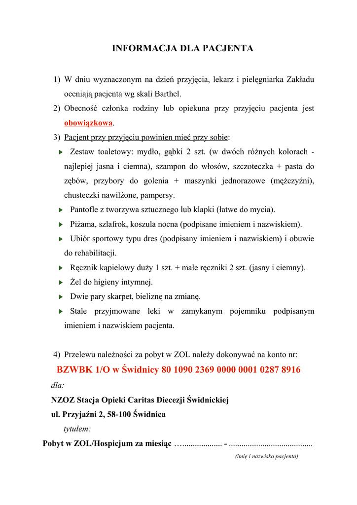 INFORMACJA DLA PACJENTA 1) W dniu wyznaczonym na dzień przyjęcia, lekarz i pielęgniarka Zakładu oceniają pacjenta wg skali Barthel. 2) Obecność członka rodziny lub opiekuna przy przyjęciu pacjenta jest obowiązkowa. 3) Pacjent przy przyjęciu powinien mieć przy sobie: Zestaw toaletowy: mydło, gąbki 2 szt. (w dwóch różnych kolorach najlepiej jasna i ciemna), szampon do włosów, szczoteczka + pasta do zębów, przybory do golenia + maszynki jednorazowe (mężczyźni), chusteczki nawilżone, pampersy. Pantofle z tworzywa sztucznego lub klapki (łatwe do mycia). Piżama, szlafrok, koszula nocna (podpisane imieniem i nazwiskiem). Ubiór sportowy typu dres (podpisany imieniem i nazwiskiem) i obuwie do rehabilitacji. Ręcznik kąpielowy duży 1 szt. + małe ręczniki 2 szt. (jasny i ciemny). Żel do higieny intymnej. Dwie pary skarpet, bieliznę na zmianę. Stale przyjmowane leki w zamykanym pojemniku podpisanym imieniem i nazwiskiem pacjenta. 4) Przelewu należności za pobyt w ZOL należy dokonywać na konto nr: BZWBK 1/O w Świdnicy 80 1090 2369 0000 0001 0287 8916 dla: NZOZ Stacja Opieki Caritas Diecezji Świdnickiej ul. Przyjaźni 2, 58-100 Świdnica tytułem: Pobyt w ZOL/Hospicjum za miesiąc …................... - ........................................ (imię i nazwisko pacjenta)