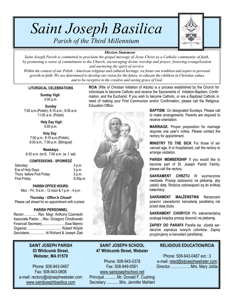 Saint Joseph Basilica Parish of the Third Millennium Mission Statement Saint Joseph Parish is committed to proclaim the gospel message of Jesus Christ as a Catholic community of faith, by promoting a sense of commitment to the Church, encouraging divine worship and prayer, fostering evangelization and nurturing the spirit of service. Within the context of our Polish - American religious and cultural heritage, we foster our tradition and aspire to personal growth in faith. We are determined to develop our vision for the future, to educate the children in Christian values and to be receptive to the creative and saving grace of God. LITURGICAL CELEBRATIONS Sunday Vigil: 4:00 p.m. Sunday 7:00 a.m.(Polish); 8:15 a.m.; 9:30 a.m. 11:00 a.m. (Polish) Holy Day Vigil: 5:00 p.m. RCIA (Rite of Christian Initiation of Adults) is a process established by the Church for individuals to become Catholic and receive the Sacraments of Initiation-Baptism, Confirmation, and the Eucharist. If you wish to become Catholic, or are a Baptized Catholic in need of making your First Communion and/or Confirmation, please call the Religious Education Office. BAPTISM. On designated Sundays. Please call to make arrangements. Parents are required to receive orientation. MARRIAGE. Proper preparation for marriage requires one year’s notice. Please contact the rectory for appointment. Holy Day 7:00 a.m.; 8:15 a.m.(Polish); 9:30 a.m., 7:00 p.m. (Bilingual) MINISTRY TO THE SICK For those of advanced age, ill or hospitalized, call the rectory to arrange visitation. Weekdays 6:30 a.m. (m-f); 7:00 a.m. (w, f, sat) PARISH MEMBERSHIP If you would like to become part of St. Joseph Parish Family, please call the rectory. CONFESSIONS - SPOWIEDŹ Saturday: Eve of Holy Days: Thurs. before First Friday First Friday: 3 p.m. 3 p.m. 3 p.m. 6:30p.m. SAKRAMENT CHRZTU W wyznaczone niedziele. Proszę zadzwonić na plebanię, aby ustalić datę. Rodzice zobowiązani są do krótkiej katechezy. PARISH OFFICE HOURS: Mon. - Fri.: 9 a.m. - 12 noon & 1 p.m. - 4 p.m. SAKRAMENT MAŁŻEŃSTWA Narzeczeni powinni zawiadomić kancelarię parafialną rok przed datą ślubu. Thursday - Office Is Closed! Please call ahead for an appointment with a priest. PARISH PERSONNEL Rector:.............. Rev. Msgr. Anthony Czarnecki Associate Pastor.... Rev. Grzegorz Chodkowski Financial Secretary.........................Ewa Mamro Organist:..................................... Robert Wójcik Sacristans................. Al Richard & Joseph Ziak SAINT JOSEPH PARISH 53 Whitcomb Street, Webster, MA 01570 Phone: 508-943-0467 Fax: 508-943-0808 e-mail: [email protected] www.saintjosephbasilica.com SAKRAMENT CHORYCH Po sakramentalną posługę księdza proszę dzwonić na plebanię. ZAPISY DO PARAFII Parafia św. Józefa serdecznie zaprasza nowych członków. Zapisy przyjmujemy w kancelarii parafialnej. SAINT JOSEPH SCHOOL 47 Whitcomb Street, Webster RELIGIOUS EDUCATION/RCIA Phone: 508-943-0467 ext.: 3 Phone: 508-943-0378 e-mail: [email protected] Director……………..Mrs. Mary Jolda Fax: 508-949-0581 www.sainjosephschool.net Principal ............Mr. Donald F. Cushing Secretary ............Mrs. Jennifer Mahlert Page 2 April 29, 2012—29 kwietnia 2012r. Masses for the week—Msze Św. w Tygodniu Sunday Vigil - April 28 4:00 r.s. Helen Baron - int. St. Joseph English Choir Sunday - April 29 7:00 For the parishioners of St. Joseph Basilica 8:15 r.s. Michal Werbecki - int. wife & family 9:30 r.s. Ziggy Czernicki - int. Jeff & Matt Sabacinski 11:00 s.p. Stanislaw i Anna Lepkowski - int. syn, Marek 1:00pm Baptism - Ayla Reed Monday - April 30 6:30 r.s. Stanley Dudek - int. Christine, Dennis, Alan, Georgette, Jessie & Jamie Tuesday - May 1 6:30 r.s. Barbara Zdrok - int. Edward & Anna Kudron 7:00 s.p. Jozef Baczynski - 30 dzien po smierci int - siostr i rodziny Wednesday - May 2 6:30 r.s. Eva Dudek - int. Christine, Dennis, Alan, Georgette, Jesse & Jamie 7:00 r.s. Rose, Bernard, Sr., & Bernard, Jr. Bastek int. family Thursday - May 3 6:30 r.s. Henryk Morga - int. M/M Joseph Kudron Friday– May 4– First Friday 6:30 r.s. Cecelia Majkut, Mary Dudek, Albert, Stanley & Bernard Makara - int. sister, Dorothy Hanc 7:00 Sacred Heart Society - deceased members 8:30 r.s. Anthony & Helen Szymczak - int. faculty & staff of St. Joseph School 7:00pm s.p. Eugeniusz Piatek - int. Stanislaw i Malgorzata Kicilinski z familia Saturday - May 5 7:00 r.s. Stanislaw & Kazimierz Lazarowski & Helen Baron - int. Jane Sunday Vigil 4:00 r.s. Denis K. Sheehan (41st anniv.) - int. wife, Irene & family Sunday - May 6 7:00 r.s. For the parishioners of St. Joseph Basilica 8:15 r.s. John Lipski - int. wife and children 9:30 r.s. Terry Miller - int. Robert Wojcik 11:00 s.p. Stanislaw i Jozef Szczepaniak - int. Teresa Plewa z rodzina 12:15pm First Holy Communion MARRIAGE BANNS I—Nicole Kolodziejczak and Eldred Laurence I-25 Club Winner for 6th week #171 Thomas Mikolajczak Captain Pat Parslow 5th Week—#197 Frank Czechowski SHARING OUR BLESSINGS—April 22, 2012 Weekly $5198.88 (including $246.88 in loose money) Diocesan Obligations $230; Educational Excellence $75; Fuel $473; 125th Jubilee Collection $145 Weekly Budget $7500 Stewardship Note: To be good stewards we must be good shepherds, willing to lay down our lives for those committed to our care, not mere hired hands who run off, “leaving the sheep to be snatched and scattered by the wolf.” SANCTUARY CANDLES April 29, 2012 through May 5, 2012 In memory of Helen Ostrokolowicz (first anniversary) Given by Edward and Lorraine Ostrokolowicz FOURTH SUNDAY OF EASTER April 29, 2012 See what love the Father has bestowed on us that we may be called the children of God. -1 John 3:1 RESPONDING TO THE CALL Do we truly know the voice of Christ? Do we truly respond to the voice of our shepherd with our own distinctive voice? How often we attempt to imitate those around us, appropriating the response of another member of the flock to Christ. Perhaps we need to bala