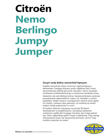 Citroën Nemo Berlingo Jumpy Jumper Uczyń swój dobry samochód lepszym. Kupiłeś samochód, który może być najistotniejszym elementem Twojego biznesu przez najbliższe lata. Pusty samochód jest jednak jak pusty warsztat i warto rozważyć możliwości przekształcenia go w skuteczne narzędzie pracy. Zastanów się nad efektywnością i bezpieczeństwem podczas poszukiwania odpowiednich części czy narzędzi w swoim pojeździe. Dzięki naszym rozwiązaniom zawsze wiesz gdzie ich szukać i zawsze masz pewność, że zostaną na swoim miejscu kiedy pojazd jest w ruchu. W System Edström bazujemy na ponad 50 latach doświadczeń w projektowaniu i produkcji zestawów mobilnych szafek dla Twojego Citroëna, byś mógł wybrać ten, który najbardziej spełni Twoje oczekiwania. Cały szereg oferowanych przez nas akcesoriów pomoże „skroić Twój mobilny warsztat na miarę”. Miejsce na wszystko www.systemedstrom.pl Citroën Nemo Rekomendowane ceny sprzedaży. Obowiązują od 2014-01-01 do odwołania. Podane ceny nie zawierają podatku VAT oraz kosztów montażu. Orientacyjny czas składania regału dla doświadczonego montera. Nr art. DxGxW F40320 1062x300x890 mm Nr art. DxGxW F40322 1062x300x890 mm Nr art. DxGxW F40324 1062x300x890 mm Kg Czas € 19 1,9 353,50 Kg Czas € 25 2,2 454,50 Kg Czas € 29 2,5 591,50 Nr art. kg Czas € F40330 67 5,5 1 494,50 Nr art. DxGxW F40321 635x300x890 mm Nr art. DxGxW F40323 635x300x890 mm Nr art. DxGxW F40325 635x300x890 mm Nr art. kg Czas € F40331 93 7,4 2 027,50 Kg Czas € 25 2,4 585,50 Kg Czas € 30 2,6 761,00 Kg Czas € 31 2,3 715,50 Nr art. kg Czas € F40334 56 5,5 1 270,00 Citroën Berlingo L1H1 Rekomendowane ceny sprzedaży. Obowiązują od 2014-01-01 do odwołania. Podane ceny nie zawierają podatku VAT oraz kosztów montażu. Orientacyjny czas składania regału dla doświadczonego montera. Nr art. DxGxW F40400 1241x300x890 mm Nr art. DxGxW F40402 1241x300x890 mm Nr art. DxGxW F40404 1241x300x890 mm Kg Czas € 22 1,9 402,50 Kg Czas € 28 2,2 511,50 Kg Czas € 32 2,5 628,00 Nr art. kg Czas € F40410 77 6,6 1 839,00 Nr art. F40411 Nr art. DxGxW F40401 727x300x890 mm Nr art. DxGxW F40403 812x300x890 mm Nr art. DxGxW F40405 727x300x890 mm kg Czas € 105 8,5 2 397,50 Kg Czas € 30 2,5 636,00 Kg Czas € 35 2,8 811,50 Kg Czas € 42 2,5 959,50 Nr art. kg Czas € F40412 64 6,6 1 627,50 Citroën Berlingo L2H1 Rekomendowane ceny sprzedaży. Obowiązują od 2014-01-01 do odwołania. Podane ceny nie zawierają podatku VAT oraz kosztów montażu. Orientacyjny czas składania regału dla doświadczonego montera. Nr art. DxGxW F40420 1241x300x890 mm Nr art. DxGxW F40422 1241x300x890 mm Nr art. DxGxW F40424 1241x300x890 mm Kg Czas € 22 1,9 402,50 Kg Czas € 28 2,2 511,50 Kg Czas € 32 2,5 628,00 Nr art. kg Czas € F40430 91 6,6 1 884,50 Nr art. F40431 Nr art. DxGxW F40421 727x300x890 mm Nr art. DxGxW F40423 812x300x890 mm Nr art. DxGxW F40425 727x300x890 mm kg Czas € 119 7,4 2 443,50 Kg Czas € 30 2,5 636,00 Kg Czas € 35 2,8 811,50 Kg Czas € 42 2,5 959,50 Nr art. kg Czas € F40434 75 6,6 1 656,00 Citroën Jumpy L1H1 Rekomendowane ceny sprzedaży. Obowiązują od 2014-01-01 do odwołania. Podane ceny nie zawierają podatku VAT oraz kosztów montażu. Orientacyjny czas składania regału dla doświadczonego montera. Nr art. DxGxW F46000 1633x300x890 mm Nr art. DxGxW F46002 1633x300x890 mm Nr art. DxGxW F46004 1631x300x890/1190 mm Nr art. DxGxW F46006 1601x300x890 mm Kg Czas € 27 1,9 476,50 Kg Czas € 38 2,5 720,50 Kg Czas € 58 3,4 1 104,50 Kg Czas € 57 3,0 1 201,00 Nr art. DxGxW F46001 895x300x890 mm Nr art. DxGxW F46003 980x300x890 mm Nr art. DxGxW F46005 895x300x890 mm Nr art. DxGxW F46007 850x300x890 mm Kg Czas € 31 2,6 624,50 Kg Czas € 36 2,9 792,50 Kg Czas € 42 2,5 917,00 Kg Czas € 21 2,1 394,50 Citroën Jumpy L2H1 Rekomendowane ceny sprzedaży. Obowiązują od 2014-01-01 do odwołania. Podane ceny nie zawierają podatku VAT oraz kosztów montażu. Orientacyjny czas składania regału dla doświadczonego montera. Nr art. DxGxW F46020 1878x300x890 mm Nr art. DxGxW F46022 1878x300x890 mm Nr art. DxGxW F46024 1878x300x890/1180 mm Nr art. DxGxW F46026 1846x300x890 mm Kg Czas € 33 2,6 584,50 Kg Czas € 47 3,4 820,00 Kg Czas € 54 3,5 1 028,50 Kg Czas € 61 3,9 1 239,50 Nr art. DxGxW F46021 1287x300x890 mm Nr art. DxGxW F46023 1372x300x890 mm Nr art. DxGxW F46025 1287x300x890 mm Nr art. DxGxW F46027 1242x470x890 mm Kg Czas € 36 2,6 670,00 Kg Czas € 41 2,9 838,00 Kg Czas € 47 3,2 1 024,50 Kg Czas € 36 2,0 558,50 Citroën Jumpy L2H2 Rekomendowane ceny sprzedaży. Obowiązują od 2014-01-01 do odwołania. Podane ceny nie zawierają podatku VAT oraz kosztów montażu. Orientacyjny czas składania regału dla doświadczonego montera. Nr art. DxGxW F46040 1878x300x1220 mm Nr art. DxGxW F46042 1963x300x1220 mm Nr art. DxGxW F46044 1878x300x1515 mm Nr art. DxGxW F46046 1878x300x1220 mm Kg Czas € 44 2,5 723,00 Kg Czas € 61 3,6 1 174,50 Kg Czas € 83 5,0 1 763,00 Kg Czas € 80 4,4 1 544,50 Nr art. DxGxW F46041 1287x300x1000 mm Nr art. DxGxW F46043 1372x300x1000 mm Nr art. DxGxW F46045 1287x300x1000 mm Nr art. DxGxW F46047 1242x470x1220 mm Kg Czas € 43 2,8 760,50 Kg Czas € 48 3,0 928,50 Kg Czas € 57 3,4 1 186,50 Kg Czas € 59 2,5 886,00 Citroën Jumper L1H1 Rekomendowane ceny sprzedaży. Obowiązują od 2014-01-01 do odwołania. Podane ceny nie zawierają podatku VAT oraz kosztów montażu. Orientacyjny czas składania regału dla doświadczonego montera. Nr art. DxGxW F45020 2270x470x1220 mm Nr art. DxGxW F45022 2355x470x1220 mm Nr art. DxGxW F45024 2270x300x1515 mm Nr art. DxGxW F45026 2275x323x1605 mm Kg Czas € 56 2,3 769,50 Kg Czas € 79 3,5 1 300,00 Kg Czas € 96 4,7 1 839,50 Kg Czas € 59 4,4 1 446,50 Nr art. DxGxW F45021 1287x300x1000 mm Nr art. DxGxW F45023 1372x300x1000 mm Nr art. DxGxW F45025 1287x300x1000 mm Nr art. DxGxW F45027 1252x323x1605 mm Kg Czas € 39 2,6 693,00 Kg Czas € 