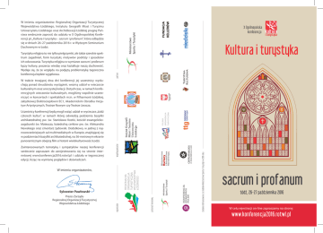W imieniu organizatorów: Regionalnej Organizacji Turystycznej Województwa Łódzkiego, Instytutu Geografii Miast i Turyzmu Uniwersytetu Łódzkiego oraz Archidiecezji Łódzkiej pragnę Państwa serdecznie zaprosić do udziału w X Ogólnopolskiej Konferencji pt. „Kultura i turystyka – sacrum i profanum”, która odbędzie się w dniach 26–27 października 2016 r. w Wyższym Seminarium Duchownym w Łodzi. Kultura i turystyka partner Turystyka religijna to nie tylko pielgrzymki, ale także szerokie spektrum zagadnień, form turystyki, motywów podróży i sposobów ich odczuwania. Turystyka religijna w wymiarze sacrum i profanum łączy kultury, poszerza wiedzę oraz kształtuje naszą duchowość. Wydaje się, że ze względu na podjętą problematykę tegoroczna konferencja będzie wyjątkowa. X Ogólnopolska konferencja W trakcie trwającej dwa dni konferencji jej uczestnicy wysłuchają ponad dwudziestu wystąpień, wezmą udział w wieczorze kulturalnym oraz uroczystej kolacji. Dotychczas, w ramach konferencyjnych wieczorów kulturalnych, mogliśmy wspólnie uczestniczyć w koncertach i spektaklach m.in. w Filharmonii Łódzkiej, zabytkowej Elektrociepłowni EC1, Akademickim Ośrodku Inicjatyw Artystycznych, Teatrze Nowym czy Teatrze Jaracza. W imieniu organizatorów, patronat honorowy Prezes Zarządu Regionalnej Organizacji Turystycznej Województwa Łódzkiego organizator Sylwester Pawłowski Zadanie dofinansowane ze środków Ministerstwa Sportu i Turystyki w 2016 roku Zainteresowanych tematyką i sympatyków naszej konferencji serdecznie zapraszam do zarejestrowania się na stronie internetowej www.konferencja2016.rotwl.pl i udziału w tegorocznej edycji, licząc na wymianę poglądów i doświadczeń. współorganizator Uczestnicy konferencji będą mogli wziąć udział w wycieczce „Łódź czterech kultur”, w ramach której odwiedzą podziemia bazyliki archikatedralnej pw. św. Stanisława Kostki, kościół ewangelickoaugsburski św. Mateusza, katedralną cerkiew pw. św. Aleksandra Newskiego oraz cmentarz żydowski. Dodatkowo, w jednej z najnowocześniejszych sal multimedialnych w Europie, znajdującej się w podziemiach bazyliki archikatedralnej, na 36-metrowym ekranie panoramicznym obejrzą film o historii wielokulturowości Łodzi. W celu rejestracji on-line zapraszamy na stronę: www.konferencja2016.rotwl.pl 26 października 2016 900–1000 Rejestracja uczestników konferencji 1000–1030 Powitanie gości przez organizatorów SESJA A 1540–1600 ks. prof. Jan Klinkowski Papieski Wydział Teologiczny we Wrocławiu Znaczenie sacrum w spotkaniu islamu i chrześcijaństwa we współczesnej wędrówce ludów 1600–1620 dr hab. Elżbieta Bilska-Wodecka, dr hab. Izabela Sołjan Uniwersytet Jagielloński Religijna i pozareligijna działalność sanktuariów katolickich ks. Michał Makula Parafia Ewangelicko -Augsburska św. Mateusza w Łodzi Rola obiektów sakralnych w rozumieniu problematyki wielokulturowości miasta ks. Łukasz Tarnawski Archidiecezja Łódzka Kraków bez Wzgórza Wawelskiego, Częstochowa bez Jasnej Góry, Rzym bez Watykanu dr Piotr Gryszel Uniwersytet Ekonomiczny we Wrocławiu Dziedzictwo protestantów w krajobrazie Sudetów jako produkt turystyczny ks. Jakub Dmitruk Katedralna Parafia Prawosławna św. Aleksandra Newskiego Obiekty sakralne Cerkwi Prawosławnej w Polsce – kontekst poznawczy prof. Jacek Kaczmarek, mgr Tomasz Dronka mgr Joanna Dronka-Skrzypczak Uniwersytet Łódzki Droga pielgrzymkowa z Częstochowy do Lichenia – projekt i organizacja 1700–1720 Joanna Bik Uniwersytet Łódzki Światowe Dni Młodzieży. Radosne spotkanie na gruncie wiary dr Magdalena Duda-Seifert Uniwersytet Wrocławski Walory poznawcze miejsc kultu i zgromadzeń mniejszości religijnych Wrocławia 1720–1800 Dyskusja i podsumowanie dnia 1930/2100 Wieczór artystyczny / uroczysta kolacja SESJA PLENARNA KRAJOWA 1030–1050 prof. Antoni Jackowski Uniwersytet Jagielloński Dzieje badań nad problemem turystyki religijnej w ramach geografii religii 1050–1110 Rabin Symcha Keller Fundacja Kellerów Turystyka żydowska o charakterze religijnym w regionie łódzkim 1110–1130 bp Damian Muskus OFM Koordynator generalny Komitetu Organizacyjnego ŚDM Podsumowanie Światowych Dni Młodzieży Kraków 2016 1130–1150 Szymon Gatlik Wydział Promocji i Turystyki Urzędu Miasta Krakowa ŚDM Kraków 2016. Czy naprawdę było warto? Spojrzenie „z miasta” 12 –12 00 30 1620–1640 1640–1700 przerwa kawowa SESJA PLENARNA ZAGRANICZNA 1230–1300 Don Gaetano Giovanni Biallo Opera Romana Pellegrinaggi, Włochy Religious Tourism as a New Way of Evangelisation 1300–1330 Otto van Veen Nyenrode Bussiness University, konsul honorowy Rzeczypospolitej Polskiej w Utrechcie, Holandia Travel and Tourism as a Religious Experience 1330–1400 Alexandre Marto Pereira Associação Empresarial Ourém-Fátima, Portugalia Fatima: Religious Tourism from a Hotelier Perspective 1400–1430 1445–1540 Rabin Avraham Krieger Shem Olam Instytute, Izrael Rabbinical Leadership and Its Relevance during the Succesful Settlement and then during the Demise of Jewish Life in Poland and Eastern Europe SESJA B prof. Katarzyna Marciniak Uniwersytet im. Adama Mickiewicza w Poznaniu Sacrum czy profanum? – analiza ruchu pątniczego na podstawie pielgrzymek do wielkopolskich sanktuariów maryjnych SESJA A SESJA B 1340–1400 prof. Jacek Potocki Uniwersytet Ekonomiczny we Wrocławiu Śnieżka jako cel wędrówek i miejsce kultu religijnego Małgorzata Wilk-Grzywna Regionalna Organizacja Turystyczna Województwa Świętokrzyskiego Oferta turystyki religijnej na przykładzie Pustelni Złotego Lasu w Rytwianach oraz wybranych obiektów sakralnych w Wielkiej Brytanii 1400–1420 dr inż. Tadeusz Jędrysiak Fundacja Oko-Lice Kultury dr Izabela Wyszowska Akademia Wychowania Fizycznego im. Eugeniusza Piaseckiego w Poznaniu Pielgrzymowanie w różnych religiach świata – cele i motywy 1420–1440 mgr Marta We