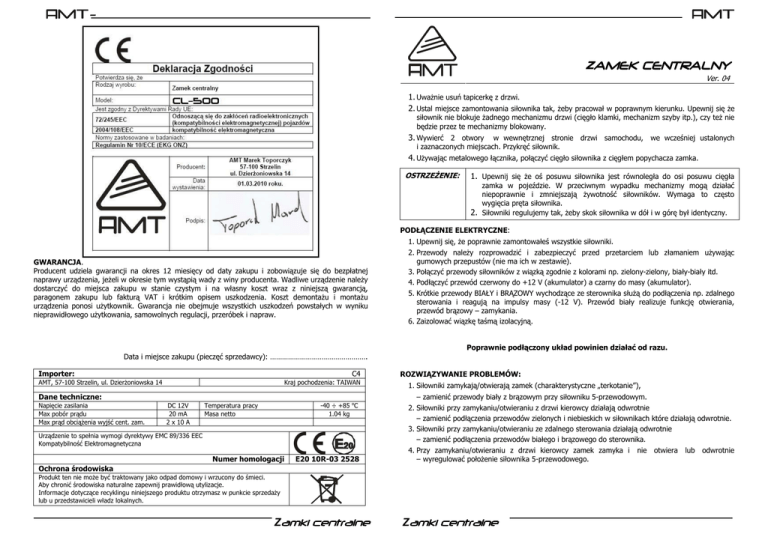 - - ZAMEK CENTRALN CENTRALNY Y Ver. 04 1. UwaŜnie usuń tapicerkę z drzwi. 2. Ustal miejsce zamontowania siłownika tak, Ŝeby pracował w poprawnym kierunku. Upewnij się Ŝe siłownik nie blokuje Ŝadnego mechanizmu drzwi (cięgło klamki, mechanizm szyby itp.), czy teŜ nie będzie przez te mechanizmy blokowany. 3. Wywierć 2 otwory w wewnętrznej stronie drzwi samochodu, we wcześniej ustalonych i zaznaczonych miejscach. Przykręć siłownik. 4. UŜywając metalowego łącznika, połączyć cięgło siłownika z cięgłem popychacza zamka. OSTRZEśENIE: 1. Upewnij się Ŝe oś posuwu siłownika jest równoległa do osi posuwu cięgła zamka w pojeździe. W przeciwnym wypadku mechanizmy mogą działać niepoprawnie i zmniejszają Ŝywotność siłowników. Wymaga to często wygięcia pręta siłownika. 2. Siłowniki regulujemy tak, Ŝeby skok siłownika w dół i w górę był identyczny. PODŁĄCZENIE ELEKTRYCZNE: GWARANCJA. Producent udziela gwarancji na okres 12 miesięcy od daty zakupu i zobowiązuje się do bezpłatnej naprawy urządzenia, jeŜeli w okresie tym wystąpią wady z winy producenta. Wadliwe urządzenie naleŜy dostarczyć do miejsca zakupu w stanie czystym i na własny koszt wraz z niniejszą gwarancją, paragonem zakupu lub fakturą VAT i krótkim opisem uszkodzenia. Koszt demontaŜu i montaŜu urządzenia ponosi uŜytkownik. Gwarancja nie obejmuje wszystkich uszkodzeń powstałych w wyniku nieprawidłowego uŜytkowania, samowolnych regulacji, przeróbek i napraw. 1. Upewnij się, Ŝe poprawnie zamontowałeś wszystkie siłowniki. 2. Przewody naleŜy rozprowadzić i zabezpieczyć przed przetarciem lub złamaniem uŜywając gumowych przepustów (nie ma ich w zestawie). 3. Połączyć przewody siłowników z wiązką zgodnie z kolorami np. zielony-zielony, biały-biały itd. 4. Podłączyć przewód czerwony do +12 V (akumulator) a czarny do masy (akumulator). 5. Krótkie przewody BIAŁY i BRĄZOWY wychodzące ze sterownika słuŜą do podłączenia np. zdalnego sterowania i reagują na impulsy masy (-12 V). Przewód biały realizuje funkcję otwierania, przewód brązowy – zamykania. 6. Zaizolować wiązkę taśmą izolacyjną. Poprawnie podłączony układ powinien działać od razu. Data i miejsce zakupu (pieczęć sprzedawcy): …………………………………………. C4 Importer: AMT, 57-100 Strzelin, ul. DzierŜoniowska 14 Kraj pochodzenia: TAIWAN Dane techniczne: Napięcie zasilania Max pobór prądu Max prąd obciąŜenia wyjść cent. zam. DC 12V 20 mA 2 x 10 A -40 ÷ +85 oC 1.04 kg Temperatura pracy Masa netto Urządzenie to spełnia wymogi dyrektywy EMC 89/336 EEC Kompatybilność Elektromagnetyczna Numer homologacji E20 10R-03 2528 ROZWIĄZYWANIE PROBLEMÓW: 1. Siłowniki zamykają/otwierają zamek (charakterystyczne „terkotanie”), – zamienić przewody biały z brązowym przy siłowniku 5-przewodowym. 2. Siłowniki przy zamykaniu/otwieraniu z drzwi kierowcy działają odwrotnie – zamienić podłączenia przewodów zielonych i niebieskich w siłownikach które działają odwrotnie. 3. Siłowniki przy zamykaniu/otwieraniu ze zdalnego sterowania działają odwrotnie – zamienić podłączenia przewodów białego i brązowego do sterownika. 4. Przy zamykaniu/otwieraniu z drzwi kierowcy zamek zamyka i nie otwiera lub odwrotnie – wyregulować połoŜenie siłownika 5-przewodowego. Ochrona środowiska Produkt ten nie moŜe być traktowany jako odpad domowy i wrzucony do śmieci. Aby chronić środowiska naturalne zapewnij prawidłową utylizacje. Informacje dotyczące recyklingu niniejszego produktu otrzymasz w punkcie sprzedaŜy lub u przedstawicieli władz lokalnych. Zamki centralne Zamki centralne - - Podłączenie do radiowego sterownika Mikro-Ster Podłączenie siłowników do sterownika. Podłączenie do radiowego sterownika Mini-Ster Zamki centralne Zamki centralne