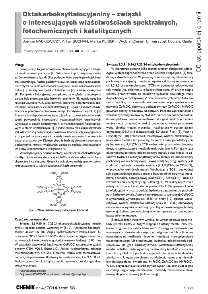 Joanna Nackiewicz*, Artur Suchan, Marta Kliber – Wydział Chemii, Uniwersytet Opolski, Opole Prosimy cytować jako: CHEMIK 2014, 68, 4, 369–376 Wstęp Ftalocyjaniny, to grupa związków chemicznych będących analogami strukturalnymi porfiryny [1]. Właściwości tych związków zależą, zarówno od natury ligandu (Pc), podstawników peryferyjnych, jak i metalu centralnego. Rodzaj podstawników, ich liczba oraz rozmieszczenie wpływa na wiele właściwości ftalocyjanin, m.in. właściwości spektralne [1], katalityczne i elektrokatalityczne [2], a także elektryczne [1]. Kompleksy ftalocyjaniny, początkowo ze względu na intensywną barwę, były stosowane jako barwniki i pigmenty [3], jednak mogą być również używane m.in. jako: barwniki laserowe, półprzewodniki molekularne, katalizatory, elektrokatalizatory [1, 3] oraz jako fotosensybilizatory w przeciwnowotworowej terapii fotodynamicznej (PDT) [4]. Ftalocyjaniny niepodstawione wykazują nikłą rozpuszczalność w większości powszechnie stosowanych rozpuszczalników organicznych, wynikającą z silnych oddziaływań π-π makropierścieni ftalocyjaninowych w stanie krystalicznym [1]. Z jednej strony mała rozpuszczalność jest właściwością pożądaną dla związków stosowanych jako pigmenty, z drugiej jednak strony ogranicza wiele innych zastosowań i wykonanie badań dla roztworów. Dlatego obecnie bada się głównie ftalocyjajniny podstawione, których właściwości zależą od rodzaju podstawników, ich liczby i rozmieszczenia w ligandzie Pc. W niniejszej pracy opisano metody syntezy oktakarboksyftalocyjanin (Rys.1), ich widma absorpcyjne UV-Vis, wybrane właściwości fotochemiczne i katalityczne. Grupy karboksylowe nadają tym związkom rozpuszczalność w wielu rozpuszczalnikach polarnych. Rys. 1. Wzór oktakarboksyftalocyjanin, M-metal Część eksperymentalna Syntezę 2,3,9,10,16,17,23,24-oktakarboksyftalocyjaniny miedzi, cynku i kobaltu opisano wcześniej w [5÷7]. Aparatura: Spektrofotometr Unicam UV 300, Anglia; Spektrofotometr Perkin Elmer Fluorescence MPF-3. Widma UV–Vis absorpcyjne i emisyjne zmierzono w kuwetach kwarcowych o grubości warstwy badanej 10,00 mm. W badaniach aktywności katalitycznej CoPcOC zastosowano czujnik tlenowy CTN- 920.S, Elsent S.C., Polska; wielofunkcyjny przyrząd mikrokomputerowy CX-551, Elmetron, Polska oraz termostatowane naczynie pomiarowe. Roztwory termostatowano, T=24,5±0,5ºC Podczas pomiarów układ był szczelnie zamknięty, bez dostępu tlenu atmosferycznego. Autor do korespondencji: Dr Joanna Nackiewicz, e-mail:[email protected] nr 4/2014 • tom 68 Synteza 2,3,9,10,16,17,23,24-oktakarboksylocyjanin W literaturze opisano kilka metod syntezy oktakarboksyftalocyjan. Synteza zaproponowana przez Bostona i współprac. [8] składa się z dwóch etapów. W pierwszym otrzymuje się tetraimidową pochodną ftalocyjaniny metalu w wyniku cyklicznej tetrameryzacji 1,2,4,5-tetracyjanobenzenu (TCB) w obecności odpowiedniej soli metalu (np. chlorku) w glikolu etylenowym. W drugim etapie syntezy, przeprowadza się zasadową hydrolizę powstałego imidu do pochodnej karboksylowej. Z przeprowadzonych przez Autorów syntez wynika, że ta metoda jest skuteczna w przypadku otrzymywania CuPcOC, natomiast podczas syntezy CoPcOC i NiPcOC powstaje szereg produktów ubocznych. Ponadto zaproponowane warunki hydrolizy imidów są zbyt drastyczne; dochodzi do rozkładu kompleksów. Pochodne imidowe ftalocyjanin niektórych metali można także otrzymać w reakcji bezwodnika kwasu piromelitowego, chlorku metalu, mocznika i katalizatora w postaci zasady organicznej DBU (1,8-diazabicyklo[5,4,0]undek-7-en) [9]. Wöhrle i współprac. [10] przedstawili trójetapową syntezę oktakarboksyftalocyjanin metali. Etap pierwszy, to synteza oktacyjanoftalocyjaniny bez metalu, H2Pc(CN)8 z TCB w obecności propanolanu litu; etap drugi, to wprowadzenie metalu do makropierścienia Pc–, tj. synteza oktacyjanoftalocyjaniny odpowiedniego metalu i etap trzeci, to zasadowa hydroliza oktacyjanoftalocyjaniny metalu do odpowiedniej pochodnej oktakarboksylowej. Pewną wadą tej drogi syntezy jest trudność uzyskania całkowitej metalizacji H2Pc(CN)8 do MPc(CN)8 w przypadku niektórych metali. Wychodząc z TCB i bezwodnej soli odpowiedniego metalu można bezpośrednio otrzymać metaliczną pochodną oktacyjanową (CoPc(CN)8, FePc(CN)8), stosując rozpuszczalnik aprotyczny (np. sulfolan)[11]. W reakcji tej również należy zastosować katalizator w postaci DBU. Otrzymane oktacyjanoftalocyjaniny można poddać hydrolizie zasadowej do pochodnych karboksylowych. Autorzy zsyntezowali w ten sposób CoPcOC z wydajnością wynoszącą ok. 25%. W pracy [12] opisano wieloetapową syntezę oktakarboksyftalocyjaniny (H2PcOC) otrzymanej ostatecznie w wyniku zasadowej hydrolizy odpowiedniej pochodnej estrowej. Substratem wyjściowym w tej syntezie był bezwodnik kwasu piromelitowego. Z doświadczeń Autorów wynika, że wybór odpowiedniej metody syntezy zależy w dużym stopniu od natury metalu. Przy wyborze drogi syntezy należy także zwrócić uwagę na możliwość powstawania produktów ubocznych, np. oligomerów lub polimerów ftalocyjanin; na możliwość niepełnej metalizacji makropierścienia ftalocyjaninowego lub niecałkowitej hydrolizy odpowiednich podstawników do grup karboksylowych. Oktakarboksyftalocyjaniny miedzi, kobaltu i niklu wykazują bardzo dużą trwałość chemiczną i termiczną. Niektóre pochodne są jednak nietrwałe w środowisku alkalicznym. Ulegają powolnemu rozkładowi, nawet przy niewielkim dostępie tlenu i światła (np. H2PcOC, ZnPcOC lub MnPcOC). W celu oczyszczenia oktakarboksyftalocyjanin konieczna jest często ekstrakcja ciągła rozpuszczalnikami i niekiedy zastosowanie chromatografii preparatywnej (kolumnowej). • 369 50 lat opolskiej chemii Oktakarboksyftalocyjaniny – związki o interesujących właściwościach spektralnych, fotochemicznych i katalitycznych 50 lat opolsk