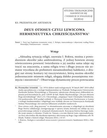 STUDIA TEOLOGICZNE NAWRÓĆCIE SIĘ I WIERZCIE W EWANGELIĘ 32(2014) KS. PRZEMYSŁAW ARTEMIUK DEUS OTIOSUS CZYLI LEWICOWA HERMENEUTYKA CHRZEŚCIJAŃSTWA1 Treści: 1. Terry’ego Eagletona rozumienie wiary, 2. Religia, transcendencja i objawienie według Petera Sloterdijka, Podsumowanie – wnioski. Wstęp „Aktualną sytuację religii, zauważa I. Bokwa, można z powodzeniem określić jako ambiwalentną. Z jednej bowiem strony oświeceniowa pewność twierdzenia o jej zaniku sama zdaje się tracić na znaczeniu, a sama religia trwa i długo jeszcze nie zostanie wycofana do prehistorii niesamodzielnej ludzkości, z drugiej zaś strony kontury tej rzeczywistości, którą można określić jednoznacznie mianem religii, ulegają daleko posuniętemu rozmyciu i nieostrości”2. Obserwując dynamiczny proces powracania Ks. Przemysław Artemiuk – (ur. 1974) doktor nauk teologicznych. W latach 2007-2010 odbył studia specjalistyczne z teologii fundamentalnej na Wydziale Teologicznym Uniwersytetu Kardynała Stefana Wyszyńskiego w Warszawie, zakończone obroną pracy doktorskiej napisanej pod kierunkiem ks. prof. UKSW dr hab. Marka Skierkowskiego: „On jest obrazem Boga niewidzialnego” (Kol 1,15). Chrystologia „zstępująca” kard. Christopha Schönborna. Od października 2010 podjął wykłady w Wyższym Seminarium Duchownym w Łomży z teologii fundamentalnej i religiologii oraz wykłady zlecone na Uniwersytecie Kardynała Stefana Wyszyńskiego. Jest autorem kilkunastu artykułów naukowych. 1 Deus otiosus czyli „Bóg pasywny” to sformułowanie używane w religiologii na określenie Boga-Stwóry oddalonego, nieingerującego w sprawy świata, któremu nie oddaje się czci, przywoływanego jedynie w sytuacjach dramatycznych. Koncepcja bóstwa biernego znalazła swoje miejsce w deizmie. Z kolei św. Tomasz, a za nim Marcin Luter, wprowadził pojęcie Deus absconditus dla określenia tajemnicy ukrywania się Boga i Jego oddalenia; zob. M. Eliade, Traktat o historii religii, Warszawa 2010, s. 63-67. 2 I. Bokwa, Teologia w warunkach nowoczesności i ponowoczesności, Sandomierz 2010, s. 304305. 107 Ks. Przemysław Artemiuk duchowości, przybierający niejednokrotnie formę niekonfesyjną3 i definiowany jako „rozlewanie się sacrum”4, dostrzegamy równoczesne zainteresowanie kwestią Boga i religii wśród przedstawicieli intelektualnej lewicy, wywodzących się ze środowisk neomarksistowskich („Szkoła Frankfurcka”, „Krytyka Polityczna”). Klasyczny już dzisiaj lewicowy myśliciel J. Habermas w tekście „Wierzyć i wiedzieć” zauważa, że „społeczeństwo postsekularne” nie jest ostatecznie społeczeństwem całkowicie zsekularyzowanym, a rola religii dzisiaj, chociaż ograniczona w porównaniu z dawnymi czasami, nadal pozostaje znacząca5. Skoro lewicowi intelektualiści zwracają się ku chrześcijaństwu, spróbujmy przyjrzeć się ich zainteresowaniom i zobaczyć jaką hermeneutykę wiary proponują. Zapytajmy kim jest dla nich Bóg chrześcijan? Jaką rolę przypisują religii Objawionej? Czy ich interpretacja chrześcijaństwa wykracza poza surową krytykę i dociera do rdzenia, czy też pozostaje jedynie dekonstrukcją biblijnych motywów, obecnych w kulturze. Teologia, jak przekonują, jest rzeczą zbyt poważną, by pozostawić ją teologom, a „(…) religia – podkreśla lewicowa filozof A. Bielik-Robson, to coś więcej niż tylko archaiczny zestaw dogmatów – (…) to także wielka metafizyczna spekulacja. (…) spekulacja ta dotyczyć może nie tylko Boga żywego, obecnego, opatrznościowego, do którego zanosimy nasze intensywne modły – ale także, a w nowoczesności przede wszystkim, «Boga nieobecnego», «Boga, który się wycofał», albo wręcz «Boga, który umarł». Deus absconditus, albo jeszcze lepiej – deus otiosus, ponieważ formuła ta zawiera szczególnie nas tu zajmującą ambiwalencję: sugestywną wizję Boga jako jednocześnie nieobecnego, ale też niechcianego, zepchniętego w nieważkość, schowa3 4 5 J. Mariański, Religia w społeczeństwie ponowoczesnym. Studium socjologiczne, Warszawa 2010, s. 195-242. H. Seweryniak, Teologia fundamentalna, t. I, Warszawa 2010, s. 98-100. Zob. J. Habermas, Przyszłość natury ludzkiej. Czy zmierzamy do eugeniki liberalnej?, przekład M. Łukasiewicz, Warszawa 2003, s. 103-115. Przywoływany tekst ukazał się także w miesięczniku Znak 568/2002. 108 Deus otiosus czyli lewicowa hermeneutyka chrześcijaństwa nego do lamusa. Typowego Boga epoki nowoczesnej, której żywiołem jest, jak pisze Jonas, «bezwarunkowa immanencja»: Boga w postaci śladowej, widmowej, zaprzeszłej”6. Poszukując zatem wątków chrześcijańskich, obecnych w tekstach lewicowych intelektualistów, odwołam się do myśli T. Eagletona, P. Sloterdijka. Podejmując analizę wybranych motywów ich twórczości, przyjmę następującą metodę. Najpierw dokonam krótkiego wprowadzenia, prezentując filozofów. Następnie prześledzę ich hermeneutykę chrześcijaństwa. Na koniec zaś przedstawię ocenę poglądów myślicieli, która przybierze postać apologii. 1. Terry’ego Eagletona rozumienie wiary Terry Eagleton (ur. 1943) to czołowy brytyjski myśliciel odwołujący się do marksizmu, literaturoznawca, profesor literatury angielskiej na Lancaster University oraz University of Notre Dame7. Z powodzeniem zajmuje się także problematyką współczesnej kultury, religijności i filozofii. Eagleton, jak zauważa B. Baran, jest intelektualnie dość nieokreślony, po trosze filozof, po trosze teoretyk literatury, a także ideolog. „Mówią o nim, że nie wstałby rano, gdyby nie podparł się Bogiem i Marksem, choć pochodzi z katolickiej rodziny i zażarcie zwalcza «prymitywny» ateizm. Eagleton jest postrzegany czasem jako katolik (czego nie dementuje) i marksista, choć bliższe prawdy byłoby chyba uznanie go za bogobojnego ateistę-socjalistę”8. Przyznając się do katolickich korzeni (pochodzi 