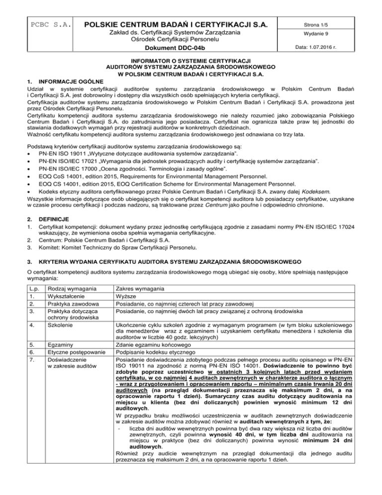 PCBC S.A. POLSKIE CENTRUM BADA I CERTYŻIKACJI S.A. Zakład ds. Certyfikacji Systemów Zarządzania O rodek Certyfikacji Personelu Dokument DDC-04b Strona 1/5 Wydanie 9 Data: 1.07.2016 r. INFORMATOR O SYSTEMIE CERTYFIKACJI AUDITORÓW SYSTEMU ZARZ DZANIA RODOWISKOWEżO W POLSKIM CENTRUM BADA I CERTYŻIKACJI S.A. 1. INŻORMACJE OżÓLNE Udział w systemie certyfikacji auditorów systemu zarządzania rodowiskowego w Polskim Centrum Badań i Certyfikacji S.A. jest dobrowolny i dostępny dla wszystkich osób spełniających kryteria certyfikacji. Certyfikacja auditorów systemu zarządzania rodowiskowego w Polskim Centrum Badań i Certyfikacji S.A. prowadzona jest przez O rodek Certyfikacji Personelu. Certyfikatu kompetencji auditora systemu zarządzania rodowiskowego nie nale y rozumieć jako zobowiązania Polskiego Centrum Badań i Certyfikacji S.A. do zatrudniania jego posiadacza. Certyfikat nie ogranicza tak e praw tej jednostki do stawiania dodatkowych wymagań przy rejestracji auditorów w konkretnych dziedzinach. Wa no ć certyfikatu kompetencji auditora systemu zarządzania rodowiskowego jest odnawiana co trzy lata. Podstawą kryteriów certyfikacji auditorów systemu zarządzania rodowiskowego sąŚ PN-EN ISO 19011 „Wytyczne dotyczące auditowania systemów zarządzania”. PN-źN ISO/IźC 17021 „Wymagania dla jednostek prowadzących audity i certyfikację systemów zarządzania”. PN-źN ISO/IźC 17000 „Ocena zgodno ci. Terminologia i zasady ogólne”. EOQ CoS 14001, edition 2015, Requirements for Environmental Management Personnel. EOQ CS 14001, edition 2015, EOQ Certification Scheme for Environmental Management Personnel. Kodeks etyczny auditora certyfikowanego przez Polskie Centrum Badań i Certyfikacji S.A. zwany dalej Kodeksem. Wszystkie informacje dotyczące osób ubiegających się o certyfikat kompetencji auditora lub posiadaczy certyfikatów, uzyskane w czasie procesu certyfikacji i podczas nadzoru, są traktowane przez Centrum jako poufne i odpowiednio chronione. 2. 1. 2. 3. DEFINICJE Certyfikat kompetencjiŚ dokument wydany przez jednostkę certyfikującą zgodnie z zasadami normy PN-EN ISO/IEC 17024 wskazujący, e wymieniona osoba spełnia wymagania certyfikacyjne. CentrumŚ Polskie Centrum Badań i Certyfikacji S.A. Komitet: Komitet Techniczny do Spraw Certyfikacji Personelu. 3. KRYTERIA WYDANIA CERYŻIKATU AUDITORA SYSTEMU ZARZ DZANIA RODOWISKOWEżO O certyfikat kompetencji auditora systemu zarządzania rodowiskowego mogą ubiegać się osoby, które spełniają następujące wymagania: L.p. 1. 2. 3. 4. 5. 6. 7. Rodzaj wymagania Wykształcenie Praktyka zawodowa Praktyka dotycząca ochrony rodowiska Szkolenie Egzaminy źtyczne postępowanie Do wiadczenie w zakresie auditów Zakres wymagania Wy sze Posiadanie, co najmniej czterech lat pracy zawodowej Posiadanie, co najmniej dwóch lat pracy związanej z ochroną rodowiska Ukończenie cyklu szkoleń zgodnie z wymaganym programem (w tym bloku szkoleniowego dla mened erów wraz z egzaminem i uzyskaniem certyfikatu mened era i szkolenia dla auditorów w liczbie 40 godz. lekcyjnych) Zdanie egzaminu końcowego Podpisanie kodeksu etycznego Posiadanie do wiadczenia zdobytego podczas pełnego procesu auditu opisanego w PN-EN ISO 19011 na zgodno ć z normą PN-EN ISO 14001. Do wiadczenie to powinno być zdobyte poprzez uczestnictwo w ostatnich 3 kolejnych latach przed wydaniem certyfikatu, w co najmniej 4 auditach zewn trznych w charakterze auditora o ł cznym - wraz z przygotowaniem i opracowaniem raportu – minimalnym czasie trwania 20 dni auditowych (na przegl d dokumentacji przeznacza si maksimum 2 dni, a na opracowanie raportu ń dzie ). Sumaryczny czas auditu dotycz cy auditowania na miejscu u klienta (bez dni doliczanych) powinien wynosić minimum ń2 dni auditowych. W przypadku braku mo liwo ci uczestniczenia w auditach zewnętrznych do wiadczenie w zakresie auditów mo na zdobywać równie w auditach wewn trznych z tym, eŚ liczba dni auditów wewnętrznych powinna być dwa razy większa ni liczba dni auditów zewnętrznych, czyli powinna wynosić 40 dni, w tym liczba dni auditowania na miejscu w praktyce (bez dni doliczanych) powinna wynosić minimum 24 dni auditowych. Równie przy audicie wewnętrznym na przegląd dokumentacji dla jednego auditu przeznacza się maksimum 2 dni, a na opracowanie raportu 1 dzień. PCBC S.A. POLSKIE CENTRUM BADA I CERTYŻIKACJI S.A. Zakład ds. Certyfikacji Systemów Zarządzania O rodek Certyfikacji Personelu Dokument DDC-04b Strona 2/5 Wydanie 9 Data: 1.07.2016 r. Audit powinien obejmować cało ć problematyki dotyczącej odno nej normy, np. nie mo e być to audit dotyczący jednego wybranego punktu normy. Udział w auditach wewnętrznych powinien być potwierdzony przez Pełnomocnika lub Dyrektora organizacji na zlecenie, której audit był wykonywany. Audity dostawców powinna potwierdzić osoba (Pełnomocnik lub Dyrektor firmy), która zarządza takimi auditami natomiast audity na rzecz jednostki certyfikującej powinien potwierdzić upowa niony przedstawiciel danej jednostki certyfikującej. Potwierdzając udział w audicie nale y podać datę auditu, charakter w jakim osoba brała udział w audicie (auditor wiodący, auditor techniczny, auditor), rodzaj auditu (np. wewnętrzny, zewnętrzny, dostawcy), normę na zgodność, z którą audit był prowadzony, nazwę organizacji oraz miejsce jego realizacji. Osoby, które posiadaj wa ny certyfikat auditora systemu zarz dzania jako ci i ubiegają się o wydanie certyfikatu auditora systemu zarz dzania rodowiskowego powinny zdobyć wiedzę w zakresie systemów zarządzania rodowiskowego i ukończyć następujące moduły tematyczne Programu: Wdra anie systemu zarządzania rodowiskowego wg ISO 14001. Przepisy prawne dotyczące ochrony rodowiska i ich zastosowanie. Techniki proekologiczne. Pozostałe wymagania są zgodne z podanymi w powy szej tabeli. Proces certyfikacji przy wydaniu certyfikatu kompetencji auditora odbywa się w tr
