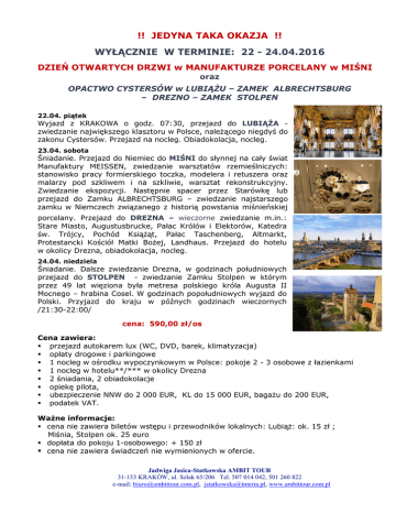 !! JEDYNA TAKA OKAZJA !! WYŁĄCZNIE W TERMINIE: 22 - 24.04.2016 DZIEŃ OTWARTYCH DRZWI w MANUFAKTURZE PORCELANY w MIŚNI oraz OPACTWO CYSTERSÓW w LUBIĄŻU – ZAMEK ALBRECHTSBURG – DREZNO – ZAMEK STOLPEN 22.04. piątek Wyjazd z KRAKOWA o godz. 07:30, przejazd do LUBIĄŻA zwiedzanie największego klasztoru w Polsce, należącego niegdyś do zakonu Cystersów. Przejazd na nocleg. Obiadokolacja, nocleg. 23.04. sobota Śniadanie. Przejazd do Niemiec do MIŚNI do słynnej na cały świat Manufaktury MEISSEN, zwiedzanie warsztatów rzemieślniczych: stanowisko pracy formierskiego toczka, modelera i retuszera oraz malarzy pod szkliwem i na szkliwie, warsztat rekonstrukcyjny. Zwiedzanie ekspozycji. Następnie spacer przez Starówkę lub przejazd do Zamku ALBRECHTSBURG – zwiedzanie najstarszego zamku w Niemczech związanego z historią powstania miśnieńskiej porcelany. Przejazd do DREZNA – wieczorne zwiedzanie m.in.: Stare Miasto, Augustusbrucke, Pałac Królów i Elektorów, Katedra św. Trójcy, Pochód Książąt, Pałac Taschenberg, Altmarkt, Protestancki Kościół Matki Bożej, Landhaus. Przejazd do hotelu w okolicy Drezna, obiadokolacja, nocleg. 24.04. niedziela Śniadanie. Dalsze zwiedzanie Drezna, w godzinach południowych przejazd do STOLPEN - zwiedzanie Zamku Stolpen w którym przez 49 lat więziona była metresa polskiego króla Augusta II Mocnego – hrabina Cosel. W godzinach popołudniowych wyjazd do Polski. Przyjazd do kraju w późnych godzinach wieczornych /21:30-22:00/ cena: 590,00 zł/os Cena zawiera: przejazd autokarem lux (WC, DVD, barek, klimatyzacja) opłaty drogowe i parkingowe 1 nocleg w ośrodku wypoczynkowym w Polsce: pokoje 2 - 3 osobowe z łazienkami 1 nocleg w hotelu**/*** w okolicy Drezna 2 śniadania, 2 obiadokolacje opiekę pilota, ubezpieczenie NNW do 2 000 EUR, KL do 15 000 EUR, bagażu do 200 EUR, podatek VAT. Ważne informacje: cena nie zawiera biletów wstępu i przewodników lokalnych: Lubiąż: ok. 15 zł ; Miśnia, Stolpen ok. 25 euro dopłata do pokoju 1-osobowego: + 150 zł cena nie zawiera świadczeń nie wymienionych w ofercie. Jadwiga Jasica-Statkowska AMBIT TOUR 31-153 KRAKÓW, ul. Szlak 65/206 Tel. 507 014 042, 501 260 822 e-mail: [email protected], [email protected], www.ambittour.com.pl