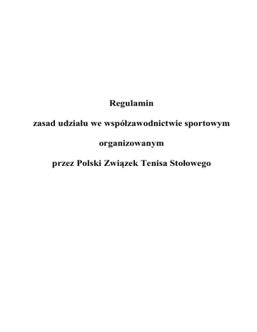 Regulamin zasad udziału we współzawodnictwie sportowym organizowanym przez Polski Związek Tenisa Stołowego Postanowienia ogólne. ....................................................................................................................................................... 3 Uprawnieni do udziału w rozgrywkach. ............................................................................................................................. 3 Rozgrywki klubowe. ......................................................................................................................................................... 4 Kategorie klubowego współzawodnictwa sportowego ................................................................................................ 4 Klasy rozgrywkowe ................................................................................................................................................... 4 Ranking..................................................................................................................................................................... 5 Licencja ligowa. ................................................................................................................................................................ 6 Nadawanie licencji ligowej. ........................................................................................................................................... 6 Warunki nadania licencji ligowej. .................................................................................................................................. 6 Wniosek o nadanie licencji klubowej. ............................................................................................................................ 6 Pozbawienie klubu sportowego licencji klubowej. .......................................................................................................... 6 Procedura związana z wydawaniem licencji ligowej. ...................................................................................................... 7 Przekazanie praw do dorobku ligowego (klasy rozgrywkowej). ...................................................................................... 7 Rozgrywki ligowe. Awanse. Spadki................................................................................................................................... 8 System rozgrywania meczy w rozgrywkach o tytuł klubowego Mistrza Polski we wszystkich klasach rozgrywkowych... 9 Rozgrywki o Puchar Polski. ......................................................................................................................................... 10 Drużynowe Mistrzostwa Polski Juniorów, Kadetów, Młodzików oraz OOM ................................................................... 11 Procedury Ligowe. .......................................................................................................................................................... 12 Warunki uczestnictwa w zawodach wszystkich szczebli. .............................................................................................. 12 Zawodnik. ............................................................................................................................................................... 12 Trenerzy, sędziowie ................................................................................................................................................. 13 Kary ligowe................................................................................................................................................................. 15 Kary regulaminowe za stosowanie nieprawidłowych rakietek....................................................................................... 16 Badanie prawidłowości stosowanych rakietek. ............................................................................................................. 18 Rozgrywki indywidualne. ................................................................................................................................................ 19 Kategorie wiekowe. ..................................................................................................................................................... 19 Licencja zawodnicza. .................................................................................................................................................. 19 Nadawanie licencji zawodnika ................................................................................................................................. 19 Warunki nadania licencji zawodnika. ....................................................................................................................... 19 Wniosek o nadanie licencji zawodnika ..................................................................................................................... 20 Pozbawienie zawodnika licencji. .............................................................................................................................. 20 Turnieje klasyfikacyjne. .................................................................................................................................................. 21 Ogólnopolskie Turnieje Klasyfikacyjne. ................................................................................................................... 21 Punktacja rankingowa. ............................................................................................................................................. 24 Turniej OTK dla juniorów, kadetów i młodzików. ........................................................................................................... 25 Zmiana przynależności klubowych, wypożyczeń, zwolnień okresowych i potwierdzeń zgłoszeń zawodników. ................. 26 Sędziowie. ...............................