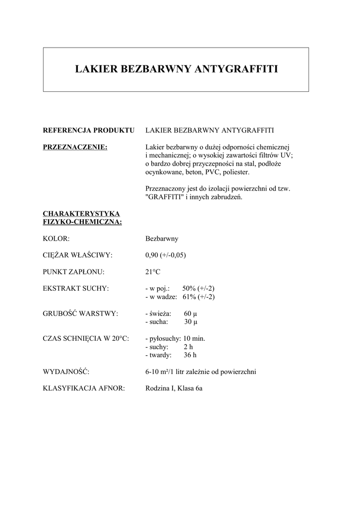 LAKIER BEZBARWNY ANTYGRAFFITI REFERENCJA PRODUKTU LAKIER BEZBARWNY ANTYGRAFFITI PRZEZNACZENIE: Lakier bezbarwny o dużej odporności chemicznej i mechanicznej; o wysokiej zawartości filtrów UV; o bardzo dobrej przyczepności na stal, podłoże ocynkowane, beton, PVC, poliester. Przeznaczony jest do izolacji powierzchni od tzw. "GRAFFITI" i innych zabrudzeń. CHARAKTERYSTYKA FIZYKO-CHEMICZNA: KOLOR: Bezbarwny CIĘŻAR WŁAŚCIWY: 0,90 (+/-0,05) PUNKT ZAPŁONU: 21°C EKSTRAKT SUCHY: - w poj.: 50% (+/-2) - w wadze: 61% (+/-2) GRUBOŚĆ WARSTWY: - świeża: - sucha: CZAS SCHNIĘCIA W 20°C: - pyłosuchy: 10 min. - suchy: 2h - twardy: 36 h WYDAJNOŚĆ: 6-10 m²/1 litr zależnie od powierzchni KLASYFIKACJA AFNOR: Rodzina I, Klasa 6a 60 µ 30 µ LAKIERBEZBARWNY BEZBARWNYANTYGRAFFITI ANTYGRAFFITI LAKIER SPOSÓB UŻYCIA: PROPORCJA MIESZANIA: 5:1 Lakier bezbarwny antygraffiti Utwardzacz CATALYSEUR N Rozpuszczalnik 451 100 20 0-15 WARUNKI APLIKACJI - temp.10°C > T < 35°C - wilgotność: < 80% APLIKACJA: Pędzlem, pistoletem, airless, elektrostatycznie PISTOLET PNEUMATYCZNY Dysza : 1-1,5 Ciśnienie: 3,5-4,5 barów PISTOLET HVLP Dysza: 1,2 Ciśnienie: 0,8 bara GĘSTOŚĆ W 20°C: 120 s (+/-20 s) kubek AFNOR nr 4 OPAKOWANIE: 5 i 25 L TRWAŁOŚĆ MIESZANKI DO UŻYCIA 4 h przy 20°C PRZYGOTOWANIE POWIERZCHNI: UWAGI: Powierzchnia musi być sucha, odtłuszczona, bez śladów korozji. Nie lakierować przy dużej wilgotności lub na murach wilgotnych - warstwa nawierzchniowa staje się mleczna. Przy lakierowaniu pędzlem używać rozpuszczalnika wolnego. Po 8 dniach schnięcia, warstwa nie reaguje na rozpuszczalniki. Brud lub "graffiti" mogą być usuwane poprzez ścieranie szmatką nasączoną specjalnym środkiem firmy MONOPOL do usuwania "graffiti". Po kilku czyszczeniach należy nałożyć dodatkową warstwę lakieru antygraffiti.