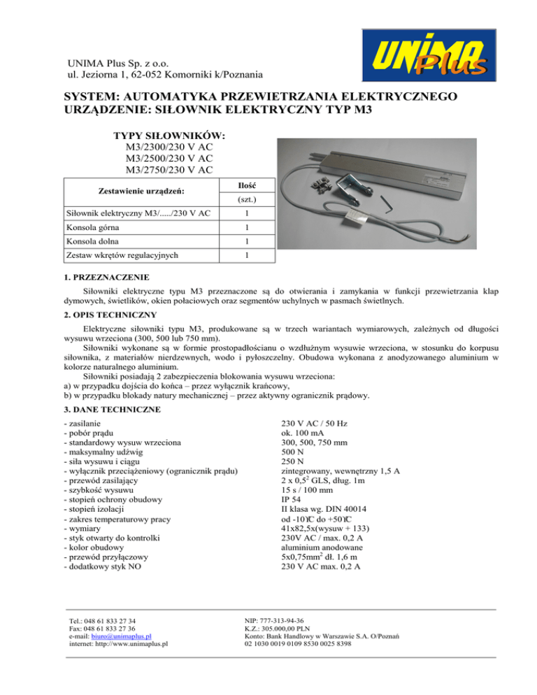 Plus UNIMA Plus Sp. z o.o. ul. Jeziorna 1, 62-052 Komorniki k/Poznania SYSTEM: AUTOMATYKA PRZEWIETRZANIA ELEKTRYCZNEGO URZĄDZENIE: SIŁOWNIK ELEKTRYCZNY TYP M3 TYPY SIŁOWNIKÓW: M3/2300/230 V AC M3/2500/230 V AC M3/2750/230 V AC Zestawienie urządzeń: Ilość (szt.) Siłownik elektryczny M3/...../230 V AC 1 Konsola górna 1 Konsola dolna 1 Zestaw wkrętów regulacyjnych 1 1. PRZEZNACZENIE Siłowniki elektryczne typu M3 przeznaczone są do otwierania i zamykania w funkcji przewietrzania klap dymowych, świetlików, okien połaciowych oraz segmentów uchylnych w pasmach świetlnych. 2. OPIS TECHNICZNY Elektryczne siłowniki typu M3, produkowane są w trzech wariantach wymiarowych, zależnych od długości wysuwu wrzeciona (300, 500 lub 750 mm). Siłowniki wykonane są w formie prostopadłościanu o wzdłużnym wysuwie wrzeciona, w stosunku do korpusu siłownika, z materiałów nierdzewnych, wodo i pyłoszczelny. Obudowa wykonana z anodyzowanego aluminium w kolorze naturalnego aluminium. Siłowniki posiadają 2 zabezpieczenia blokowania wysuwu wrzeciona: a) w przypadku dojścia do końca – przez wyłącznik krańcowy, b) w przypadku blokady natury mechanicznej – przez aktywny ogranicznik prądowy. 3. DANE TECHNICZNE - zasilanie - pobór prądu - standardowy wysuw wrzeciona - maksymalny udźwig - siła wysuwu i ciągu - wyłącznik przeciążeniowy (ogranicznik prądu) - przewód zasilający - szybkość wysuwu - stopień ochrony obudowy - stopień izolacji - zakres temperaturowy pracy - wymiary - styk otwarty do kontrolki - kolor obudowy - przewód przyłączowy - dodatkowy styk NO Tel.: 048 61 833 27 34 Fax: 048 61 833 27 36 e-mail: [email protected] internet: http://www.unimaplus.pl 230 V AC / 50 Hz ok. 100 mA 300, 500, 750 mm 500 N 250 N zintegrowany, wewnętrzny 1,5 A 2 x 0,52 GLS, dług. 1m 15 s / 100 mm IP 54 II klasa wg. DIN 40014 od -10°C do +50°C 41x82,5x(wysuw + 133) 230V AC / max. 0,2 A aluminium anodowane 5x0,75mm2 dł. 1,6 m 230 V AC max. 0,2 A NIP: 777-313-94-36 K.Z.: 305.000,00 PLN Konto: Bank Handlowy w Warszawie S.A. O/Poznań 02 1030 0019 0109 8530 0025 8398 Plus UNIMA Plus Sp. z o.o. ul. Jeziorna 1, 62-052 Komorniki k/Poznania 4 BADANIA, WYMOGI NORMOWE Siłowniki M3 zgodnie z oświadczeniem producenta spełniają wymogi klasy ochronności II. Normy właściwe nie przewidują połączenia przewodu ochronnego z urządzeniami przemysłowymi klasy ochronności II. Siłowniki M3 spełniają wymogi poniższych norm: a) VDE 0106 - Część I – „Ochrona przeciwko porażeniu prądem. Klasyfikacja urządzeń przemysłowych elektrycznych i elektronicznych”, b) VDE 0160 – „Wyposażenie urządzeń elektroenergetycznych w elektroniczne urządzenia przemysłowe”, c) VDE 0700 – Część I – „Zabezpieczenie urządzeń elektrycznych do sterowania ręcznego lub podobnego. Część I – wymogi ogólne”, d) VDE 0700 – Część 238 – „Zabezpieczenie urządzeń elektrycznych do sterowania ręcznego lub podobnego. Część 238 – Napędy dla okien, drzwi, bram i urządzeń podobnych”. Siłowniki zostały pozytywnie przebadane pod względem stopnia ochrony przed porażeniem elektrycznym przez Polskie Centrum Akredytacji (Laboratorium Badania Jakości i Wzorcowania Wyrobów Elektronicznych) sprawozdanie z badań nr 37/02. 5. SCHEMAT PODŁĄCZEŃ 5.1. Obwód z jednym siłownikiem S IŁO W N IK M 3 /.... 2 30 V A C M1 czerw . nie b. b rąz b ia ły bia ły N L P R ZY C IS K P R Z E W . P P -33 P R Z Y C IS K P R Z E W . P P -33 5.2. Obwód grupowy max. 10 siłowników Tel.: 048 61 833 27 34 Fax: 048 61 833 27 36 e-mail: [email protected] internet: http://www.unimaplus.pl NIP: 777-313-94-36 K.Z.: 305.000,00 PLN Konto: Bank Handlowy w Warszawie S.A. O/Poznań 02 1030 0019 0109 8530 0025 8398 Plus UNIMA Plus Sp. z o.o. ul. Jeziorna 1, 62-052 Komorniki k/Poznania SIŁOWNIK M3/.... 230 V AC SIŁOWNIK M3/.... 230 V AC M1 SIŁOWNIK M3/.... 230 V AC M2 czerw. nieb. brąz biały biały M10 czerw. nieb. brąz biały biały czerw. nieb. brąz biały biały N L PRZYCISK PRZEW. PP-33 PRZYCISK PRZEW. PP-33 Koszty dojazdu oraz montażu ustalane indywidualnie. Szczegółowe informacje – tel. 603 706 152, 603 555 234. Tel.: 048 61 833 27 34 Fax: 048 61 833 27 36 e-mail: [email protected] internet: http://www.unimaplus.pl NIP: 777-313-94-36 K.Z.: 305.000,00 PLN Konto: Bank Handlowy w Warszawie S.A. O/Poznań 02 1030 0019 0109 8530 0025 8398 PRZYCISK PRZEW. PP-33