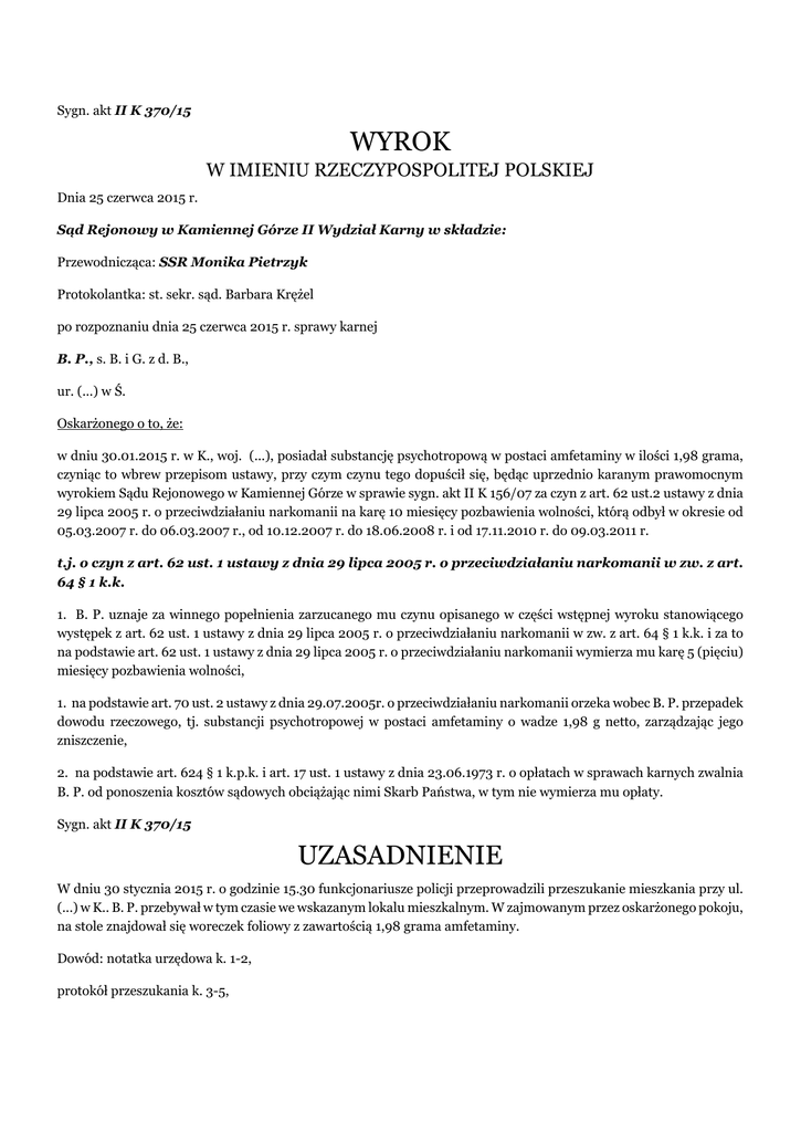 Sygn. akt II K 370/15 WYROK W IMIENIU RZECZYPOSPOLITEJ POLSKIEJ Dnia 25 czerwca 2015 r. Sąd Rejonowy w Kamiennej Górze II Wydział Karny w składzie: Przewodnicząca: SSR Monika Pietrzyk Protokolantka: st. sekr. sąd. Barbara Krężel po rozpoznaniu dnia 25 czerwca 2015 r. sprawy karnej B. P., s. B. i G. z d. B., ur. (...) w Ś. Oskarżonego o to, że: w dniu 30.01.2015 r. w K., woj. (...), posiadał substancję psychotropową w postaci amfetaminy w ilości 1,98 grama, czyniąc to wbrew przepisom ustawy, przy czym czynu tego dopuścił się, będąc uprzednio karanym prawomocnym wyrokiem Sądu Rejonowego w Kamiennej Górze w sprawie sygn. akt II K 156/07 za czyn z art. 62 ust.2 ustawy z dnia 29 lipca 2005 r. o przeciwdziałaniu narkomanii na karę 10 miesięcy pozbawienia wolności, którą odbył w okresie od 05.03.2007 r. do 06.03.2007 r., od 10.12.2007 r. do 18.06.2008 r. i od 17.11.2010 r. do 09.03.2011 r. t.j. o czyn z art. 62 ust. 1 ustawy z dnia 29 lipca 2005 r. o przeciwdziałaniu narkomanii w zw. z art. 64 § 1 k.k. 1. B. P. uznaje za winnego popełnienia zarzucanego mu czynu opisanego w części wstępnej wyroku stanowiącego występek z art. 62 ust. 1 ustawy z dnia 29 lipca 2005 r. o przeciwdziałaniu narkomanii w zw. z art. 64 § 1 k.k. i za to na podstawie art. 62 ust. 1 ustawy z dnia 29 lipca 2005 r. o przeciwdziałaniu narkomanii wymierza mu karę 5 (pięciu) miesięcy pozbawienia wolności, 1. na podstawie art. 70 ust. 2 ustawy z dnia 29.07.2005r. o przeciwdziałaniu narkomanii orzeka wobec B. P. przepadek dowodu rzeczowego, tj. substancji psychotropowej w postaci amfetaminy o wadze 1,98 g netto, zarządzając jego zniszczenie, 2. na podstawie art. 624 § 1 k.p.k. i art. 17 ust. 1 ustawy z dnia 23.06.1973 r. o opłatach w sprawach karnych zwalnia B. P. od ponoszenia kosztów sądowych obciążając nimi Skarb Państwa, w tym nie wymierza mu opłaty. Sygn. akt II K 370/15 UZASADNIENIE W dniu 30 stycznia 2015 r. o godzinie 15.30 funkcjonariusze policji przeprowadzili przeszukanie mieszkania przy ul. (...) w K.. B. P. przebywał w tym czasie we wskazanym lokalu mieszkalnym. W zajmowanym przez oskarżonego pokoju, na stole znajdował się woreczek foliowy z zawartością 1,98 grama amfetaminy. Dowód: notatka urzędowa k. 1-2, protokół przeszukania k. 3-5, protokół użycia wagi k. 6, protokół użycia testera narkotykowego k. 7, wyjaśnienia B. P. k. 12, 96; Oskarżony nie cierpi na chorobę psychiczną oraz na niedorozwój umysłowy, wykazuje on osobowość nieprawidłową z cechami osobowości dyssocjalnej. W chwili czynu, miał on zachowaną zdolność rozpoznania jego znaczenia i pokierowania swoim postępowaniem. B. P. uzależniony jest od alkoholu i nadużywa spożywanie amfetaminy, w sposób co najmniej szkodliwy. Dowód: wyjaśnienia B. P. k. 12, opinia sądowo-psychiatryczna k. 46-47, kwestionariusz zebrania informacji przez specjalistę terapii uzależnień k. 53-63; B. P. był dotychczas wielokrotnie karany sądownie, w tym dwukrotnie za występek z art. 62 ust. 1 ustawy o przeciwdziałaniu narkomanii. Ponadto przypisanego mu czynu dopuścił się będąc uprzednio karanym prawomocnym wyrokiem Sądu Rejonowego w Kamiennej Górze w sprawie sygn. akt II K 156/07 za czyn z art. 62 ust.2 ustawy z dnia 29 lipca 2005 r. o przeciwdziałaniu narkomanii na karę 10 miesięcy pozbawienia wolności, którą odbył w okresie od 05.03.2007 r. do 06.03.2007 r., od 10.12.2007 r. do 18.06.2008 r. i od 17.11.2010 r. do 09.03.2011 r. Dowód: karta karna k. 24-26, odpisy wyroków k. 77-80; B. P. został oskarżony o dokonanie występku z art. 62 ust. 1 ustawy z dnia 29 lipca 2005 roku o przeciwdziałaniu narkomanii w zw. z art. 64 § 1 k.k., zagrożonego karą do 4 lat i 6 miesięcy pozbawienia wolności, zatem nieprzekraczającą 10 lat pozbawienia wolności. Przesłuchany w charakterze podejrzanego B. P. przyznał się do popełnienia zarzucanego mu czynu i złożył wyjaśnienia, w których potwierdził, posiadanie substancji psychotropowej w postaci amfetaminy oraz wskazał, że traktuje tą substancję jak lek na depresję. Następnie oskarżony zawnioskował o wydanie wyroku skazującego bez przeprowadzania rozprawy i wyraził zgodę na wymierzenie mu kary 5 miesięcy pozbawienia wolności oraz orzeczenie środka karnego w postaci substancji psychotropowej w postaci amfetaminy, wniósł też o zwolnienie go od ponoszenia kosztów i opłaty (k. 96 akt sprawy). Prokurator umieścił w akcie oskarżenia wniosek o wydanie wyroku skazującego i orzeczenie uzgodnionych z oskarżonym kary i środków karnych bez przeprowadzania rozprawy. Dla wydania wyroku w trybie wnioskowanym przez oskarżyciela publicznego niezbędne jest spełnienie wszystkich przesłanek wymienionych w przepisie art. 335 § 1 k.p.k. Zdaniem Sądu wszystkie te przesłanki zostały spełnione. Prokurator uzgodnił z oskarżonym karę i środki karne za popełnione przez niego przestępstwo, t.j. występek zagrożony karą nieprzekraczającą 10 lat pozbawienia wolności. Następnie umieścił w akcie oskarżenia wniosek o wydanie wyroku skazującego i orzeczenie uzgodnionych z oskarżonym kary i środków karnych. Okoliczności popełnienia przez oskarżonego przestępstwa nie budzą wątpliwości. Pozwalają je ustalić wiarygodne wyjaśnienia oskarżonego oraz dowody z dokumentów, w tym przede wszystkim protokół przeszukania i protokół użycia testera narkotykowego, które potwierdziły, że w dniu 30 stycznia 2015 roku oskarżony znajdował się w posiadaniu substancji psychotropowej w postaci amfetaminy. Dowody z dokumentów, w tym z pełnej i jasnej opinii biegłych, dla Sądu są w pełni wiarygodni. Wiarygodności tych dowodów nie kwestionował również sam oskarżony. Cele postępowania karnego w obliczu zawnioskowanej przez Prokuratora kary i środka karnego zostaną osiągnięte pomimo nie przeprowadzenia rozprawy. Okolicznością łagodzącą wobec oskarżonego jest to, że substancję psyc
