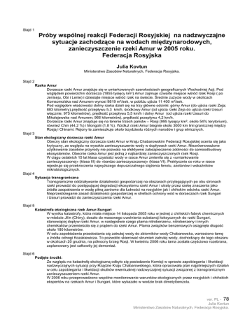 Slajd 1 Próby wspólnej reakcji Federacji Rosyjskiej na nadzwyczajne sytuacje zachodzące na wodach międzynarodowych, zanieczyszczenie rzeki Amur w 2005 roku. Federacja Rosyjska Julia Kovtun Ministerstwo Zasobów Naturalnych, Federacja Rosyjska. Slajd 2 Rzeka Amur Dorzecze rzeki Amur znajduje się w umiarkowanych szerokościach geograficznych Wschodniej Azji. Pod względem powierzchni dorzecza (1855 tysięcy km²) Amur zajmuje czwarte miejsce wśród rzek Rosji ( po Jeniseju, Obi i Lenie) i dziesiąte miejsce wśród rzek na świecie. Średnie zużycie wody w okolicach Komsomolska nad Amurem wynosi 9819 m³/sek, w pobliżu ujścia 11 400 m³/sek. Pod względem właściwości doliny rzeka dzieli się na trzy główne odcinki: górny Amur (do ujścia rzeki Zeja; 883 kilometry),prędkość przepływu 5,3 km/h, środkowy Amur (od ujścia rzeki Zeja do ujścia rzeki Ussuri włącznie; 975 kilometrów), prędkość przepływu 5,5 km/h i dolny Amur (od ujścia rzeki Ussuri do Mikołajewska nad Amurem; 966 kilometrów), prędkość przepływu 4,2 km/h. Dorzecze rzeki Amur znajduje się na terenie trzech państw – Rosji (995 tysięcy km², około 54% terytorium), również Chin (44,2 %) i Mongolii (1,8 %). Wzdłuż rzeki Amur biegnie około 3000 km linii granicznej między Rosją i Chinami. Rejony te zamieszkuje około trzydziestu różnych narodów i grup etnicznych. Slajd 3 Stan ekologiczny dorzecza rzeki Amur Obecny stan ekologiczny dorzecza rzeki Amur w Kraju Chabarowskim Federacji Rosyjskiej ocenia się jako krytyczny, ze względu na wysokie zanieczyszczenie wody w dopływach rzeki Amur. Niezrównoważone użytkowanie zasobów przyrody nie pozwala na efektywne zabezpieczenie zdolności do samoodbudowy ekosystemów. Obecnie rzeka Amur jest jedną z najbardziej zanieczyszczonych rzek Rosji. W ciągu ostatnich 15 lat klasa czystości wody w rzece Amur zmieniła się z «umiarkowanie zanieczyszczonej» (klasa III) do «bardzo zanieczyszczonej» (klasa VI). Praktycznie co roku w rzece rejestruje się przekroczenia najwyższego dopuszczalnego stężenia fenolu, azotanów i wskaźników mikrobiologicznych. Slajd 4 Sytuacja transgraniczna Transgraniczne oddziaływanie działalności gospodarczej na obszarach przylegających po obu stronach rzeki prowadzi do postępującej degradacji ekosystemu rzeki Amur i utraty przez rzekę znaczenia jako źródła zaopatrzenia w wodę pitną zarówno dla ludności na rosyjskim jak i chińskim odcinku rzeki Amur. Nieprzestrzeganie zasad działalności gospodarczej w strefach ochrony wód w dorzeczach rzek Sungari i Ussuri prowadzi do zanieczyszczenia rzeki Amur. Slajd 5 Katastrofa ekologiczna rzek Amur-Sungari W wyniku katastrofy, która miała miejsce 14 listopada 2005 roku w jednej z chińskich fabryk chemicznych w mieście Jilin (Chiny), doszło do masowego uwolnienia substancji toksycznych do rzeki Sungari, stanowiącej dopływ rzeki Amur, w następstwie czego plama nitrobenzenu, nitrobenzeny i innych chemikaliów przemieściła się z prądem do rzeki Amur. Plama związków benzenowych osiągnęła długość około 180 kilometrów. W celu zapobieżenia przedostania się zatrutej wody do zbiorników wody Chabarowska, wzniesiono tamę u źródła odnogi Kozakiewicza. To pozwoliło skierować strumień zatrutej wody, dochodzący do tego obszaru w okolicach 20 grudnia, na północny brzeg Rosji. W kwietniu 2006 roku tama została częściowo rozebrana, zaplanowany jest całkowity jej demontaż. Slajd 6 Podjęte środki: Ze względu na katastrofę ekologiczną odbyło się posiedzenie Komisji w sprawie zapobiegania i likwidacji nadzwyczajnych sytuacji przy Rządzie Kraju Chabarowskiego, która opracowała plan najpilniejszych działań w celu zapobiegania i likwidacji skutków ewentualnej nadzwyczajnej sytuacji związanej z transgranicznym zanieczyszczeniem rzeki Amur. W 2006 roku przeprowadzono wspólne monitorowanie warunków ekologicznych przez rosyjskich i chińskich ekspertów na rzekach Amur i Sungari, które wykazało w wodzie brak dimetylbenzolu. ver. PL - 78 Julia Kovtun Ministerstwo Zasobów Naturalnych, Federacja Rosyjska. Slajd 7 Rosyjsko-chińska współpraca (1) Założono Wspólną Komisję do spraw racjonalnego wykorzystania i ochrony zasobów wód transgranicznych. W okresie od 26 do 28 grudnia 2008 roku w mieście Chabarowsk przedstawiciel Federalnej Służby ds. Hydrometeorologii i Monitoringu Środowiska Naturalnego wziął udział w posiedzeniu Wspólnej Rosyjsko-chińskiej Komisji do spraw racjonalnego wykorzystania i ochrony zasobów wód transgranicznych, w celu koordynowania realizacji Porozumienia pomiędzy Rządem Federacji Rosyjskiej, a Rządem Chińskiej Republiki Ludowej o racjonalnym wykorzystaniu i ochronie zasobów wód transgranicznych. Slajd 8 Rosyjsko-chińska współpraca (2) Na posiedzeniu На заседании Wspólnej Rosyjsko-chińskiej Komisji rozpatrywano: Projekt ustawy o porządku prac Wspólnej Rosyjsko-chińskiej Komisji do spraw racjonalnego wykorzystania i ochrony zasobów wód transgranicznych , w którym zapisano najważniejsze zadania, funkcje Komisji, jej skład i strukturę; Skład Komisji strony Rosyjskiej i Chińskiej; Plan prac Komisji na 2009 rok, w którym strony porozumiały się do wzajemnych działań w sprawie tworzenia grup roboczych, przygotowania dokumentów w sprawie wspólnego monitorowania czystości wód transgranicznych, przygotowania materiałów o sieci stacji monitoringu hydrologicznego i organizacji drugiego posiedzenia Komisji, które zaplanowano na październik 2009 roku w mieście Hangzhou (Chiny). Slajd 9 Rosyjsko-chińska współpraca (3) 29 stycznia 2008 roku Federacja Rosyjska i Chiny podpisały Międzyrządowe porozumienie o ochronie i użytkowaniu wód transgranicznych. Najważniejsze obszary współpracy w ramach porozumienia z Chinami to: Opracowanie wspólnych norm i docelowych wskaźników jakości wód transgranicznych; Pomoc w zastosowaniu współczesnych technologii 