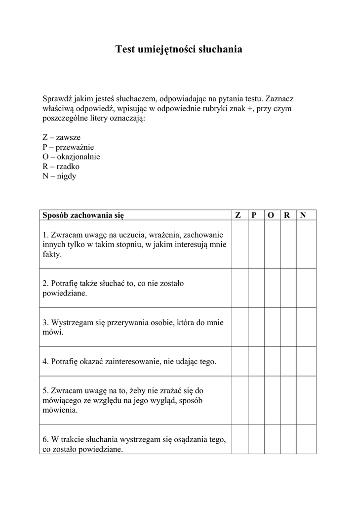 Test umiejętności słuchania Sprawdź jakim jesteś słuchaczem, odpowiadając na pytania testu. Zaznacz właściwą odpowiedź, wpisując w odpowiednie rubryki znak +, przy czym poszczególne litery oznaczają: Z – zawsze P – przeważnie O – okazjonalnie R – rzadko N – nigdy Sposób zachowania się 1. Zwracam uwagę na uczucia, wrażenia, zachowanie innych tylko w takim stopniu, w jakim interesują mnie fakty. 2. Potrafię także słuchać to, co nie zostało powiedziane. 3. Wystrzegam się przerywania osobie, która do mnie mówi. 4. Potrafię okazać zainteresowanie, nie udając tego. 5. Zwracam uwagę na to, żeby nie zrażać się do mówiącego ze względu na jego wygląd, sposób mówienia. 6. W trakcie słuchania wystrzegam się osądzania tego, co zostało powiedziane. Z P O R N 7. Próbuję zwrócić uwagę na zachowanie mówiącego, na to, co mówi jego ciało. 8. Nie przeszkadzam mówiącemu. 9. Koncentruję się na słuchaniu, odwracam swoją uwagę od innych rzeczy. 10. Potrafię słuchać kogoś, kto wypowiada się z trudnością, powtarza się. 11. Jako słuchający używam pozasłownej komunikacji: śmiech, spojrzenie w oczy, przytakiwanie. 12. Potrafię krótko podsumować wypowiedź, żeby sprawdzić, czy właściwie ją rozumiem. 13. Kiedy nie dociera do mnie to, co ktoś mówi przyznaję się do tego i proszę o wyjaśnienie. 14. Słuchając zwracam uwagę na to, czego mogę nauczyć się od mówiącego. Przez połączenie jedną linią odpowiedzi otrzymasz wykres umiejętności słuchania. Im bardziej linia wykresu zbliżać się będzie do lewej strony, tym lepiej potrafisz słuchać. Test umiejętności mówienia. Odpowiadając, zaznacz jedną z możliwych odpowiedzi, wpisując w odpowiedniej rubryce znak +, przy czym odpowiednie litery oznaczają: N – nigdy R – rzadko O – okazjonalnie P – przeważnie Z – zawsze Sposób zachowania się 1. Jeśli mówię do kogoś o czymś, to wiem, po co mówię i jaki cel chcę osiągnąć. 2. Kontroluję stan uczuć i emocji podczas mówienia. 3. Obserwuję uczucia rozmówcy, z którym rozmawiam. 4. Interesuję się tym, czy i jak jestem słuchany/ słuchana. 5. Zwracam uwagę na mowę ciała, spojrzenie, wyraz twarzy, mimikę, gestykulację. 6. Mówię wyraźnie, zrozumiale i nie za szybko. 7. Unikam zbyt długich zdań i nadmiaru określeń w wypowiedziach. Z P O R N 8. Posługuję się wyrazami konkretnymi, unikając abstrakcyjnych. 9. Zwracam uwagę na swoją gestykulację i mimikę. 10. Mówiąc, patrzę w oczy słuchaczowi, przyglądam się jemu. Połącz linią ciągłą każdy z punktów zaznaczonych odpowiedzi. Uzyskasz w ten sposób wykres twoich umiejętności mówienia. Im bardziej linia wykresu zbliżać się będzie do prawej strony tabeli, tym sprawniejszym jesteś mówcą. Źródło: E. Karney za: Nocuń A. W., Szmagalski J., Podstawowe umiejętności w pracy socjalnej i ich kształcenie, Katowice 1998r.