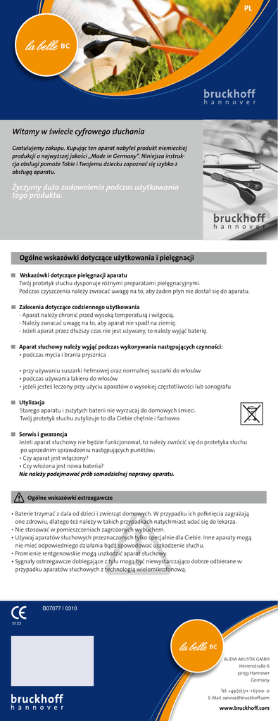 PL bc Witamy w świecie cyfrowego słuchania Gratulujemy zakupu. Kupując ten aparat nabyłeś produkt niemieckiej produkcji o najwyższej jakości „Made in Germany“. Niniejsza instrukcja obsługi pomoże Tobie i Twojemu dziecku zapoznać się szybko z obsługą aparatu. Życzymy dużo zadowolenia podczas użytkowania tego produktu. Ogólne wskazówki dotyczące użytkowania i pielęgnacji Wskazówki dotyczące pielęgnacji aparatu Twój protetyk słuchu dysponuje różnymi preparatami pielęgnacyjnymi. Podczas czyszczenia należy zwracać uwagę na to, aby żaden płyn nie dostał się do aparatu. Zalecenia dotyczące codziennego użytkowania - Aparat należy chronić przed wysoką temperaturą i wilgocią. - Należy zwracać uwagę na to, aby aparat nie spadł na ziemię. - Jeżeli aparat przez dłuższy czas nie jest używany, to należy wyjąć baterię. Aparat słuchowy należy wyjąć podczas wykonywania następujących czynności: • podczas mycia i brania prysznica • przy używaniu suszarki hełmowej oraz normalnej suszarki do włosów • podczas używania lakieru do włosów • jeżeli jesteś leczony przy użyciu aparatów o wysokiej częstotliwości lub sonografu Utylizacja Starego aparatu i zużytych baterii nie wyrzucaj do domowych śmieci. Twój protetyk słuchu zutylizuje to dla Ciebie chętnie i fachowo. Serwis i gwarancja Jeżeli aparat słuchowy nie będzie funkcjonował, to należy zwrócić się do protetyka słuchu po uprzednim sprawdzeniu następujących punktów: • Czy aparat jest włączony? • Czy włożona jest nowa bateria? Nie należy podejmować prób samodzielnej naprawy aparatu. Ogólne wskazówki ostrzegawcze • Baterie trzymać z dala od dzieci i zwierząt domowych. W przypadku ich połknięcia zagrażają one zdrowiu, dlatego też należy w takich przypadkach natychmiast udać się do lekarza. • Nie stosować w pomieszczeniach zagrożonych wybuchem. • Używaj aparatów słuchowych przeznaczonych tylko specjalnie dla Ciebie. Inne aparaty mogą nie mieć odpowiedniego działania bądź spowodować uszkodzenie słuchu. • Promienie rentgenowskie mogą uszkodzić aparat słuchowy. • Sygnały ostrzegawcze dobiegające z tyłu mogą być niewystarczająco dobrze odbierane w przypadku aparatów słuchowych z technologią wielomikrofonową. B07077 | 0310 0123 bc AUDIA AKUSTIK GMBH Herrenstraße 6 30159 Hannover Germany Tel: +49 (0) 511 - 1 67 00 - 0 E-Mail: [email protected] www.bruckhoff.com Instrukcja obslugi Elementy obsługi Przy pomocy tych części aparatu słuchowego można łatwo samemu nastawić specjalne funkcje. Zauszniki okularów Gniazdo do programowania B1 Włącznik/ Wyłącznik B2 Kieszeń baterii C Regulator gło- śności A Click-Sytem D Przycisk wyboru progra- Słuchawka kostna mów słuchania A Click-System B1 B2 Włączanie i wyłączanie aparatu słuchowego Włączanie i wyłączanie aparatu słuchowego jest bardzo proste. Jeżeli pokrywa kieszeni baterii jest zamknięta, to aparat jest automatycznie włączony. Wyłączenie aparatu następuje poprzez otwarcie pokrywy kieszeni baterii. Pokrywa kieszeni baterii Włączony Wyłączony 1. Wymiana baterii Otwórz kieszeń baterii. Wyjmij baterię z kieszeni za pomocą załączonego magnetycznego sztyftu. Obudowa Sztyft magnetyczny Wymiana baterii 2. Włóż baterię Włóż nową baterię (typ 312) znakiem „+“ do góry albo bezpośrednio do obudowy albo do magnetycznej pokrywy kieszeni i zamknij kieszeń – aparat słuchowy jest automatycznie włączony! C 2. Pokrywa kieszeni baterii + - Typ 312 Regulator głośności Przy pomocy regulatora głośności nastawić można indywidualnie żądany poziom głośności aparatu słuchowego. lewy aparat D 1. głośno cicho głośno cicho Przycisk zmiany programów słuchania Poprzez naciśnięcie przycisku wyboru programów słuchania można nastawić programy słuchania ustalone przez protetyka aparatów słuchowych. Przycisk wyboru programów słuchania prawy aparat
