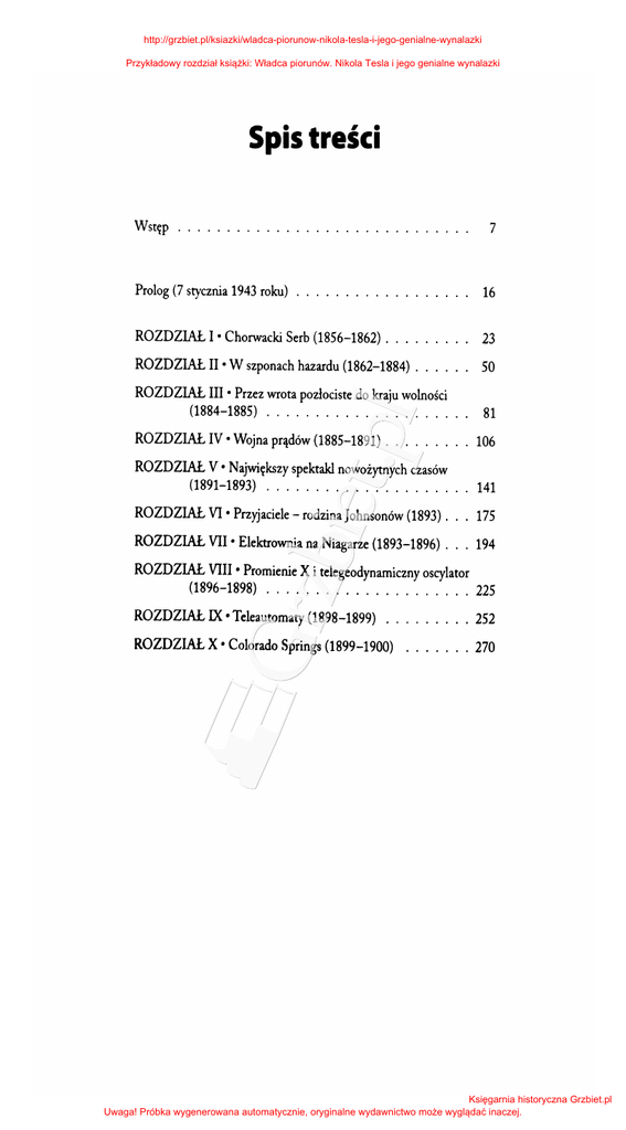http://grzbiet.pl/ksiazki/wladca-piorunow-nikola-tesla-i-jego-genialne-wynalazki Przykładowy rozdział książki: Władca piorunów. Nikola Tesla i jego genialne wynalazki Spis treści Wstęp ........................ ... ... 7 Prolog (7 stycznia 1943 roku) . . . . . . . . . . . . . . . . . . 16 ROZDZIAŁ I· Chorwacki Serb (1856-1862) . . . . . . . . . 23 ROZDZIAŁ II • W szponach hazardu (1862-1884) . . . . . . 50 ROZDZIAŁ III • Przez wrota pozłociste do kraju wolności (1884-1885) . . . . . . . . . . . . . . . . . . . . . 81 ROZDZIAŁ IV • Wojna prądów (1885-1891) . . . . . . . . . 106 ROZDZIAŁ V • Największy spektakl nowożytnych czasów (1891-1893) . . . . . . . . . . . . . . . . . . . . . 141 ROZDZIAŁ VI • Przyjaciele- rodzina Johnsonów (1893) ... 175 ROZDZIAŁ VII· Elektrownia na Niagarze (1893-1896) ... 194 ROZDZIAŁ VIII • Promienie X i telegeodynamiczny oscylator (1896-1898) . . . . . . . . . . . . . . . . . . . . . 225 ROZDZIAŁ IX • Teleautomaty (1898-1899) ROZDZIAŁ X • Colorado . . . . . . . . . 252 Springs (1899-1900) ....... 270 Księgarnia historyczna Grzbiet.pl Uwaga! Próbka wygenerowana automatycznie, oryginalne wydawnictwo może wyglądać inaczej. http://grzbiet.pl/ksiazki/wladca-piorunow-nikola-tesla-i-jego-genialne-wynalazki Przykładowy rozdział książki: Władca piorunów. Nikola Tesla i jego genialne wynalazki "Wieża ROZDZIAŁ XI • ROZDZIAŁ XII • O "Wardenc\yffe ( 1. 900-1.91. 2) . włos od Nagrody Nobla (1. 91.2-1. 91.7) XIII • IU.dio Detection and Ranging, czyli radar ..... . (1917-1920) ROZDZIAŁ Biała gołębica .. ROZDZIAŁ XIV· ROZDZIAŁ XV • Promienie ROZDZIAŁ XVI • Wizyta króla Piotra (193'0-1943) ROZDZIAŁ XVII· SekreryTesli (1920-1.925) śmierci. (1.925-193'0) Patenty Tesli . . . . . . . . . . . . . . . . . . . . . . . . . Literatura Indeks nazwisk Księgarnia historyczna Grzbiet.pl Uwaga! Próbka wygenerowana automatycznie, oryginalne wydawnictwo może wyglądać inaczej. http://grzbiet.pl/ksiazki/wladca-piorunow-nikola-tesla-i-jego-genialne-wynalazki Przykładowy rozdział książki: Władca piorunów. Nikola Tesla i jego genialne wynalazki Wstęp XIX stulecie nazwano wiekiem pary i elektryczności. Jego to łuczywo i świece, dyliżanse i żaglowce, gołębie pocztowe i konni posłańcy. Kilkadziesiąt lat później ludz kość znała już żarówkę, linie kolejowe, parowce, profesjo nalne elektrownie, silniki trójfazowe, fotografię, kino, telegraf i telefon. Znała i powszechnie stosowała. Maszyna parowa, urządzenia elektryczne i inne wynalazki odmieniły życie mi lionów ludzi na całym świecie. Pierwsza połowa XIX wieku to czas pary i maszyny pa rowej, której historia sięga jeszcze początków poprzedniego stulecia. Pierwsze doświadczenie obrazujące wielkie moż liwości i energię pary wodnej wykonał francuski matema tyk Florence Rivault. Ten szambelan Henryka IV i nauczy ciel Ludwika XIII w 1605 roku napełnił wodą wydrążoną w środku, grubościenną metalową kulę. Następnie zamknął ją szczelnie i umieścił w ognisku. W wyniku nagrzania woda zamieniona w parę o ogromnym ciśnieniu rozsadziła kulę. Pierwszą maszynę parową zbudował angielski kowal i wy nalazca Thomas Newcomen już w 1705 roku, ale dopiero w początkach XIX wieku zaczęła ona odgrywać znaczącą rolę w przemyśle, kiedy w istotny sposób ulepszył ją szkocki inżypoczątek 7 Księgarnia historyczna Grzbiet.pl Uwaga! Próbka wygenerowana automatycznie, oryginalne wydawnictwo może wyglądać inaczej. http://grzbiet.pl/ksiazki/wladca-piorunow-nikola-tesla-i-jego-genialne-wynalazki Przykładowy rozdział książki: Władca piorunów. Nikola Tesla i jego genialne wynalazki nier James Watt. Stało się to w roku 1763 i zapoczątkowało tak zwaną rewolucję przemysłową. Silniki parowe znalazły zastosowanie w parowozach, na statkach oraz do celów przemysłowych, gdy potrzebna była jednocześnie para ogrzewcza. Okres ich tworzenia ode grał olbrzymią rolę w szerzeniu postępu prawie we wszyst kich dziedzinach techniki. Komunikację zrewolucjonizowała stworzona w 1814 roku przez George'a Stephensona loko motywa o nazwie "Rakieta". Już w 1830 roku na trasie Li verpool-Manchester rozpoczął się regularny przewóz pasa żerów. jako zjawisko fizyczne istniała już od za rania materii. Podstawowe budulce naszego świata zawierają w sobie naładowane cząsteczki elementarne, obdarzone ła dunkiem elektrycznym. Zjawisko elektryczności statycznej znane było już starożytnym Grekom 600 lat przed naszą erą. Nowsze badania eksperymentalne nad tym zjawiskiem prze prowadzono w XVII i XVIII stuleciu. Nagromadzenie du żej ilości ładunku elektrycznego manifestuje się zwykle wy ładowaniem- gwałtownym i krótkotrwałym przepływem ła dunku w postaci prądu o wysokim napięciu. Generowanie prądu elektrycznego w sposób ciągły było nierealne aż do początku XIX wieku. W 1800 roku włoski fi zyk Alessandro Volta napisał do przewodniczącego Towarzy stwa Królewskiego w Londynie, Josepha Banksa, list, w któ rym objaśnił konstrukcję urządzenia zdolnego do wytwa rzania elektryczności w sposób ciągły. Był to tak zwany stos Volty lub inaczej ogniwo chemiczne złożone z ułożonych na przemian cynkowych i srebrnych płytek, oddzielonych war stwami papieru nasączonego zasoloną wodą. Naukowcy szybko zrozumieli, jak potężne narzędzie uzy skali dzięki ternu odkryciu. Angielski chernik i fizyk Hurn phry Davy rozwinął konstrukcję stosu Volty (nazwanego później baterią), dzięki czemu w ciągu ośmiu lat zdołał me todami elektrolitycznymi wyodrębnić nowe pierwiastki: sód, potas, magnez, wapń, stront oraz bar. Obecnie trudno wyElektryczność 8 Księgarnia historyczna Grzbiet.pl Uwaga! Próbka wygenerowana automatycznie, oryginalne wydawnictwo może wyglądać inaczej. http://grzbiet.pl/ksiazki/wladca-piorunow-nikola-tesla-i-jego-genialne-wynalazki Przykładowy rozdział książki: 