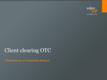 Client clearing OTC Warszawa, 17 czerwca 2014 r. Client clearing Skróty EB executing broker SWI System Wymiany Informacji w KDPW_CCP EMIR Rozporządzenie Parlamentu Europejskiego i Rady (UE) Nr 648/2012 z dnia 4 lipca 2012 r. w sprawie instrumentów pochodnych będących przedmiotem obrotu poza rynkiem regulowanym, kontrahentów centralnych i repozytoriów transakcji UNR uczestnik nierozliczający UR, uczestnik uczestnik rozliczający GRU grupowe GFS grupowe z pełną segregacją IND indywidualne IFS indywidualne z pełną segregacją KDPW Krajowy Depozyt Papierów Wartościowych S.A. KDPW_CCP KDPW_CCP S.A. NBP Narodowy Bank Polski NKK Numer Klasyfikacyjny Klienta Regulamin Regulamin Rozliczeń Transakcji (obrót niezorganizowany) 2 Client clearing Ramy umowne Uczestnik rozliczający Umowa ramowa Client clearing agreement Regulacje KDPW_CCP Klient Executing Broker/ UR Execution agreement 1. Regulacje KDPW_CCP obowiązujące między uczestnikiem rozliczającym/ executing brokerem a KDPW_CCP. 2. Umowa ramowa zawierana między uczestnikiem rozliczającym a klientem. 3. Umowa dot. centralnego rozliczania transakcji (Client clearing agreement) zawierana między uczestnikiem rozliczającym a klientem. 4. Umowa wykonawcza(Execution agreement) zawierana między executing brokerem a klientem. 3 Client clearing Regulacje KDPW_CCP Na podstawie Regulaminu Rozliczeń Transakcji (obrót niezorganizowany) uczestnik rozliczający, reprezentujący w systemie rozliczeń OTC inny podmiot zawierający transakcje (generalny uczestnik rozliczajacy), jest zobowiązany do: • dostarczenia oświadczenia wskazującego podmiot, który będzie reprezentować w systemie rozliczeń OTC w zakresie transakcji zawieranych przez ten podmiot, • zawarcia z tym podmiotem umowy, na podstawie której będzie stroną rozliczeń transakcji zawieranych przez ten podmiot oraz: zapewnienia w ww. umowie, aby raporty o transakcjach przekazywane do repozytorium transakcji lub innego podmiotu uprawnionego do gromadzenia i przechowywania informacji o transakcjach pochodnych, nie były przekazywane kilkakrotnie, w przypadku gdy obowiązek przekazywania tych raportów wynika z właściwych przepisów prawa, • dostarczenie oświadczenia podmiotu zawierającego transakcje reprezentowanego w systemie rozliczeń OTC przez UR, w którym podmiot ten: wyraża zgodę na wykonywanie przez danego uczestnika obowiązków wynikających z rozliczeń transakcji zawieranych przez ten podmiot, potwierdza, że został poinformowany o stosowaniu nowacji w zawieranych przez niego transakcjach oraz o publikowaniu na stronie internetowej KDPW_CCP informacji dotyczących stosowania nowacji w tych transakcjach, potwierdza, że wprowadzenie zawartej przez niego transakcji do systemu rozliczeń OTC oznacza uzgodnienie przez strony tej transakcji stosowania do nowacji właściwych przepisów prawa, które zostały wskazane przez KDPW_CCP zgodnie z Regulaminem, potwierdza, że został poinformowany o przekazywaniu przez KDPW_CCP raportów o zawieranych przez niego transakcjach do repozytorium transakcji, w przypadku gdy uczestnik wskazał KDPW_CCP jako podmiot, który przekazuje raporty o transakcjach do repozytorium transakcji oraz obowiązek przekazywania tych raportów do repozytorium transakcji wynika z właściwych przepisów prawa. Wzory oświadczeń zamieszczone są na stronie internetowej KDPW_CCP (Wzór nr 13) 4 Client clearing Struktura kont Struktura kont w KDPW_CCP Uczestnik rozliczający Klienci uczestnika rozliczającego UNR A Klient B UNR C i UNR D Klient E i Klient F Konto własne Konto IFS Konto IND Konto GFS Konto GRU Konto zabezpieczeń Konto zabezpieczeń Konto zabezpieczeń Konto zabezpieczeń Konto zabezpieczeń 5 Client clearing Struktura kont Konta rozliczeniowe Konta zabezpieczeń • Konta rozliczeniowe, służące do rejestracji transakcji, dzielą się na konta własne uczestników rozliczających oraz konta klientów. • Konto zabezpieczeń prowadzone jest dla każdego konta rozliczeniowego, przy czym jest ono wspólne dla wszystkich kont rozliczeniowych na poziomie NKK danego UR. • Konta własne uczestników rozliczających są kontami indywidualnymi (zapisywane są na nich wyłącznie pozycje UR). • KDPW_CCP oferuje następujące typy kont rozliczeniowych klientów: indywidualne (IND) w przypadku rozliczania transakcji klienta indywidualnego, z którym KDPW_CCP nie posiada relacji umownej, indywidualne z pełną segregacją (IFS) w przypadku rozliczania transakcji klienta indywidualnego, który zawarł z KDPW_CCP umowę o uczestnictwo w typie uczestnictwa – uczestnik nierozliczający (UNR), • Jeżeli klient danego uczestnika rozliczającego posiada więcej niż jedno indywidualne konto rozliczeniowe (IND lub IFS), depozyt zabezpieczający wyznaczany jest dla każdego konta oddzielnie, natomiast zabezpieczenia rejestrowane są na jednym koncie zabezpieczeń klienta. • Zabezpieczenie wniesione na dane konto zabezpieczeń klienta nie może służyć pokryciu wymogów z tytułu depozytów zabezpieczających wymaganych dla innego konta zabezpieczeń klienta lub UR. • Wymaganie z tytułu depozytów zabezpieczających wyznaczane jest na poziomie konta rozliczeniowego i agregowane na poziomie konta zabezpieczeń. grupowe (GRU) w przypadku rozliczania na jednym koncie transakcji wielu klientów, z którymi KDPW_CCP nie posiada relacji umownej, grupowe z pełną segregacją (GFS) w przypadku rozliczania na jednym koncie transakcji wielu klientów, którzy zawarli z KDPW_CCP umowy o uczestnictwo w typie uczestnictwa – uczestnik nierozliczający (UNR). Segregacja pozycji i zabezpieczeń zgodna z wymogami EMIR 6 Client clearing Struktura kont • Konta zabezpieczeń są prowadzone przez KDPW_CCP w ramach tzw. rejestru zabezpieczeń. Wnoszenie zabezpieczeń na konta zabezpieczeń następuje poprzez wniesienie odpowiedniej wpłaty na konto prowadzone dla rozliczeń KDPW_CCP przez KDPW w NBP w przypadku środków pieniężnych l