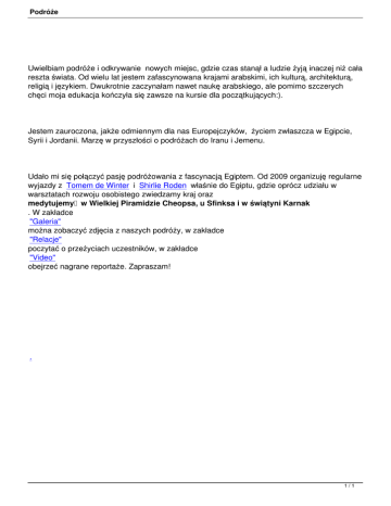 Podróże Uwielbiam podróże i odkrywanie nowych miejsc, gdzie czas stanął a ludzie żyją inaczej niż cała reszta świata. Od wielu lat jestem zafascynowana krajami arabskimi, ich kulturą, architekturą, religią i językiem. Dwukrotnie zaczynałam nawet naukę arabskiego, ale pomimo szczerych chęci moja edukacja kończyła się zawsze na kursie dla początkujących:). Jestem zauroczona, jakże odmiennym dla nas Europejczyków, życiem zwłaszcza w Egipcie, Syrii i Jordanii. Marzę w przyszłości o podróżach do Iranu i Jemenu. Udało mi się połączyć pasję podróżowania z fascynacją Egiptem. Od 2009 organizuję regularne wyjazdy z Tomem de Winter i Shirlie Roden właśnie do Egiptu, gdzie oprócz udziału w warsztatach rozwoju osobistego zwiedzamy kraj oraz medytujemy w Wielkiej Piramidzie Cheopsa, u Sfinksa i w świątyni Karnak . W zakładce "Galeria" można zobaczyć zdjęcia z naszych podróży, w zakładce "Relacje" poczytać o przeżyciach uczestników, w zakładce "Video" obejrzeć nagrane reportaże. Zapraszam! . 1/1
