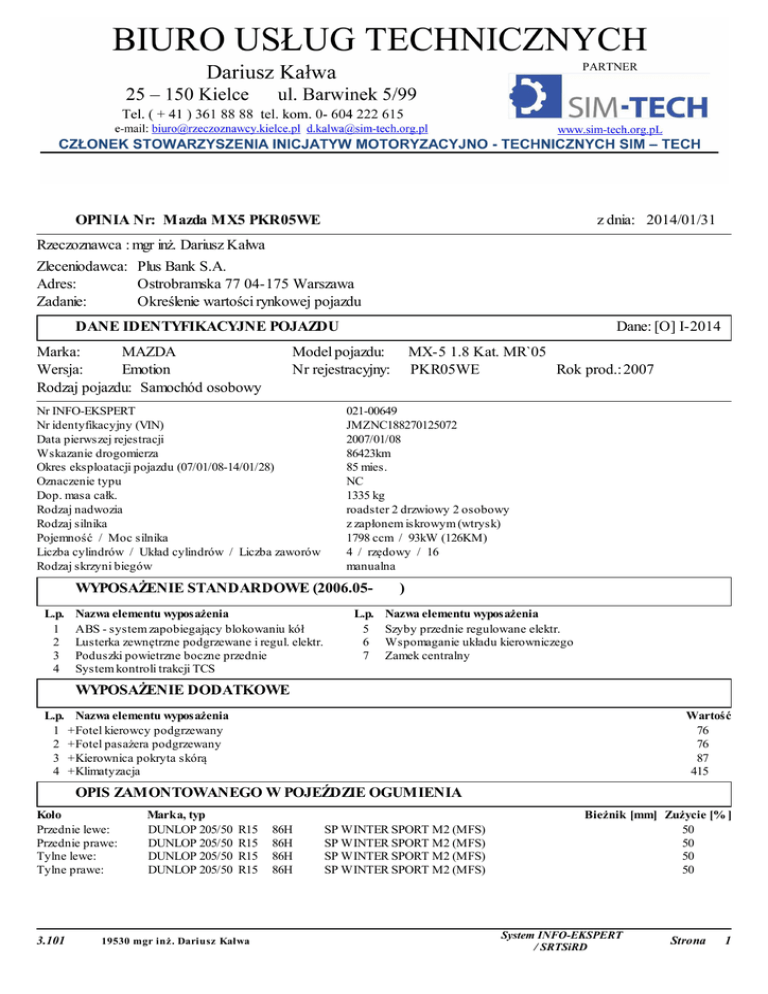 OPINIA Nr: Mazda MX5 PKR05WE z dnia: 2014/01/31 Rzeczoznawca : mgr inż. Dariusz Kałwa Zleceniodawca: Plus Bank S.A. Adres: Ostrobramska 77 04-175 Warszawa Zadanie: Określenie wartości rynkowej pojazdu DANE IDENTYFIKACYJNE POJAZDU Marka: MAZDA Wersja: Emotion Rodzaj pojazdu: Samochód osobowy Dane: [O] I-2014 Model pojazdu: Nr rejestracyjny: Nr INFO-EKSPERT Nr identyfikacyjny (VIN) Data pierwszej rejestracji Wskazanie drogomierza Okres eksploatacji pojazdu (07/01/08-14/01/28) Oznaczenie typu Dop. masa całk. Rodzaj nadwozia Rodzaj silnika Pojemność / Moc silnika Liczba cylindrów / Układ cylindrów / Liczba zaworów Rodzaj skrzyni biegów 021-00649 JMZNC188270125072 2007/01/08 86423km 85 mies. NC 1335 kg roadster 2 drzwiowy 2 osobowy z zapłonem iskrowym (wtrysk) 1798 ccm / 93kW (126KM) 4 / rzędowy / 16 manualna WYPOSAŻENIE STANDARDOWE (2006.05L.p. 1 2 3 4 Nazwa elementu wyposażenia ABS - system zapobiegający blokowaniu kół Lusterka zewnętrzne podgrzewane i regul. elektr. Poduszki powietrzne boczne przednie System kontroli trakcji TCS MX-5 1.8 Kat. MR`05 PKR05WE Rok prod.: 2007 L.p. 5 6 7 ) Nazwa elementu wyposażenia Szyby przednie regulowane elektr. Wspomaganie układu kierowniczego Zamek centralny WYPOSAŻENIE DODATKOWE L.p. Nazwa elementu wyposażenia 1 +Fotel kierowcy podgrzewany 2 +Fotel pasażera podgrzewany 3 +Kierownica pokryta skórą 4 +Klimatyzacja Wartość 76 76 87 415 OPIS ZAMONTOWANEGO W POJEŹDZIE OGUMIENIA Koło Przednie lewe: Przednie prawe: Tylne lewe: Tylne prawe: 3.101 Marka, typ DUNLOP 205/50 DUNLOP 205/50 DUNLOP 205/50 DUNLOP 205/50 R15 R15 R15 R15 19530 mgr inż. Dariusz Kałwa 86H 86H 86H 86H SP WINTER SPORT M2 (MFS) SP WINTER SPORT M2 (MFS) SP WINTER SPORT M2 (MFS) SP WINTER SPORT M2 (MFS) Bieżnik [mm] Zużycie [% ] 50 50 50 50 System INFO-EKSPERT / SRTSiRD Strona 1 Mazda MX5 PKR05WE STAN TECHNICZNY POJAZDU Podczas badania stwierdzono SILNIK: Silnik, rzędowy, z zapłonem iskrowym, usytuowany z przodu pojazdu. Po uruchomieniu widoczne duże skoki ciśnienia oleju. Przy zwiększaniu obrotów wału korbowego odgłosy pracy charakterystyczne dla zużytych łożysk ślizgowych. Wymaga gruntownego przeglądu i naprawy. PODWOZIE: Zawieszenie przednie zabudowane prawidłowo, bez uszkodzeń mechanicznych. Zawieszenie tylne zabudowane prawidłowo bez widocznych wad i usterek. Układ przeniesienia napędu zabudowany prawidłowo, bez uszkodzeń mechanicznych. Układ kierowniczy, działający na koła przednie, z niewielkimi luzami sumarycznymi na połączeniach przegubowych. Podwozie wymaga przeglądu. NADWOZIE: Nadwozie typu roadster sedan polakierowane na kolor bordowy. Widoczne ślady niedbałych napraw blacharsko lakierniczych. Podczas badania stwierdzono: uszkodzona powłoka lakierowa zderzaka przedniego, uszkodzenia błotnika przedniego lewego, brak nadkola przedniego lewego, skorodowany ( przerdzewiały na wskroś ) błotnik tylny lewy, skorodowany błotnik tylny prawy, uszkodzone lusterko wewnętrzne, uszkodzone i brudne poszycia siedzeń. Nadwozie wymaga gruntownego przeglądu naprawy połączonej z wymianą elementów. KONKLUZJA: Pojazd wymaga naprawy mającej wpływ na jego wartość rynkową. Samochód bez ważnych badań technicznych Wartość rynkowa pojazdu to najbardziej prawdopodobna kwota środków płatniczych, jaką należy zapłacić za określony pojazd na wolnym rynku w ramach wymiany towarowo-pieniężnej (kupna-sprzedaży) w warunkach konkurencji. KOREKTY WARTOŚĆ BAZOWA BRUTTO (80 mies.) ................................... KOREKTA ZA WYPOSAŻENIE DODATKOWE .............................. KOREKTA ZA PIERWSZĄ REJESTRACJĘ ................................... KOREKTY RÓŻNE ...................................................... W tym: [%] Wartość Stan utrzymania i dbałość o pojazd Aktualność badań technicznych Konieczne naprawy pojazdu Aktualna sytuacja rynkowa kraju Wady ukryte nie ujawnione podczas badani -5,0 -4,0 -30,0 -10,0 -5,0 30 750 PLN 654 PLN - 775 PLN - 16 538 PLN -1 531 -1 225 -9 189 -3 062 -1 531 KOMENTARZ Samochód wymaga usunięcia stwierdzonych i opisanych usterek. W związku ze zmianą sytuacji na rynku motoryzacyjnym związaną ze sprowadzeniem dużej liczby samochodów z krajów Unii Europejskiej wprowadzono korektę związaną z aktualną sytuacją rynkową. 3.101 19530 mgr inż. Dariusz Kałwa System INFO-EKSPERT / SRTSiRD Strona 2 Mazda MX5 PKR05WE Wartość rynkowa brutto wyżej zidentyfikowanego pojazdu, określona na dzień 28 stycznia 2014 roku wynosi: 14100 PLN (słownie: czternaście tysięcy sto złotych) w tym VAT (23,0%) 2636,59 PLN Wartość określono na podstawie: - notowań wartości rynkowych z katalogu 'Pojazdy Samochodowe - Wartości Rynkowe I-2014 ' zaakceptowanych przez wykonawcę opinii, - korekt mających wpływ na wartość pojazdu Wycenę sporządził: pieczęć 3.101 19530 mgr inż. Dariusz Kałwa ........................................... System INFO-EKSPERT / SRTSiRD Strona 3