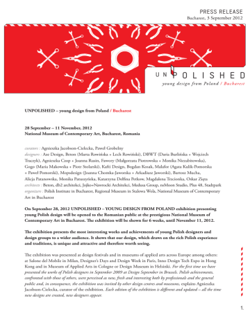 PRESS RELEASE Bucharest, 3 September 2012 UNPOLISHED – young design from Poland / Bucharest 28 September – 11 November, 2012 National Museum of Contemporary Art, Bucharest, Romania curators : Agnieszka Jacobson-Cielecka, Paweł Grobelny designers : Aze Design, Beton (Marta Rowińska + Lech Rowiński), DBWT (Daria Burlińska + Wojciech Traczyk), Agnieszka Czop + Joanna Rusin, Fawory (Małgorzata Piotrowska + Monika Niezabitowska), Gogo (Maria Makowska + Piotr Stolarski), Kafti Design, Bogdan Kosak, Malafor (Agata Kulik-Pomorska + Paweł Pomorski), Mopsdesign (Joanna Chomka-Jaworska + Arkadiusz Jaworski), Bartosz Mucha, Alicja Patanowska, Monika Patuszyńska, Katarzyna Delfina Petkow, Magdalena Trzcionka, Oskar Zięta architects : Beton, db2 architekci, Jojko+Nawrocki Architekci, Medusa Group, nsMoon Studio, Plus 48, Stadtpark organizers : Polish Institute in Bucharest, Regional Museum in Stalowa Wola, National Museum of Contemporary Art in Bucharest On September 28, 2012 UNPOLISHED – YOUNG DESIGN FROM POLAND exhibition presenting young Polish design will be opened to the Romanian public at the prestigious National Museum of Contemporary Art in Bucharest. The exhibition will be shown for 6 weeks, until November 11, 2012. The exhibition presents the most interesting works and achievements of young Polish designers and design groups to a wider audience. It shows that our design, which draws on the rich Polish experience and traditions, is unique and attractive and therefore worth seeing. The exhibition was presented at design festivals and in museums of applied arts across Europe among others: at Salone del Mobile in Milan, Designer’s Days and Design Week in Paris, Inno Design Tech Expo in Hong Kong and in Museum of Applied Arts in Cologne or Design Museum in Helsinki. For the first time we have presented the works of Polish designers in September 2009 at Design September in Brussels. Polish achievements, confronted with those of others, were perceived as new, fresh and interesting both by professionals and the general public and, in consequence, the exhibition was invited by other design centres and museums, explains Agnieszka Jacobson-Cielecka, curator of the exhibition. Each edition of the exhibition is different and updated – all the time new designs are created, new designers appear. 1. The “UNPOLISHED – YOUNG DESIGN FROM POLAND/BUCHAREST” exhibition is bigger than the previous editions. It will present 24 works designed by 17 Polish designers and design groups and 8 projects designed by young architects. The Romanian public will thus have the opportunity to see not only original and exciting projects by Polish designers, including works by well-known and oft-awarded designers like Oskar Zięta, Aze Design, Beton, glass and porcelain pieces by Magdalena Trzcionka, Bogdan Kosak and Monika Patuszyńska, “inflatable” sofas by Malafor or the unique carpets by the duet of Czop/Rusin, but also distinguished architectural objects designed by young Poles. The exhibition will be accompanied by lectures on the topic of contemporary Polish design and film screenings. Most of the designers and architects are in their thirties. According to the curators, it is the most interesting group of the Polish artists. Impeccably educated, they do not only design but also manufacture and promote their own works. Many of them have already earned reputation worldwide and successfully competed internationally, others are at the beginning of their carrier. When selecting works and designers for the exhibition we were looking for the most characteristic elements of Polish design, for the features which distinguish us from other artists, explains Agnieszka Jacobson-Cielecka. The process of creating and selecting materials is definitely very specific. The designers use materials which are easily available, inexpensive and natural: wood, osb and mdf, felt or recycled materials. They make their works themselves or with the help of local craftsmen. Most works are prototypes, unique objects or limited series. The same rule applies to architecture. We do not present multifunctional, complex buildings. On the contrary; most of them are simple private houses. Some of the designers are inspired by the Polish tradition, material culture or craft. Others are fascinated with material, texture and manufacturing technologies. All are interested in the process, concept, dialogue with the audience. Their works often balance on the edge of design and art, show a perverse sense of humor and distance to classical definitions of design. Such a non-commercial, conceptual and semi-artistic attitude to design allows the artists to „play with design”, invite to a discussion about what design is and what purpose it serves. Simplicity, interest in handicraft and the 3 x Re repeated as a mantra (Re-cycle, Re-use, Re-duce) comes natural to this group of designers. The architects’ propositions presented at the exhibition have, for the most part, yet to be realized, but are very close to thoughts of designers of utilitarian objects. Very important factors in these designs are ideas themselves, simple and natural materials which often come from the region a given piece is made, as well as the use of local craftsmen in their construction. All designs presented at the exhibition have a common denominator: they are simple, modest, they maintain the equilibrium between tradition and modernity, and aspire to harmony expressed in the „less is more” rule. The curators Agnieszka Jacobson-Cielecka, art director of the Łódź Design Festival in Poland and Paweł Grobelny, designer and curator of the design exhibitions are renowned experts and authorities in the field of Polish and world design. They regularly promote Polish design and applied arts in Poland and abroad, contributing to the development of this art discipline. The Polish Institute in Bucharest popularizes Polish culture and art in Romania by doing more than jus