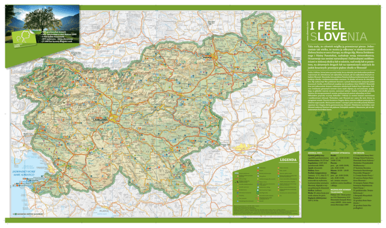 www.slovenia.info • 58% powierzchni leśnych • 36% terytorium w sieci Nature 2000 • 9.023 jaskiń krasowych • 20% wybrzeża – teren chroniony • 27.000 km łącznej długości rzek Taka mała, że człowiek mógłby ją przemierzyć pieszo. Jednocześnie tak wielka, że można ją odkrywać w nieskończoność. Zielona kraina w sercu Europy, na zbiegu Alp, Morza Śródziemnego i Niziny Panońskiej, zaskakuje swoją różnorodnością. Oczarowuje nas swoimi naturalnymi i kulturalnymi osobliwościami w zielonej okolicy lub w mieście, nad wodą lub w powietrzu, na aktywnych drogach lub na tajemniczych zejściach do jaskiń krasowych: przeżyjcie piękne chwile w Słowenii! Stolica Lublana, której tętno poczuje każdy, kto ją odwiedzi, jest doskonałym punktem wyjściowym do odwiedzenia tak najbardziej znanych, jak też najbardziej skrytych zakątków Słowenii. Słoweńska Istra przekona Państwa kulturą średniowiecznych miast, tradycją rybacką i śródziemnomorskim szarmem. Po drodze od morza do wierzchołków Alp zaekscytuje Was podziemie krasowe z ponad dziewięcioma tysiącami jaskiń krasowych i kotlin, wśród których znajduje się też jaskinia z listy UNESCO. Słoweński Kras jest jednocześnie domem rodzinnym szlachetnych białych koni Lipicanów. Podczas zwiedzania górzystych terenów nasze myśli odprężą się nad jeziorami, spoglądając na głębokie wąwozy rzeczne, natomiast zielone i skaliste wierzchołki powiodą Państwa do niezapomnianych wrażeń, podnoszących poziom adrenaliny we krwi. Miłośników przyrody oczaruje Solčavsko i Pohorje ze swoimi leśnymi rezerwatami i możliwościami rekreacji. Wschodnia część Słowenii jest rajem dla tych, którzy są spragnieni wrażeń. Kurorty lecznicze z bogatą ofertą centrów wellness postarają się o Państwa wypoczynek. Historyczne miasta i czarujące pola winorośli pozwolą Państwu zapoznać się z bogatą ofertą gastronomiczną Słowenii. Południowo-wschodnia część Słowenii zaskoczy Państwa tak pięknem Dolenjskih zamków i klasztorów, jak też niezmierzonym kočevskim lasem. Riga Dublin Cop penh hagen Vilnius Minsk London Amsterd d am Berlin Warsaw Brusssells Kiev Paris 2000 km Praguee 1000 km 500 km Vienna Bratislavaa Budapes e t Berr n Ch hisin i au 250 km Ljubljana Venicee Zagreb b Buchaarest Sarajevo o Lisbon Beoggrad Madrid Rome Sofia Pr istine Pod dgoricca Skopje Tiirana Ankara Ath hens LEGENDA Uzdrowisko Zakon, konwent Kasyno Pałac, zamek Granica państwowa Obiekty konferencyjne Muzeum, galeria sztuki Międzynarodowe przejście graniczne Pole golfowe Obszar przyrodniczy będący dziedzictwem narodowym Główna droga Jaskinia dostępna dla turystów Cenne stanowisko archeologiczne Kolejka turystyczna, zabytkowa kolej Region winnic Obiekt przemysłowy, kopalnia Lotnisko międzynarodowe EDEN - European Destination of Excellence Obiekt dziedzictwa kulturowego polecany turystom Lotnisko sportowe Kajakarstwo, rafting Miejsce cenne architektonicznie Kolejka linowa Park Narodowy Triglav Obszar dziedzictwa narodowego UNESCO Informacja turystyczna Park Regionalny Geometryczne centrum Słowenii Kamping Słoweńska ścieżka alpejska Zoo Port, przystań Długodystansowe szlaki europejskie E6, E7 Ośrodek sportów zimowych Kościół Słowenia, mapa turystyczna, 1 : 450 000 - 2009, 1 wydanie Wydawnictwo: Slovenska turisticna organizacija Projekt i redakcja: Primož Kete, prof. dr Branko Rojc. Obróbka kartograficzna, wydanie i przygotowanie do druku: Słoweński Instytut Geodezji, Jamova 2, Ljubljana, Słowenia Źródła: Mapa turystyczna Słowenii 1 : 500 000, (2008); dane: Słoweński Instytutu Geodezji i Słoweńska Organizacja Turystyczna. Wszystkie prawa zastrzeżone. Powielanie lub przeróbka mapy – cząściowo lub w całości bez zezwolenia Słoweńskiego Instytutu Geodezji jest zabronione. All rights reserved. Copying, duplicating or remaking the map in part or in whole is prohibited without approval of the Geodetic Institute of Slovenia. Listopad 2009 / Nakład: POL ***egzemplarzy / Redaktor: Nataša Hočevar / Projekt i tekst: AV Studio d.o.o. / Druk: Gorenjski tisk d.d. GENERAL INFO: System polityczny: republika parlamentarna Powierzchnia: 20.273 km² Population: 2.047.214 (październik 2009) Język: słoweński Waluta: Euro Średnie temperatury: January -2 °C, July 21 °C Klimat: Sub-śrudziemnomorski na wybrzeżu, kontynentalny wewnątrz Słowenii, Alpejski w wyżej położonych obszarach Stolica: Lublana Woda: W całym kraju jest woda zdatna do picia. Napięcie elektryczne: 220 V, 50 Hz GODZINY OTWARCIA: Banki: pon. – pt..: 8:30-12:30 i 14:00-17:00. Poczta: pon. - pt.: 8:00-18:00, sob.: 8:00-12:00. Muzea: 10.00 – 18.00 Sklepy: pon. - pt.: 8:00-19:00, sob.: 8:00-13:00, nd. i święta: otwarte niektóre centra handlowe i sklepy. DNI WOLNE: 1 i 2 stycznia Nowy Rok / 8 lutego Dzień Prešerena, Słoweński Dzień Kultury / Niedziela i Poniedziałek Wielkanocny / 27 kwietnia Rocznica Powstania Narodowego Przeciwko Okupacji / 1 i 2 maja Święto Pracy / 25 czerwca Święto Narodowe Słowenii / 15 sierpnia Święto Wniebowzięcia Najświętszej Marii Panny / WAŻNIEJSZE NUMERY 31 października Święto TELEFONÓW: Reformacji / Policja 113 / Straż pożar- 1 listopada Wszystkich na 112/ Ratownicy 112/ Świętych / Słoweński Związek Moto- 25 grudnia Boże Narorowy (AMZS - Avto-moto dzenie / zveza Slovenije) 1987 26 grudnia Dzień Niepodległości ODWIEDŹ SŁOWENIĘ EXPERIENCE SLOVENIA MOŻLIWOŚCI ZAKWATEROWANIA ZAPAMIĘTAJ SŁOWENIĘ Jakkolwiek by Państwo nie podróżowali, Słowenia jest krajem łatwo dostępnym. Jest po prostu blisko! Pobyt w Słowenii nie wymaga długiej i skomplikowanej organizacji. Logistykę podróży ułatwiają uregulowane drogi prowadzące do granic kraju i te wewnątrz państwa, jak też dostępność licznych informacji w internecie oraz możliwość komunikacji w wielu językach obcych. Słowenia to przeżycia na różnych płaszczyznach. Niez