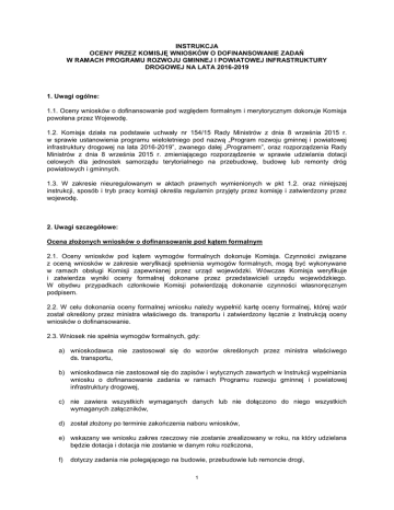 INSTRUKCJA OCENY PRZEZ KOMISJĘ WNIOSKÓW O DOFINANSOWANIE ZADAŃ W RAMACH PROGRAMU ROZWOJU GMINNEJ I POWIATOWEJ INFRASTRUKTURY DROGOWEJ NA LATA 2016-2019 1. Uwagi ogólne: 1.1. Oceny wniosków o dofinansowanie pod względem formalnym i merytorycznym dokonuje Komisja powołana przez Wojewodę. 1.2. Komisja działa na podstawie uchwały nr 154/15 Rady Ministrów z dnia 8 września 2015 r. w sprawie ustanowienia programu wieloletniego pod nazwą „Program rozwoju gminnej i powiatowej infrastruktury drogowej na lata 2016-2019”, zwanego dalej „Programem”, oraz rozporządzenia Rady Ministrów z dnia 8 września 2015 r. zmieniającego rozporządzenie w sprawie udzielania dotacji celowych dla jednostek samorządu terytorialnego na przebudowę, budowę lub remonty dróg powiatowych i gminnych. 1.3. W zakresie nieuregulowanym w aktach prawnych wymienionych w pkt 1.2. oraz niniejszej instrukcji, sposób i tryb pracy komisji określa regulamin przyjęty przez komisję i zatwierdzony przez wojewodę. 2. Uwagi szczegółowe: Ocena złożonych wniosków o dofinansowanie pod kątem formalnym 2.1. Oceny wniosków pod kątem wymogów formalnych dokonuje Komisja. Czynności związane z oceną wniosków w zakresie weryfikacji spełnienia wymogów formalnych, mogą być wykonywane w ramach obsługi Komisji zapewnianej przez urząd wojewódzki. Wówczas Komisja weryfikuje i zatwierdza wyniki oceny formalnej dokonane przez przedstawicieli urzędu wojewódzkiego. W obydwu przypadkach członkowie Komisji potwierdzają dokonanie czynności własnoręcznym podpisem. 2.2. W celu dokonania oceny formalnej wniosku należy wypełnić kartę oceny formalnej, której wzór został określony przez ministra właściwego ds. transportu i zatwierdzony łącznie z Instrukcją oceny wniosków o dofinansowanie. 2.3. Wniosek nie spełnia wymogów formalnych, gdy: a) wnioskodawca nie zastosował się do wzorów określonych przez ministra właściwego ds. transportu, b) wnioskodawca nie zastosował się do zapisów i wytycznych zawartych w Instrukcji wypełniania wniosku o dofinansowanie zadania w ramach Programu rozwoju gminnej i powiatowej infrastruktury drogowej, c) nie zawiera wszystkich wymaganych danych lub nie dołączono do niego wszystkich wymaganych załączników, d) został złożony po terminie zakończenia naboru wniosków, e) wskazany we wniosku zakres rzeczowy nie zostanie zrealizowany w roku, na który udzielana będzie dotacja i dotacja nie zostanie w danym roku rozliczona, f) dotyczy zadania nie polegającego na budowie, przebudowie lub remoncie drogi, 1 g) dotyczy zadania nieposiadającego zgody na odstępstwo od warunków technicznych określonych w rozporządzeniu Ministra Transportu i Gospodarki Morskiej z dnia 2 marca 1999 r. w sprawie warunków technicznych, jakim powinny odpowiadać drogi publiczne i ich usytuowanie (tekst jednolity Dz.U.2016 poz. 124), w przypadku gdy zgoda taka jest wymagana, h) dotyczy zadania obejmującego odcinek drogi niebędącej drogą publiczną zaliczoną do kategorii dróg powiatowych lub dróg gminnych, w rozumieniu ustawy z dnia 21 marca 1985 r. o drogach publicznych (Dz. U. z 2015 r. poz. 460) – wyjątek stanowi zadanie mające na celu osiągnięcie parametrów właściwych dla drogi publicznej i następnie zaliczenie jej do jednej z wymienionych kategorii, co zostało wskazane we wniosku, i) dotyczy zadania obejmującego odcinek drogi dla której wnioskodawca (w dniu złożenia wniosku o dofinansowanie) nie jest zarządcą, zgodnie z przepisami ustawy z dnia 21 marca 1985 r. o drogach publicznych (art. 19 ust. 2), j) dotyczy zadania złożonego przez dwóch wnioskodawców obejmującego swym zakresem dwa (lub więcej) odcinki dróg, dla których zarządcy są różni, k) deklarowany wkład własny obejmuje środki pochodzące z budżetu państwa lub budżetu Unii Europejskiej, l) wnioskowana dotacja przekracza maksymalną kwotę dotacji przewidzianą w uchwale, m) udział wnioskowanej dotacji w kosztach realizacji zadania przekracza maksymalny dopuszczalny udział przewidziany w uchwale, n) nie został podpisany przez osoby upoważnione z ramienia wnioskodawcy. 2.4. Komisja odrzuca wnioski niespełniające wymogów formalnych. 2.5. O powodach odrzucenia wniosku komisja niezwłocznie zawiadamia wnioskodawcę na piśmie. Wnioskodawcy nie przysługuje prawo odwołania. 2.6. Wnioskodawca przy sporządzaniu wniosku może opierać się jedynie na dokumentach umożliwiających rozpoczęcie inwestycji w planowanym terminie wskazanym we wniosku o dofinansowanie. 2.7. Dokumenty niewymienione we wniosku, nie mogą być doręczone i w tym przypadku niekompletny wniosek jest odrzucony na etapie oceny formalnej. 2.8. W przypadku dokumentów wymienionych we wniosku, które z różnorakich przyczyn nie zostały dostarczone razem z wnioskiem, Komisja każdorazowo wzywa do ich uzupełnienia, pod rygorem odrzucenia wniosku. Wniosek może być uzupełniony jedynie o dokumenty posiadające datę sprzed złożenia wniosku o dofinansowanie oraz wymienione w tym wniosku. 2.9. Komisja każdorazowo wzywa Wnioskodawcę do poprawienia błędów pisarskich, rachunkowych albo innych oczywistych omyłek w złożonym w terminie i kompletnym wniosku. Na dokonanie tych czynności Komisja wyznacza określony termin przy czym musi to nastąpić przed ustaleniem wstępnej listy rankingowej wniosków. 2 Ocena złożonych wniosków o dofinansowanie pod kątem merytorycznym 2.10. Ocenie merytorycznej podlegają wnioski, które pozytywnie przeszły ocenę formalną. 2.11. Każdy z członków Komisji indywidualnie dokonuje oceny wniosków o dofinansowanie w oparciu o kryteria merytoryczne określone w Programie przy pomocy karty oceny merytorycznej zatwierdzonej przez ministra właściwego ds. transportu W oparciu o tytuł zadania, Członkowie Komisji wybierają jedną z dwóch kart oceny merytorycznej w postaci arkusza kalkulacyjnego: a) „Karta oceny merytorycznej - R” – dla zadań określonych j