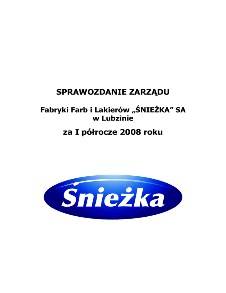 SPRAWOZDANIE ZARZĄDU Fabryki Farb i Lakierów „ŚNIEŻKA” SA w Lubzinie za I półrocze 2008 roku Fabryka Farb i Lakierów Śnieżka w Lubzinie SA 1. Wstęp do Sprawozdania Zarządu za 6 miesięcy 2008 roku Nazwa: Fabryka Farb i Lakierów „Śnieżka” SA Siedziba Zarządu Spółki: 39-102 Lubzina 34 a pow. ropczycko - sędziszowski woj. podkarpackie Rejestracja Spółki: Spółka została wpisana do rejestru przedsiębiorców KRS w dniu 12.11.2001 r. w Sądzie Rejonowym w Rzeszowie, w XII Wydziale Gospodarczym Krajowego Rejestru Sądowego pod numerem KRS 0000060537. Przedmiot działalności Spółki: Produkcja farb, lakierów, rozpuszczalników, klei, szpachli itp. Oddziały: 1. Lubzina 34 a 39-102 Lubzina pow. ropczycko – sędziszowski woj. podkarpackie 2. Brzeźnica 18 39-207 Brzeźnica pow. dębicki woj. podkarpackie 3. Pustków 604 39-205 Pustków pow. dębicki woj. Podkarpackie Kapitał Akcyjny: Na dzień 30 czerwca 2008r.: 13 850 000 zł - 13.850.000 akcji o wartości nominalnej 1 zł. W dniu 17 marca 2008r. Nadzwyczajne Walne Zgromadzenie Akcjonariuszy Fabryki Farb i Lakierów ŚNIEŻKA S.A. z siedzibą w Lubzinie na podstawie art. 362 par.1 pkt. 5 Kodeksu Spółek Handlowych oraz par. 10, ust. 1 pkt. 5 Statutu, podjęło Uchwałę w sprawie wyrażenia zgody dla Zarządu Spółki na nabycie akcji własnych w celu umorzenia. Nabycie akcji własnych emitenta i ich późniejsze umorzenie powinno przynieść akcjonariuszom wzrost wartości zainwestowanego przez nich kapitału oraz wzrost zysku przypadającego na jedną akcję. W związku z tym akcjonariusze będą mieli możliwość zrealizowania zysków kapitałowych. Sprawozdanie Zarządu za 6 miesięcy 2008 roku Strona 2 Fabryka Farb i Lakierów Śnieżka w Lubzinie SA Spółka nabędzie akcje własne na poniższych warunkach: a) łączna liczba nabywanych akcji nie przekroczy 10% wszystkich akcji Spółki tj. 1 385 000 akcji, b) akcje nabywane będą na Giełdzie Papierów Wartościowych w Warszawie oraz poza rynkiem regulowanym, c) wysokość środków przeznaczonych na realizację Skupu akcji własnych będzie nie większa niż 55 000 000 zł (słownie: pięćdziesiąt pięć milionów złotych), d) Zarząd jest upoważniony do realizacji Skupu akcji własnych przez okres 18 miesięcy od dnia podjęcia niniejszej uchwały, nie dłużej jednak niż do chwili wyczerpania środków przeznaczonych na realizację Skupu akcji własnych. Środki przeznaczone na realizację Skupu akcji własnych będą pochodzić ze środków własnych Spółki. Każdorazowe nabycie akcji własnych o wartości powyżej 100 000 zł wymaga wyrażenia zgody przez Radę Nadzorczą Spółki przy maksymalnie jednym głosie przeciwnym. Cena, za którą Spółka będzie nabywać własne akcje nie może być niższa od wartości nominalnej akcji oraz nie może być wartością wyższą spośród: - ceny ostatniego niezależnego obrotu, - najwyższej bieżącej niezależnej oferty w transakcjach zawieranych na sesjach giełdowych GPW. Od dnia 12 sierpnia 2008 roku planowane jest rozpoczęcie skupu akcji własnych w celu umorzenia. Realizacja skupu akcji własnych będzie się odbywać za pośrednictwem Domu Maklerskiego PKO BP S.A. Na podstawie art. 5 Rozporządzenia Komisji (WE) nr 2273/2003 z dnia 22 grudnia 2003 roku, ze względu na niską płynność akcji, emitent zamierza nabywać do 50% średniej dziennej wielkości obrotu akcjami, liczonego jako średnia z 20 dni poprzedzających dzień zakupu co oznacza, że może przekroczyć granicę 25% średniej dziennej wielkości obrotu. Reprezentacja Spółki: Rada Nadzorcza Stanisław Cymbor – Przewodniczący Jerzy Pater - Wiceprzewodniczący Jakub Bentke – Członek Zbigniew Łapiński - Członek Stanisław Mikrut – Członek Stanisław Wiatr – Sekretarz W I półroczu 2008 r. upłynęła IV kadencja Rady Nadzorczej. W dniu 19 czerwca 2008 roku Zwyczajne Walne Zgromadzeniu Akcjonariuszy FFiL Śnieżka S.A. dokonało wyboru członków Rady Nadzorczej na V kadencję. W skład Rady weszły osoby, które pełniły te funkcje w poprzedniej kadencji: Jerzy Pater, Stanisław Cymbor, Stanisław Mikrut, Stanisław Wiatr, Jakub Bentke, Zbigniew Łapiński. Panu Stanisławowi Cymbor została powierzona funkcja Przewodniczącego Rady Nadzorczej, Panu Jerzemu Pater funkcja Wiceprzewodniczącego Rady Nadzorczej, funkcję Sekretarza Rady pełni Pan Stanisław Wiatr. Zarząd: Piotr Mikrut - Prezes Zarządu od dnia 31 marca 2004 r. do dnia dzisiejszego. Witold Waśko - Wiceprezes Zarządu od dnia 1 kwietnia 2005 r. do dnia dzisiejszego . Sprawozdanie Zarządu za 6 miesięcy 2008 roku Strona 3 Fabryka Farb i Lakierów Śnieżka w Lubzinie SA Joanna Wróbel -Lipa - Członek Zarządu od dnia 18 grudnia 2007 r. do dnia dzisiejszego. Walentyna Ochab - Członek Zarządu od dnia 18 grudnia 2007 r. do dnia dzisiejszego. W I półroczu 2008 r. w składzie osobowym Zarządu nie wystąpiły zmiany. Zasady prezentacji sprawozdania finansowego zostały zawarte we wprowadzeniu do półrocznego sprawozdania finansowego i w notach objaśniających do półrocznego jednostkowego sprawozdania FFiL Śnieżka S.A. 2. Opis działalności Spółki w I półroczu 2008 roku W I półroczu br. ŚNIEŻKA odnotowała wzrost sprzedaży spowodowany wzrostem popytu rynku krajowego oraz wzrostem eksportu. Wartość sprzedaży na poziomie 205,8 mln zł oznacza dynamikę 108,1% w porównaniu do analogicznego okresu roku 2007. Główne wyniki w I półroczu 2008 roku Wyszczególnienie Wolumen sprzedaży produktów i towarów Jednostka 6 miesięcy 2008 6 miesięcy 2007 tys. litrów/kg 50 972 47 712 Przychody netto ze sprzedaży produktów, towarów, materiałów i usług Zysk operacyjny tys. zł 205 842 190 430 tys. zł 21 954 19 251 Zysk netto tys. zł 20 054 19 135 Najważniejsze działania i osiągnięcia Spółki w I półroczu 2008 roku oraz do dnia sporządzenia niniejszego sprawozdania: • Doskonalono struktury sprzedaży i procesy logisty