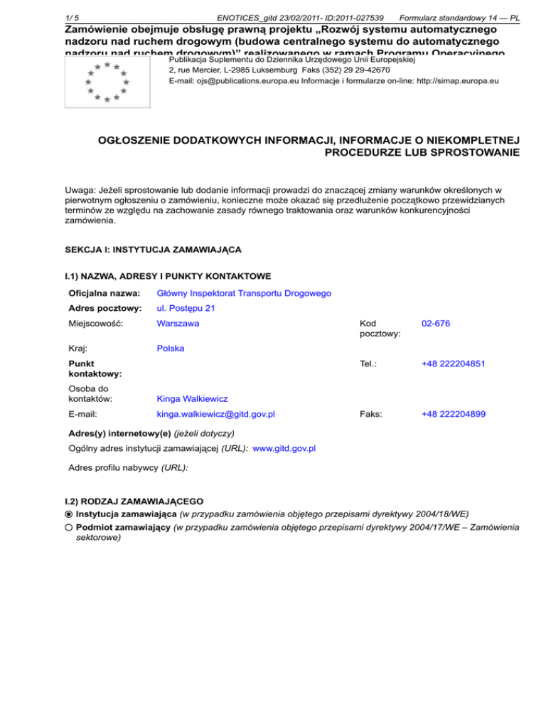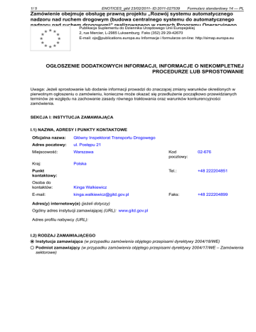1/ 5 ENOTICES_gitd 23/02/2011- ID:2011-027539 Formularz standardowy 14 — PL Zamówienie obejmuje obsługę prawną projektu „Rozwój systemu automatycznego nadzoru nad ruchem drogowym (budowa centralnego systemu do automatycznego nadzoru nad ruchem drogowym)” realizowanego w ramach Programu Operacyjnego Publikacja Suplementu do Dziennika Urzędowego Unii Europejskiej Infrastruktura i Środowisko, Priorytet VIII Bezpieczeństwo transportu i krajowe sieci 2, rue Mercier, L-2985 Luksemburg Faks (352) 29 29-42670 transportowe, Działanie Bezpieczeństwo ruchu drogowego E-mail:8.1 [email protected] Informacje i formularze on-line: http://simap.europa.eu OGŁOSZENIE DODATKOWYCH INFORMACJI, INFORMACJE O NIEKOMPLETNEJ PROCEDURZE LUB SPROSTOWANIE Uwaga: Jeżeli sprostowanie lub dodanie informacji prowadzi do znaczącej zmiany warunków określonych w pierwotnym ogłoszeniu o zamówieniu, konieczne może okazać się przedłużenie początkowo przewidzianych terminów ze względu na zachowanie zasady równego traktowania oraz warunków konkurencyjności zamówienia. SEKCJA I: INSTYTUCJA ZAMAWIAJĄCA I.1) NAZWA, ADRESY I PUNKTY KONTAKTOWE Oficjalna nazwa: Główny Inspektorat Transportu Drogowego Adres pocztowy: ul. Postępu 21 Miejscowość: Warszawa Kraj: Polska Punkt kontaktowy: Osoba do kontaktów: Kinga Walkiewicz E-mail: [email protected] Kod pocztowy: 02-676 Tel.: +48 222204851 Faks: +48 222204899 Adres(y) internetowy(e) (jeżeli dotyczy) Ogólny adres instytucji zamawiającej (URL): www.gitd.gov.pl Adres profilu nabywcy (URL): I.2) RODZAJ ZAMAWIAJĄCEGO Instytucja zamawiająca (w przypadku zamówienia objętego przepisami dyrektywy 2004/18/WE) Podmiot zamawiający (w przypadku zamówienia objętego przepisami dyrektywy 2004/17/WE – Zamówienia sektorowe) 2/ 5 ENOTICES_gitd 23/02/2011- ID:2011-027539 Formularz standardowy 14 — PL Zamówienie obejmuje obsługę prawną projektu „Rozwój systemu automatycznego nadzoru nad ruchem drogowym (budowa centralnego systemu do automatycznego nadzoru nad ruchem drogowym)” realizowanego w ramach Programu Operacyjnego SEKCJA II: PRZEDMIOT ZAMÓWIENIA Infrastruktura i Środowisko, Priorytet VIII Bezpieczeństwo transportu i krajowe sieci transportowe, Działanie 8.1 Bezpieczeństwo ruchu drogowego II.1) OPIS II.1.1) Nazwa nadana zamówieniu przez instytucję zamawiającą (podano w pierwotnym ogłoszeniu) Zamówienie obejmuje obsługę prawną projektu „Rozwój systemu automatycznego nadzoru nad ruchem drogowym (budowa centralnego systemu do automatycznego nadzoru nad ruchem drogowym)” realizowanego w ramach Programu Operacyjnego Infrastruktura i Środowisko, Priorytet VIII Bezpieczeństwo transportu i krajowe sieci transportowe, Działanie 8.1 Bezpieczeństwo ruchu drogowego II.1.2) Krôtki opis (podano w pierwotnym ogłoszeniu) Zamówienie obejmuje obsługę prawną projektu „Rozwój systemu automatycznego nadzoru nad ruchem drogowym (budowa centralnego systemu do automatycznego nadzoru nad ruchem drogowym)” realizowanego w ramach Programu Operacyjnego Infrastruktura i Środowisko, Priorytet VIII Bezpieczeństwo transportu i krajowe sieci transportowe, Działanie 8.1 Bezpieczeństwo ruchu drogowego II.1.3) Wspólny Słownik Zamówień (CPV) (podano w pierwotnym ogłoszeniu) Słownik główny Główny przedmiot 79140000 Słownik uzupełniający (jeżeli dotyczy) 3/ 5 ENOTICES_gitd 23/02/2011- ID:2011-027539 Formularz standardowy 14 — PL Zamówienie obejmuje obsługę prawną projektu „Rozwój systemu automatycznego nadzoru nad ruchem drogowym (budowa centralnego systemu do automatycznego nadzoru nad ruchem drogowym)” realizowanego w ramach Programu Operacyjnego SEKCJA IV: PROCEDURA Infrastruktura i Środowisko, Priorytet VIII Bezpieczeństwo transportu i krajowe sieci transportowe, Działanie 8.1 Bezpieczeństwo ruchu drogowego IV.1) RODZAJ PROCEDURY IV.1.1) Rodzaj procedury (podano w pierwotnym ogłoszeniu) Otwarta Ograniczona Ograniczona przyspieszona Negocjacyjna Negocjacyjna przyspieszona Dialog konkurencyjny IV.2) INFORMACJE ADMINISTRACYJNE IV.2.1) Numer referencyjny nadany sprawie przez instytucję zamawiającą /podmiot zamawiający (podano w pierwotnym ogłoszeniu, o ile dotyczy) BFK 23-11/11 IV.2.2) Dane referencyjne ogłoszenia w przypadku ogłoszeń przesłanych drogą elektroniczną (jeżeli są znane): Pierwotne ogłoszenie przesłane przez: SIMAP OJS eSender Login: ENOTICES_gitd Dane referencyjne ogłoszenia: 2011-025529 (rok i numer dokumentu) IV.2.3) Ogłoszenie, którego dotyczy niniejsza publikacja (jeżeli dotyczy) Numer ogłoszenia w Dz.U.: 2011/S 37-060623 z dnia 23/02/2011 IV.2.4) Data wysłania niniejszego ogłoszenia: 18/02/2011 (dd/mm/rrrr) (dd/mm/rrrr) 4/ 5 ENOTICES_gitd 23/02/2011- ID:2011-027539 Formularz standardowy 14 — PL Zamówienie obejmuje obsługę prawną projektu „Rozwój systemu automatycznego nadzoru nad ruchem drogowym (budowa centralnego systemu do automatycznego nadzoru nad ruchem drogowym)” realizowanego w ramach Programu Operacyjnego SEKCJA VI: INFORMACJE UZUPEŁNIAJĄCE Infrastruktura i Środowisko, Priorytet VIII Bezpieczeństwo transportu i krajowe sieci transportowe, Działanie 8.1 Bezpieczeństwo ruchu drogowego VI.1) OGŁOSZENIE DOTYCZY (o ile ma zastosowanie; zaznaczyć tyle punktów, ile jest to konieczne) Procedury niepełnej Sprostowania Informacji dodatkowych VI.2) INFORMACJE NA TEMAT NIEPEŁNEJ PROCEDURY UDZIELENIA ZAMÓWIENIA (o ile ma zastosowanie; zaznaczyć tyle punktów, ile jest to konieczne) Postępowanie o udzielenie zamówienia została przerwane. Postępowanie o udzielenie zamówienia uznano za nieskuteczne. Zamówienia nie udzielono. Zamówienie może być przedmiotem ponownej publikacji. VI.3) INFORMACJE DO POPRAWIENIA LUB DODANIA (o ile dotyczy; należy określić miejsce, w którym tekst lub daty mają być zmienione lub dodane, proszę zawsze podawać odpowiedni numer sekcji i akapitu pierwotnego ogłoszenia) VI.3.1) Zmiana oryginalnej informacji lub p