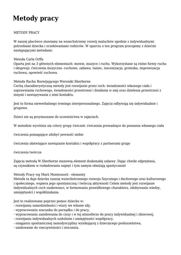 Metody pracy METODY PRACY W naszej placówce stawiamy na wszechstronny rozwój maluchów zgodnie z indywidualnymi potrzebami dziecka i oczekiwaniami rodziców. W oparciu o ten program pracujemy z dziećmi następującymi metodami: Metoda Carla Orffa Oparta jest na 3 głównych elementach: mowie, muzyce i ruchu. Wykorzystane są różne formy ruchu i ekspresji: ćwiczenia muzyczno -ruchowe, zabawa, taniec, inscenizacja, groteska, improwizacja ruchowa, opowieść ruchowa. Metoda Ruchu Rozwijającego Weroniki Sherborne Cechą charakterystyczną metody jest rozwijanie przez ruch: świadomości własnego ciała i usprawniania ruchowego, świadomości przestrzeni i działania w niej oraz dzielenia przestrzeni z innymi i nawiązywania z nimi kontaktu. Jest to forma niewerbalnego treningu interpersonalnego. Zajęcia odbywają się indywidualnie i grupowo. Dzieci nie są przymuszane do uczestnictwa w zajęciach. W metodzie wyróżnia się cztery grupy ćwiczeń: ćwiczenia prowadzące do poznania własnego ciała ćwiczenia pomagające zdobyć pewność siebie ćwiczenia ułatwiające nawiązanie kontaktu i współpracy z partnerami grupy ćwiczenia twórcze Zajęcia metodą W.Sherborne stanowią element doskonałej zabawy. Dając chwile odprężenia, są czynnikiem w rozładowaniu napięć i tym samym obniżają spastyczność Metody Pracy wg Marii Montessorii - elementy Metoda ta daje dziecku szansę wszechstronnego rozwoju fizycznego i duchowego oraz kulturowego i społecznego, wspiera jego spontaniczną i twórczą aktywność Celem metody jest rozwijanie indywidualnych cech osobowooci, w formowaniu prawidłowego charakteru, zdobywaniu wiedzy, umiejętności i współdziałania. Jest to realizowane poprzez pomoc dziecku w: - rozwijaniu samodzielności i wiary we własne siły, - wypracowaniu szacunku do porządku i do pracy, - wypracowaniu zamiłowania do ciszy i w tej atmosferze do pracy indywidualnej i zbiorowej, - rozwijaniu indywidualnych uzdolnien i umiejętności współpracy, - osiąganiu spontanicznej samodyscypliny wynikającej z dziecięcego posłuszeństwa, - umiłowanie do rzeczywistości i otoczenia. ZAKRES PROGRAMOWY Zajęcia i zabawy dostosowane są do wieku i możliwości rozwojowych dzieci, prowadzone są indywidualnie i w grupie. Realizowane w oparciu o szeroką gamę Metod Pedagogicznych I. Doskonalenie ogólnej sprawności fizycznej dziecka, kształtowanie wrażliwości słuchowej, zapobieganie płaskostopiu ZABAWY RUCHOWE Ćwiczenia ogólnorozwojowe Ćwiczenia ruchowo-naśladowcze Zabawy ruchowe ze śpiewem Ćwiczenia orientacyjno - przestrzenne II. Kształtowanie wyobraźni, spostrzeżeń, myślenia, nauka zwrotów grzecznościowych czynności higienicznych wykonywanych w życiu codziennym ZABAWY TEMATYCZNE Zabawy w kąciku kuchennym Zabawy w kąciku lalek Zabawy w kąciku sklepowym Czynność z zakresu dnia codziennego III. Rozwój procesów poznawczych, mowy, pamięci, uwagi, myślenia, wyobraźni, spostrzeżeń; kształtowanie wrażliwości słuchowej ZABAWY EDUKACYJNE Opowiadanie bajek Oglądanie ilustracji Śpiewanie piosenek - zabawy umuzykalniające IV. Kształtowanie koordynacji wzrokowo-ruchowej,kształtowanie wyobraźni, myślenia i spostrzeżeń; kształtowanie sprawności manualnej ZABAWY MANIPULACYJNO-KONSTRUKCYJNE Budowa z klocków Nakładanie kółek na piramidę Zawiązywanie ramek Składanie serwet