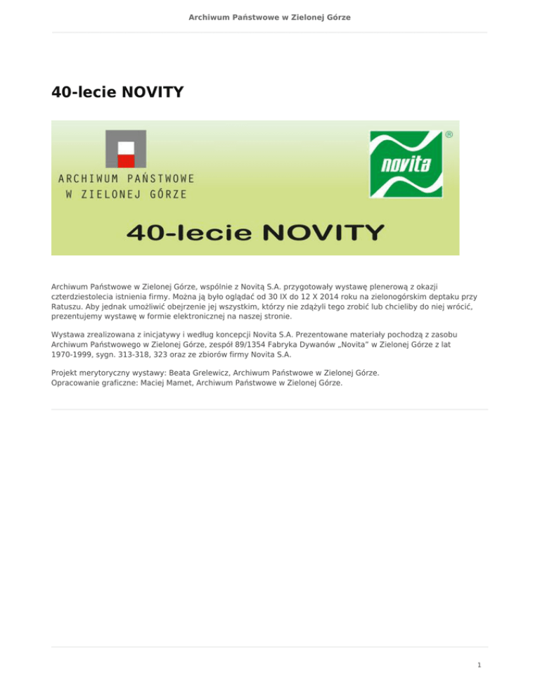 Archiwum Państwowe w Zielonej Górze 40-lecie NOVITY Archiwum Państwowe w Zielonej Górze, wspólnie z Novitą S.A. przygotowały wystawę plenerową z okazji czterdziestolecia istnienia firmy. Można ją było oglądać od 30 IX do 12 X 2014 roku na zielonogórskim deptaku przy Ratuszu. Aby jednak umożliwić obejrzenie jej wszystkim, którzy nie zdążyli tego zrobić lub chcieliby do niej wrócić, prezentujemy wystawę w formie elektronicznej na naszej stronie. Wystawa zrealizowana z inicjatywy i według koncepcji Novita S.A. Prezentowane materiały pochodzą z zasobu Archiwum Państwowego w Zielonej Górze, zespół 89/1354 Fabryka Dywanów „Novita” w Zielonej Górze z lat 1970-1999, sygn. 313-318, 323 oraz ze zbiorów firmy Novita S.A. Projekt merytoryczny wystawy: Beata Grelewicz, Archiwum Państwowe w Zielonej Górze. Opracowanie graficzne: Maciej Mamet, Archiwum Państwowe w Zielonej Górze. 1