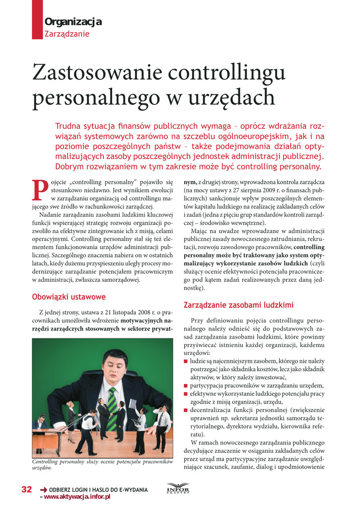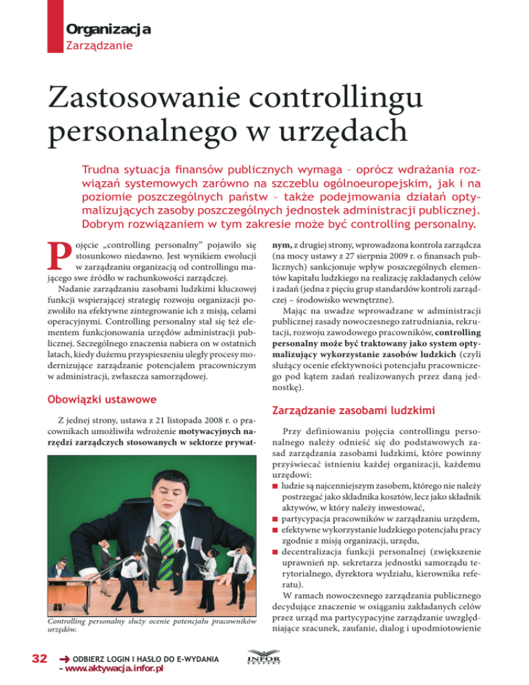 Organizacja ����������� Zastosowanie controllingu personalnego w urzędach P ������������������������������������������������������������������������������������������������������������������������������������ ��������� ��������������� ������� �� ������ ������������� �������� ��������������������������������������������������������������������������� ������������������������������������������������������������������� ojęcie „controlling personalny” pojawiło się stosunkowo niedawno. Jest wynikiem ewolucji w zarządzaniu organizacją od controllingu mającego swe źródło w rachunkowości zarządczej. Nadanie zarządzaniu zasobami ludzkimi kluczowej funkcji wspierającej strategię rozwoju organizacji pozwoliło na efektywne zintegrowanie ich z misją, celami operacyjnymi. Controlling personalny stał się też elementem funkcjonowania urzędów administracji publicznej. Szczególnego znaczenia nabiera on w ostatnich latach, kiedy dużemu przyspieszeniu uległy procesy modernizujące zarządzanie potencjałem pracowniczym w administracji, zwłaszcza samorządowej. ������������������ Z jednej strony, ustawa z 21 listopada 2008 r. o pracownikach umożliwiła wdrożenie motywacyjnych narzędzi zarządczych stosowanych w sektorze prywat- Controlling personalny służy ocenie potencjału pracowników urzędów. 32 ������������������������������������� – www.aktywacja.infor.pl nym, z drugiej strony, wprowadzona kontrola zarządcza (na mocy ustawy z 27 sierpnia 2009 r. o finansach publicznych) sankcjonuje wpływ poszczególnych elementów kapitału ludzkiego na realizację zakładanych celów i zadań (jedna z pięciu grup standardów kontroli zarządczej – środowisko wewnętrzne). Mając na uwadze wprowadzane w administracji publicznej zasady nowoczesnego zatrudniania, rekrutacji, rozwoju zawodowego pracowników, controlling personalny może być traktowany jako system optymalizujący wykorzystanie zasobów ludzkich (czyli służący ocenie efektywności potencjału pracowniczego pod kątem zadań realizowanych przez daną jednostkę). ����������������������������� Przy definiowaniu pojęcia controllingu personalnego należy odnieść się do podstawowych zasad zarządzania zasobami ludzkimi, które powinny przyświecać istnieniu każdej organizacji, każdemu urzędowi: � ludzie są najcenniejszym zasobem, którego nie należy postrzegać jako składnika kosztów, lecz jako składnik aktywów, w który należy inwestować, � partycypacja pracowników w zarządzaniu urzędem, � efektywne wykorzystanie ludzkiego potencjału pracy zgodnie z misją organizacji, urzędu, � decentralizacja funkcji personalnej (zwiększenie uprawnień np. sekretarza jednostki samorządu terytorialnego, dyrektora wydziału, kierownika referatu). W ramach nowoczesnego zarządzania publicznego decydujące znaczenie w osiąganiu zakładanych celów przez urząd ma partycypacyjne zarządzanie uwzględniające szacunek, zaufanie, dialog i upodmiotowienie Organizacja pracowników. Umiejętność kierowników (liderów) i pracowników aktywnej współpracy, likwidacji barier, na rzecz tworzenia warunków i zachęt do innowacyjności, doskonalenia organizacyjnego, także poprzez osobisty przykład, powinna być podstawą. Uwzględniając definicję controllingu oraz wymienione aspekty zarządzania zasobami ludzkimi, controlling personalny można uznać za wewnętrzny system sterowania osiąganiem celów w poszczególnych obszarach zarządzania zasobami ludzkimi zharmonizowanych z celami strategicznymi jednostki samorządu terytorialnego czy urzędu. W organizacjach stosujących controlling personalny traktowany jest on jako instrument oceniający efektywność inwestowania w kapitał ludzki, który poprzez koordynację planowania i kontroli może przyczynić się do ograniczenia przypadkowości działań w sferze zarządzania zasobami ludzkimi. Obejmuje on planowanie i kontrolę efektów oraz kosztów pracy, stanowiąc system wczesnego ostrzegania przez zabezpieczenie w odpowiednim czasie niezbędnej informacji personalnej. ���������������������������������� Na rynku polskim dostępne są narzędzia informatyczne umożliwiające przeprowadzenie działań w zakresie controllingu personalnego. Dotyczą one takich obszarów zarządzania zasobami ludzkimi, jak m.in.: 1) stosowane strategie personalne, 2) szczegółowe procedury personalne, 3) kadry – zakres administracyjny, 4) nakłady na wynagrodzenie pracowników (system motywacyjny), 5) nakłady w rozwój zawodowy pracowników, 6) bezpieczeństwo pracy, 7) rachunkowość kapitału ludzkiego. Nieodzowne w controllingu personalnym jest posiadanie takich instrumentów, jak: zestaw wskaźników ilościowych, źródła uzyskiwania informacji, określone obszary sterowania, lista pytań kontrolnych, a także odpowiednie rozwiązania organizacyjne. Jeśli się je odniesie do urzędów, dużego znaczenia nabierają dokonywane już w coraz większej ilości jednostek analizy inwestowania w kapitał ludzki. ����������������