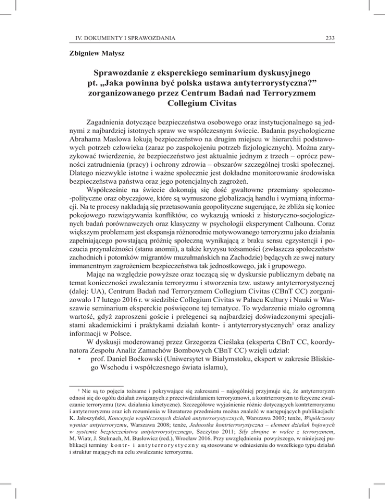 IV. DOKUMENTY I SPRAWOZDANIA 233 Zbigniew Małysz Sprawozdanie z eksperckiego seminarium dyskusyjnego pt. „Jaka powinna być polska ustawa antyterrorystyczna?” zorganizowanego przez Centrum Badań nad Terroryzmem Collegium Civitas Zagadnienia dotyczące bezpieczeństwa osobowego oraz instytucjonalnego są jednymi z najbardziej istotnych spraw we współczesnym świecie. Badania psychologiczne Abrahama Maslowa lokują bezpieczeństwo na drugim miejscu w hierarchii podstawowych potrzeb człowieka (zaraz po zaspokojeniu potrzeb fizjologicznych). Można zaryzykować twierdzenie, że bezpieczeństwo jest aktualnie jednym z trzech – oprócz pewności zatrudnienia (pracy) i ochrony zdrowia – obszarów szczególnej troski społecznej. Dlatego niezwykle istotne i ważne społecznie jest dokładne monitorowanie środowiska bezpieczeństwa państwa oraz jego potencjalnych zagrożeń. Współcześnie na świecie dokonują się dość gwałtowne przemiany społeczno-polityczne oraz obyczajowe, które są wymuszone globalizacją handlu i wymianą informacji. Na te procesy nakładają się przetasowania geopolityczne sugerujące, że zbliża się koniec pokojowego rozwiązywania konfliktów, co wykazują wnioski z historyczno-socjologicznych badań porównawczych oraz klasyczny w psychologii eksperyment Calhouna. Coraz większym problemem jest ekspansja różnorodnie motywowanego terroryzmu jako działania zapełniającego powstającą próżnię społeczną wynikającą z braku sensu egzystencji i poczucia przynależności (stanu anomii), a także kryzysu tożsamości (zwłaszcza społeczeństw zachodnich i potomków migrantów muzułmańskich na Zachodzie) będących ze swej natury immanentnym zagrożeniem bezpieczeństwa tak jednostkowego, jak i grupowego. Mając na względzie powyższe oraz toczącą się w dyskursie publicznym debatę na temat konieczności zwalczania terroryzmu i stworzenia tzw. ustawy antyterrorystycznej (dalej: UA), Centrum Badań nad Terroryzmem Collegium Civitas (CBnT CC) zorganizowało 17 lutego 2016 r. w siedzibie Collegium Civitas w Pałacu Kultury i Nauki w Warszawie seminarium eksperckie poświęcone tej tematyce. To wydarzenie miało ogromną wartość, gdyż zaproszeni goście i prelegenci są najbardziej doświadczonymi specjalistami akademickimi i praktykami działań kontr- i antyterrorystycznych1 oraz analizy informacji w Polsce. W dyskusji moderowanej przez Grzegorza Cieślaka (eksperta CBnT CC, koordynatora Zespołu Analiz Zamachów Bombowych CBnT CC) wzięli udział: • prof. Daniel Boćkowski (Uniwersytet w Białymstoku, ekspert w zakresie Bliskiego Wschodu i współczesnego świata islamu), 1 Nie są to pojęcia tożsame i pokrywające się zakresami – najogólniej przyjmuje się, że antyterroryzm odnosi się do ogółu działań związanych z przeciwdziałaniem terroryzmowi, a kontrterroryzm to fizyczne zwalczanie terroryzmu (tzw. działania kinetyczne). Szczegółowe wyjaśnienie różnic dotyczących kontrterroryzmu i antyterroryzmu oraz ich rozumienia w literaturze przedmiotu można znaleźć w następujących publikacjach: K. Jałoszyński, Koncepcja współczesnych działań antyterrorystycznych, Warszawa 2003; tenże, Współczesny wymiar antyterroryzmu, Warszawa 2008; tenże, Jednostka kontrterrorystyczna – element działań bojowych w systemie bezpieczeństwa antyterrorystycznego, Szczytno 2011; Siły zbrojne w walce z terroryzmem, M. Wiatr, J. Stelmach, M. Busłowicz (red.), Wrocław 2016. Przy uwzględnieniu powyższego, w niniejszej publikacji terminy k o n t r - i a n t y t e r r o r y s t y c z n y są stosowane w odniesieniu do wszelkiego typu działań i struktur mających na celu zwalczanie terroryzmu. 234 • PRZEGLĄD BEZPIECZEŃSTWA WEWNĘTRZNEGO 15/16 prof. Kuba Jałoszyński (Wyższa Szkoła Policji w Szczytnie, były dowódca warszawskiego pododdziału antyterrorystycznego, twórca centralnej jednostki antyterrorystycznej Policji), • Piotr Niemczyk (Niemczyk i Wspólnicy, były zastępca dyrektora Zarządu Wywiadu UOP oraz ekspert Sejmowej Komisji ds. Służb Specjalnych), • dr Witold Sokała (Uniwersytet Jana Kochanowskiego w Kielcach, ekspert w zakresie wyzwań i zagrożeń asymetrycznych oraz roli służb specjalnych i mediów w polityce bezpieczeństwa). Wstęp do spotkania stanowiło wystąpienie dr. Krzysztofa Liedela (dyrektora CBnT CC), podczas którego szczegółowo i ciekawie omówił on rozwój polskiego systemu antyterrorystycznego i jego podstawy prawne. Następnie głos zabrał Grzegorz Cieślak, zwracając uwagę na konieczność szybkiego uchwalenia dobrze napisanej i merytorycznie przygotowanej przez ekspertów UA. Podkreślił, że można mieć wątpliwości co do jej formy i efektywności, co wynika ze specyfiki terroryzmu jako zjawiska wyjątkowo łatwo adaptującego się do zmieniających się warunków i niepoddającego się kategoryzacji. Wskazał, że współcześnie sam sposób walki z terroryzmem ulega zmianie i zyskuje charakter proaktywny, ofensywny, wielopłaszczyznowy (w większości krajów) i wielopodmiotowy (podkreślił także dominującą rolę Agencji Bezpieczeństwa Wewnętrznego w zwalczaniu terroryzmu w Polsce i przeciwdziałaniu temu zjawisku). Zagrożenie terroryzmem nieuchronnie wytwarza potrzebę ściślejszej współpracy i koordynacji poszczególnych struktur kontr- i antyterrorystycznych, a w dalszej kolejności – ich „usieciowienia”. Na zakończenie swojej wypowiedzi moderator wskazał, że w kontekście niniejszego seminarium jego główne pytanie brzmi: Jaka powinna być polska ustawa antyterrorystyczna, tak aby zaspokoić oczekiwania tych, którzy będą jej podmiotami? Profesor Jałoszyński stwierdził, że na podstawie informacji medialnych oczekiwał, iż przedmiotem seminarium będzie dyskusja nad treścią powstającej UA i tym, co jeszcze można w niej udoskonalić. Niestety, jak dotychczas taki akt prawny nie powstał. Według niego UA powinna mieć charakt